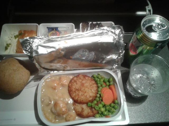 Swiss Airlines is (not even mildly) disappointing. I can't remember what it quite was but I believe it was chicken/mushroom sauce, with the hash browns and the veggies. The dessert was some kind of cake with "ice cream" which turned out to be something more like whipped cream.