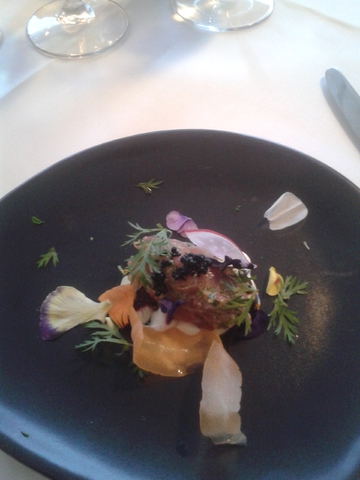 The first mini entree was tuna with beetroot, creme fraiche and caviar, tasted very interesting. Proper entree was a grilled squid argula salad wrapped in parma ham.