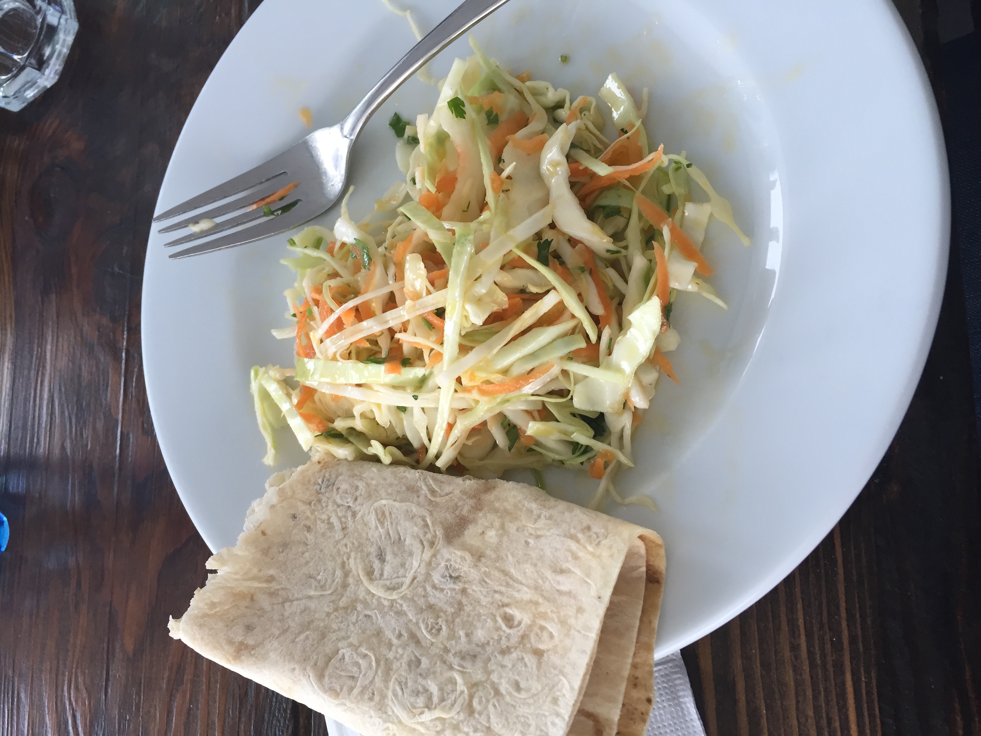 A delicious and juicy salad. Cabbage and carrot with a yummy dressing. And some Armenian bread.
