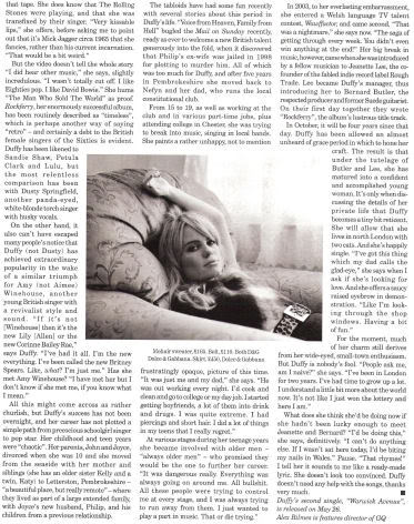 As of July 2008 Duffy has been constantly writing material for a second album, compiling "loads of books" of song ideas. Duffy said that she will not constantly reinvent herself for each album.[81] Fellow Welsh singer Tom Jones has expressed an interest in singing with her.[82] Duffy with several other artists are working on the soundtrack to an upcoming independent film about the British northern soul scene of the early 1970s entitled Souled Out.[83]
