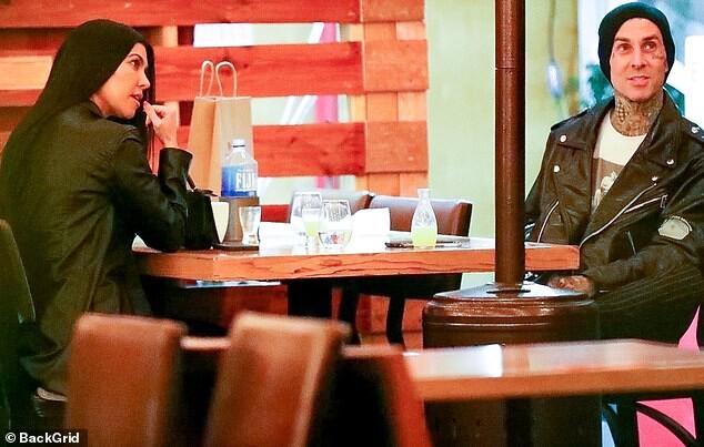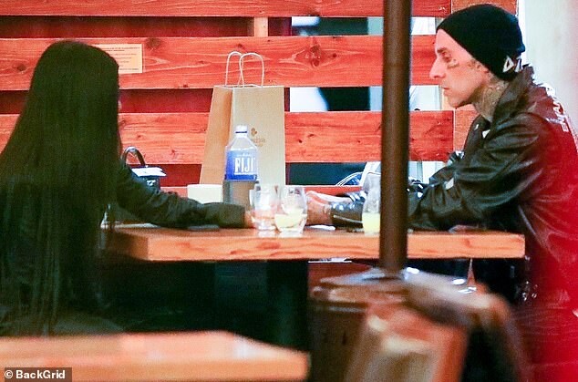 Kourtney Kardashian and new beau Travis Barker hold hands across the table as they enjoy a flirty outdoor dinner date in LA