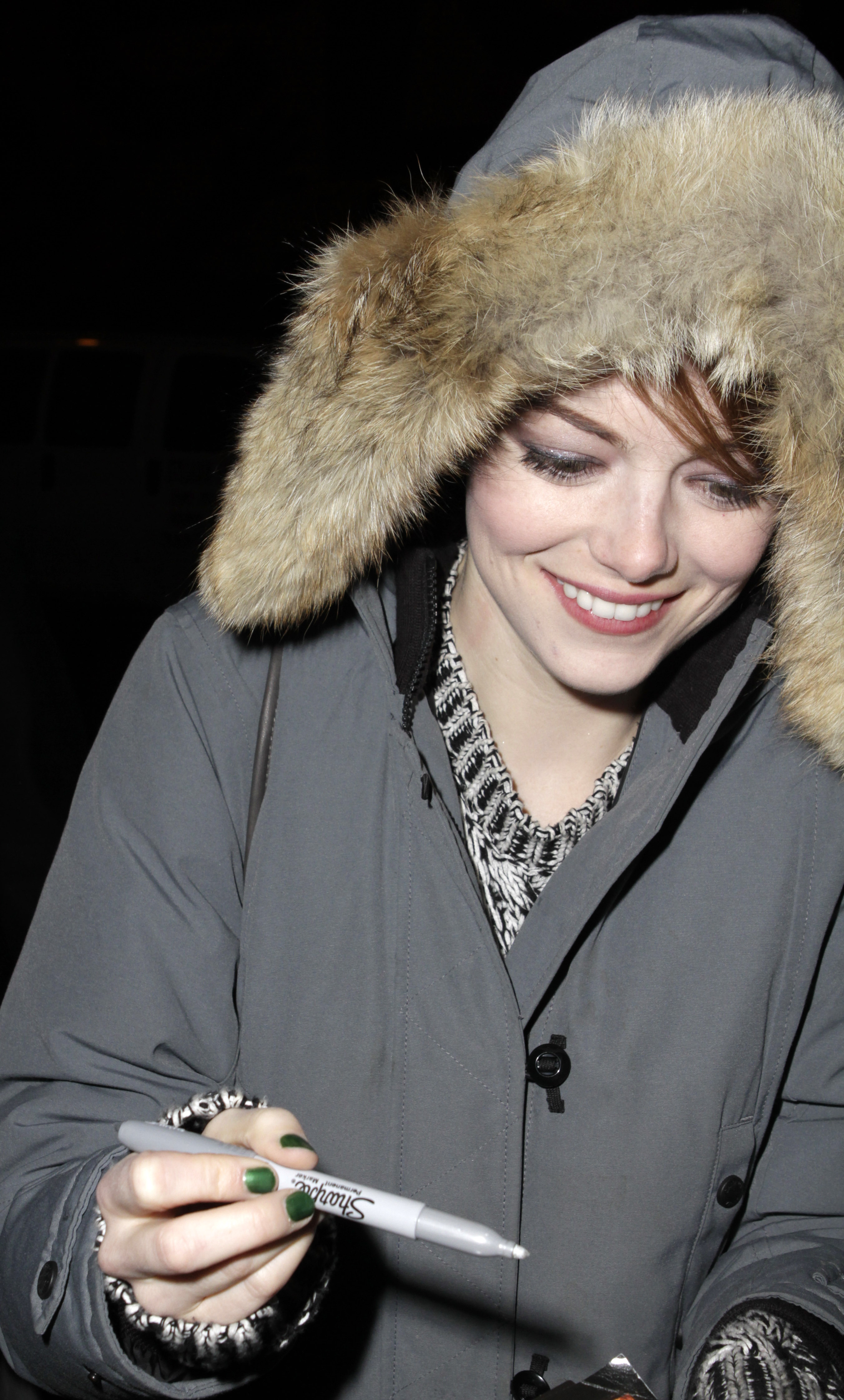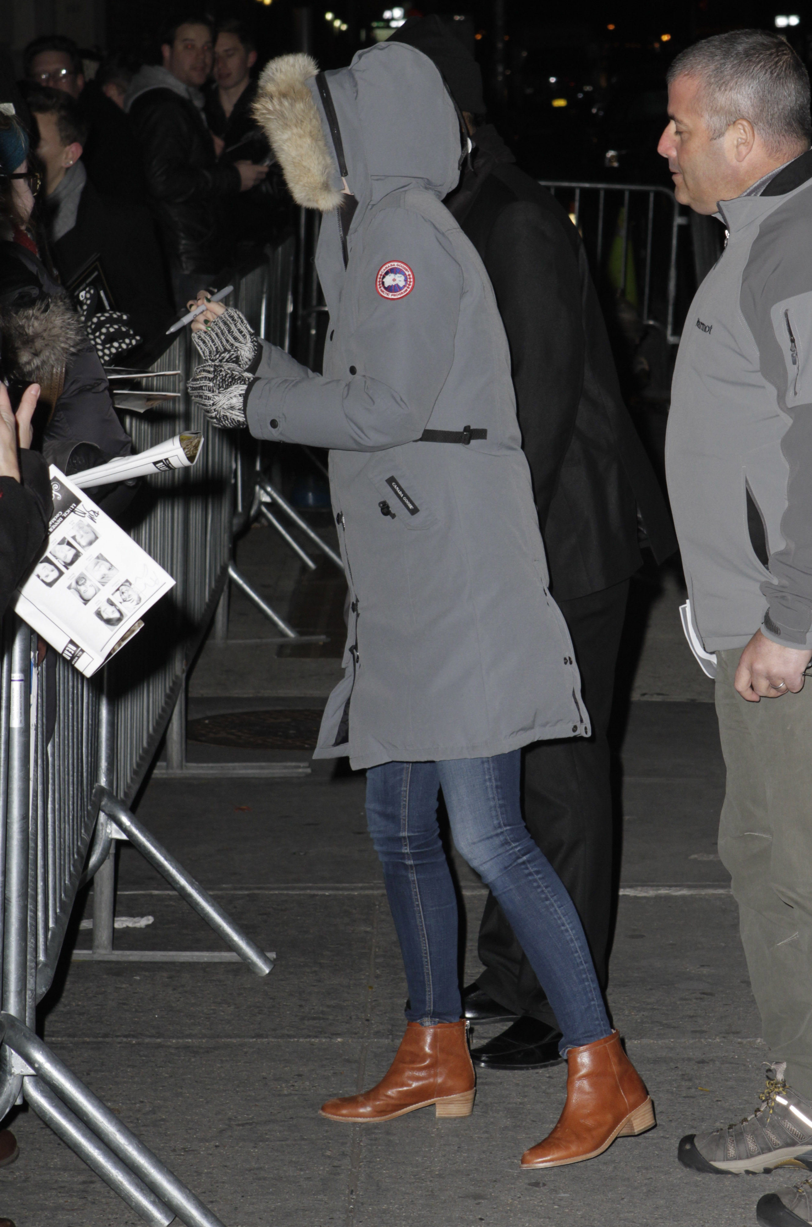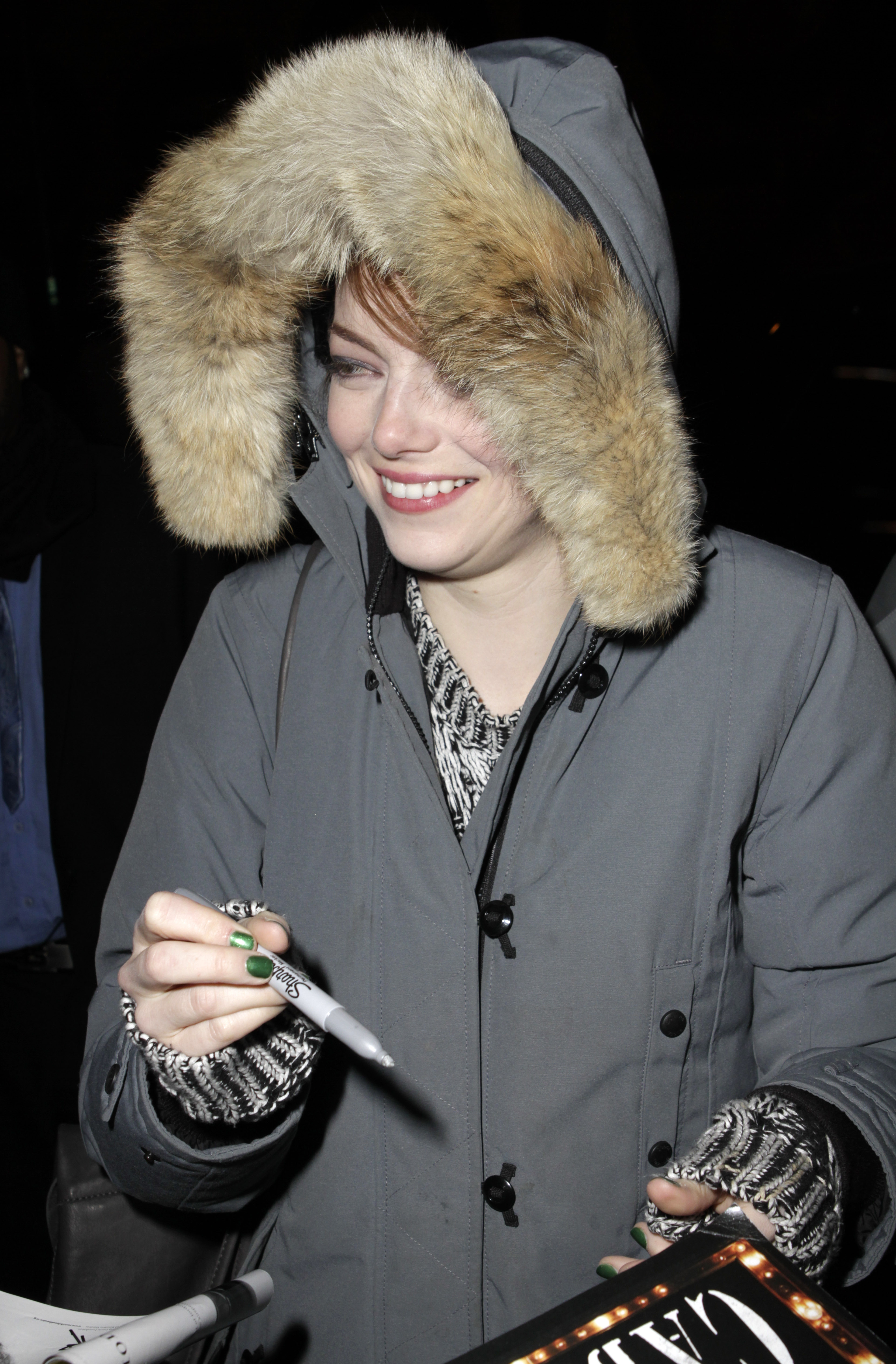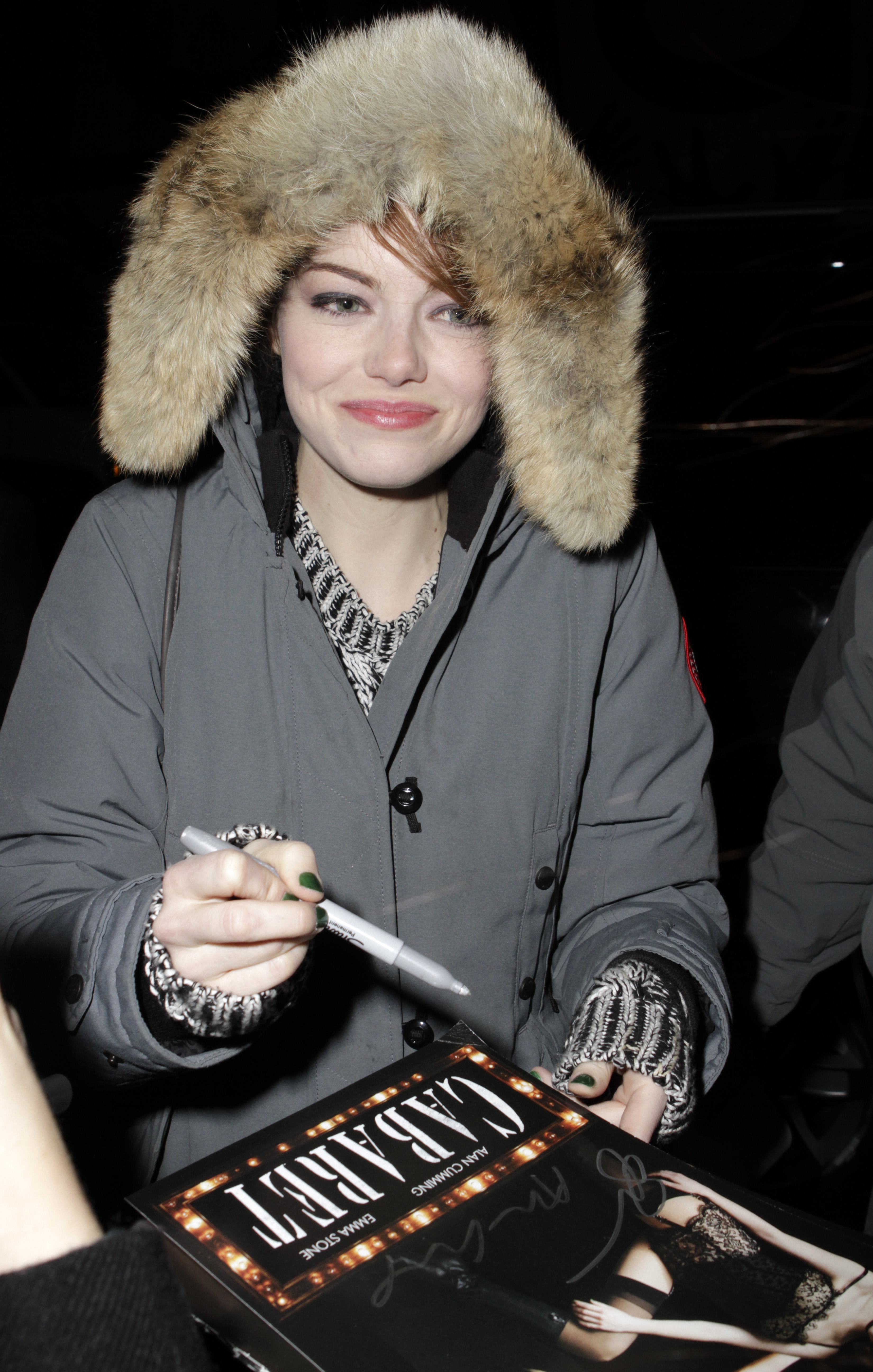 Signing autographs for fans outside the Kit Kat Club after her appearance in 'Cabaret' on November 18, 2014 in New York.