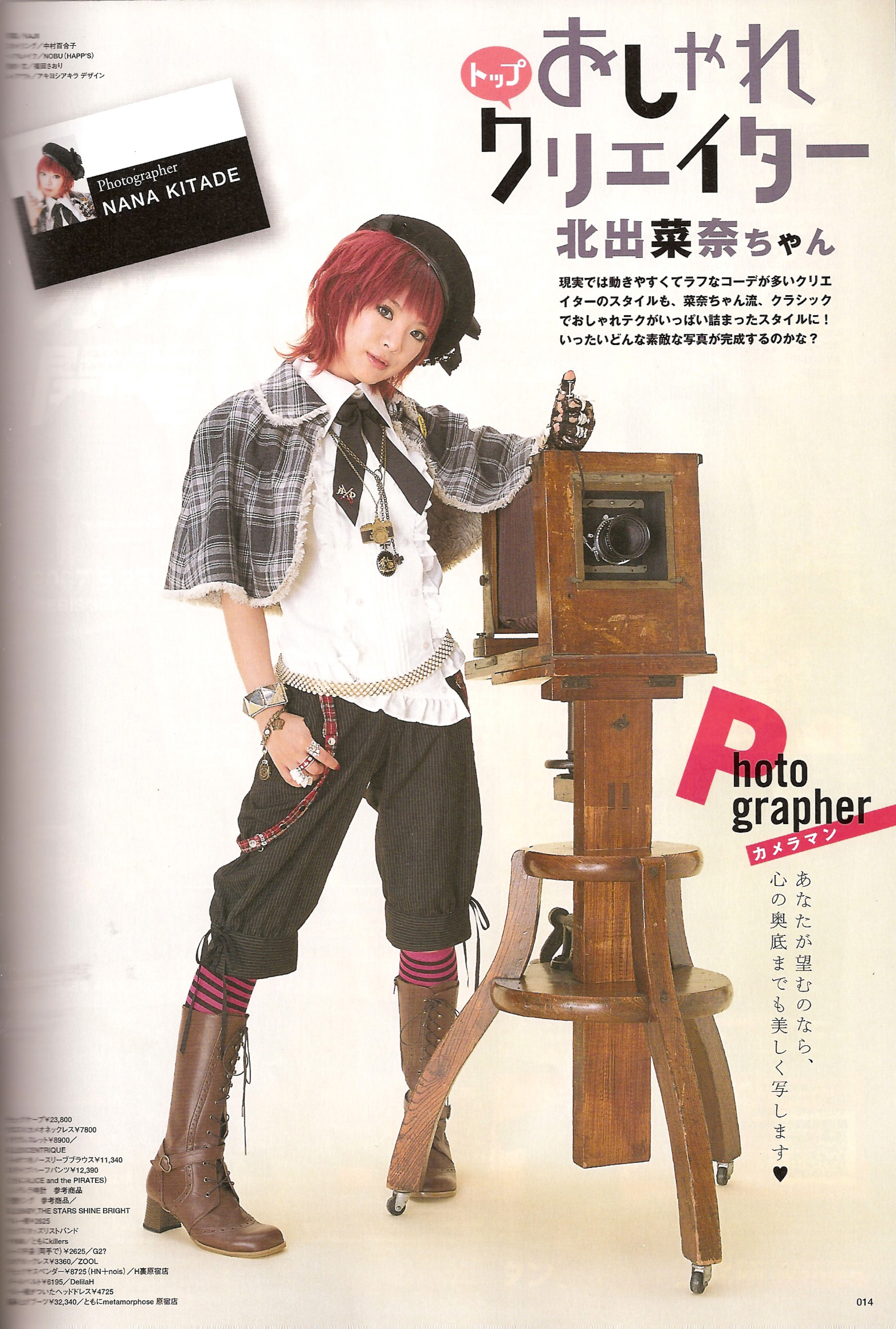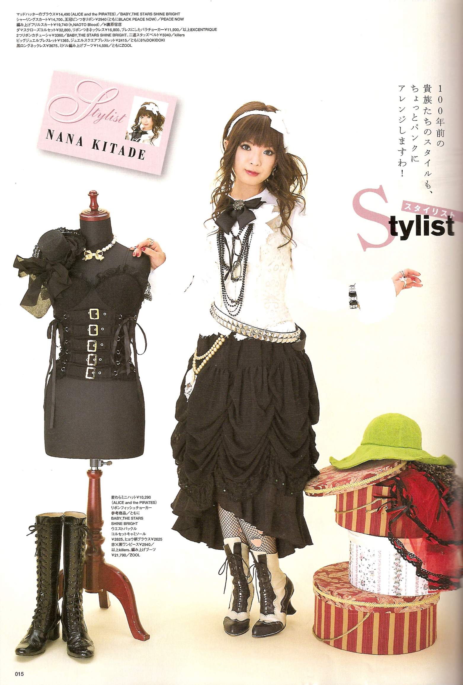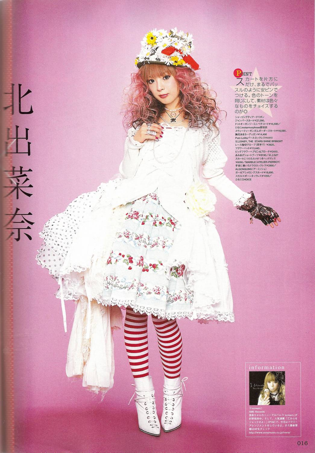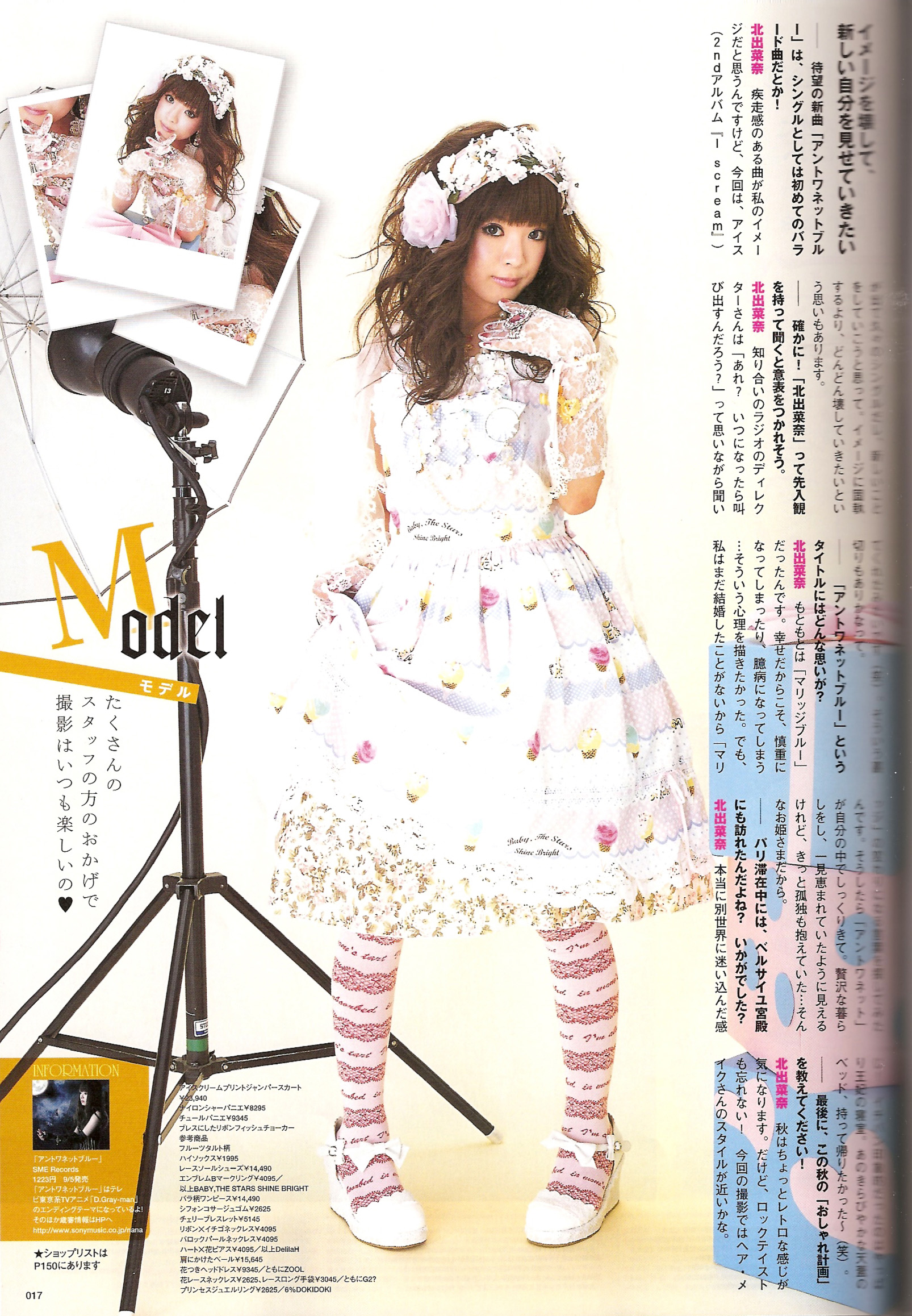 Kitade Nana (北出菜奈) is a Japanese rock artist. She is affiliated with BIG APPLE and signed under Sony Music Entertainment, and has made a release in the United States under Tofu Records. She made her debut in 2003 with the single, "Kesenai Tsumi" which was used as the first ending theme to Full Metal Alchemist anime. Since its release her sales have slowly dropped and only a few have reached into the top twenty. After the release of her debut album she has started wearing more gothic-lolita clothing and has been modeling for magazines such as CUTiE.