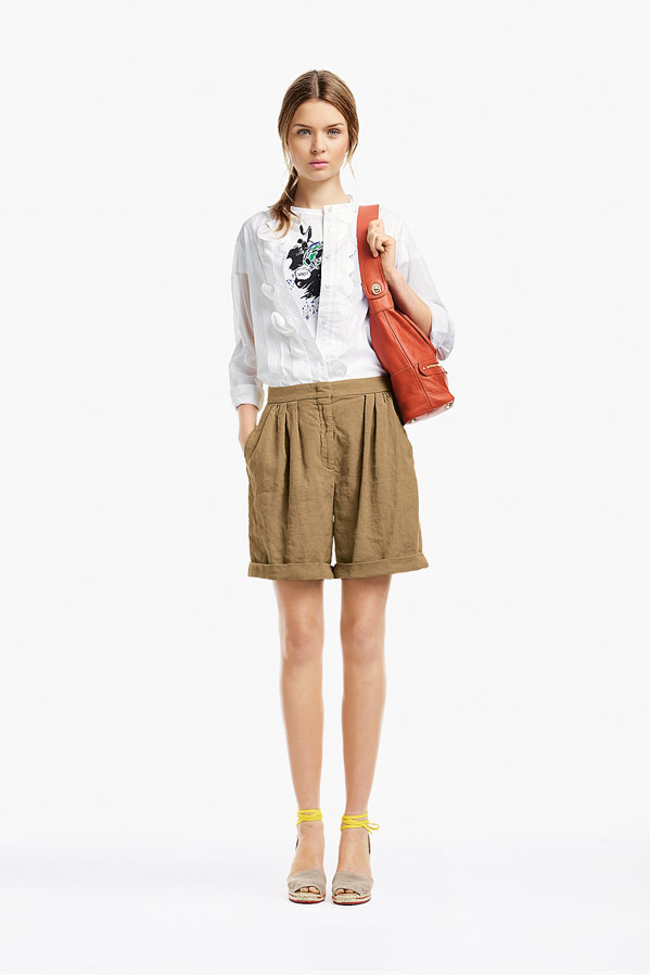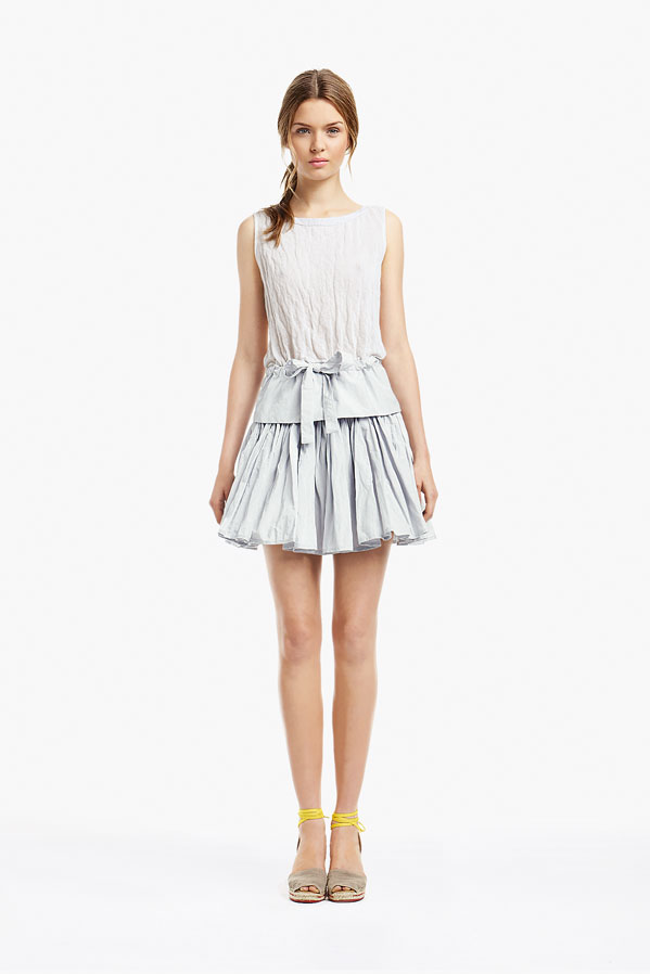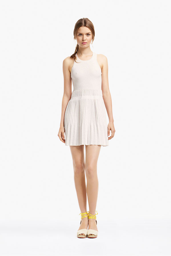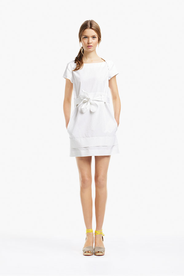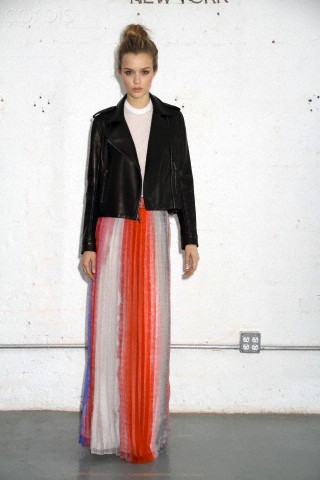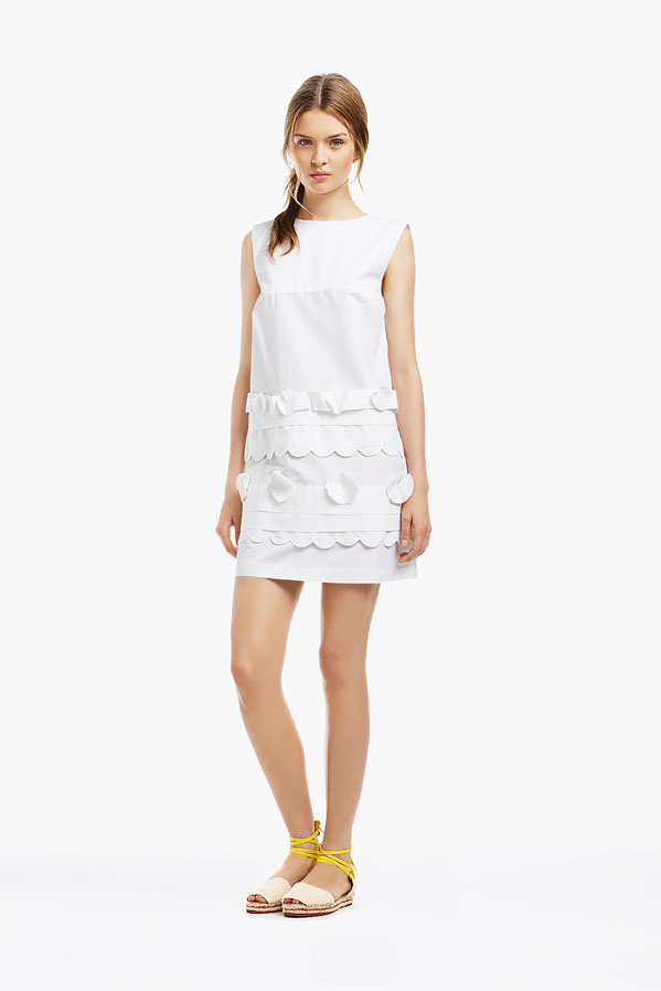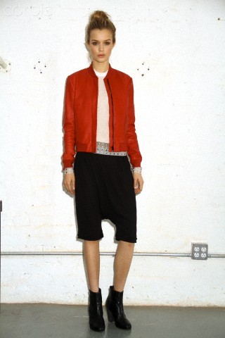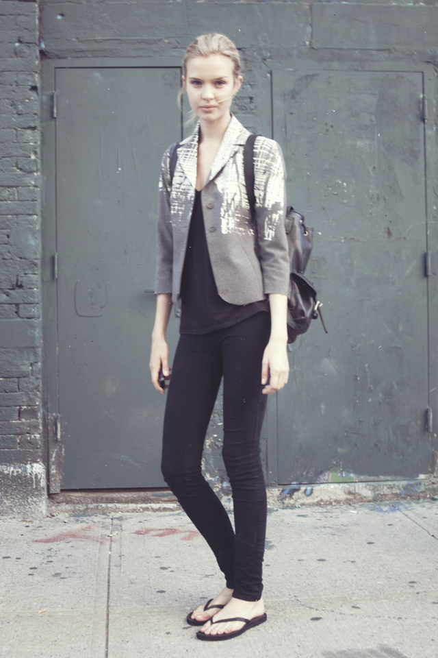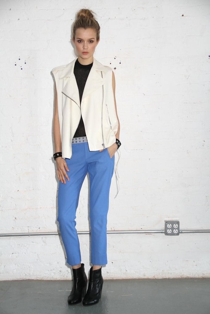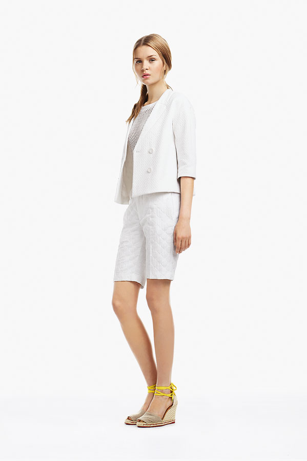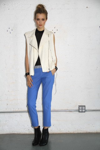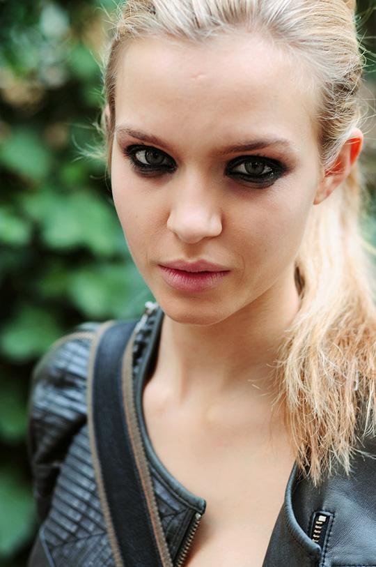 So, Josephine popped by the other day for a little bit of runway-to-reality fun. We followed Pat’s lead and kept the face fresh, focusing on glowing skin: cleansed and well-moisturized, spot-correcting with concealer as needed. I used CoverGirl’s Intense ShadowBlast in Beige Blaze as a highlighter, dabbing it across the cheekbones, under the eyebrows, on the inner corners of the eyes, down the bridge of the nose and on the Cupid’s Bow. Now for the sequins. I applied them with false eyelash glue from Duane Reade, a tweezer, and a very steady hand. The upper and lower eyelids should be dry—use a clean eye shadow brush to lightly dust the area with translucent powder first. Dot the back of the crescents with the tiniest amount of glue and place them just above (and below) the pupil, right against the lash line. The two halves should mirror each other when your eyes are closed. (This took several attempts…if you need to try again, just peel the sequin off and use makeup remover and a cotton swap to remove the glue before starting over.) Add a dab of Eight Hour Cream on the lips, a white leather le smoking by Reed Krakoff, and jewels from Repossi, and voilà: the coolest party look around.