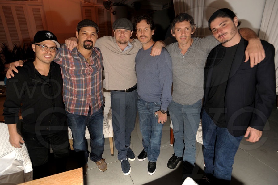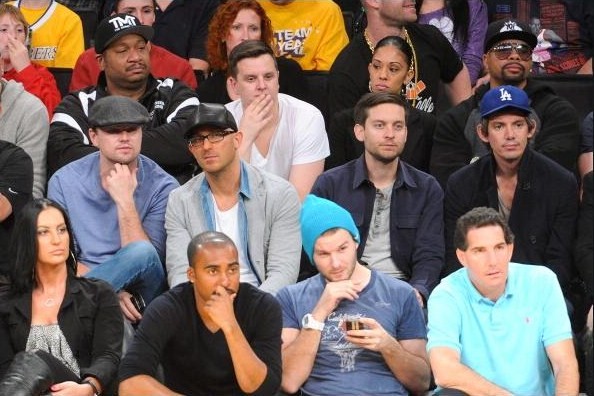 Leonardo DiCaprio, guest, Tobey Maguire and Lukas Haas attend a basketball game between the Miami Heat and the Los Angeles Lakers at Staples Center on January 17, 2013 in Los Angeles, California.