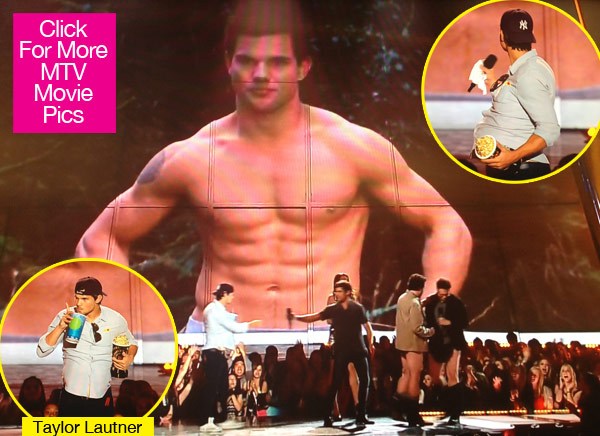 Taylor Lautner‘s abs are finally getting the recognition they deserve! At the April 14 MTV Movie Awards at the Sony Pictures Studio Lot, Taylor beat out Magic Mike‘sChanning Tatum to win “Best Shirtless Scene,” and Taylor was hilarious when collecting his award from Zac Efron and Seth Rogen!
