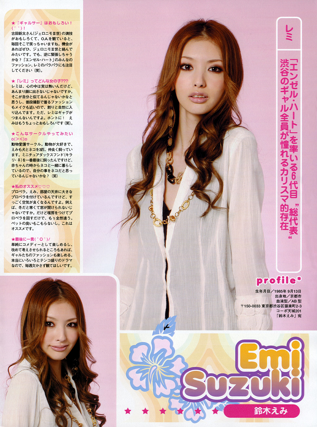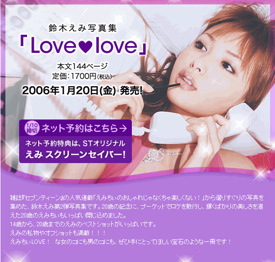Suzuki Emi(Emi, Suzuki) is a Japanese-Chinese model and actress who is Shueisha's most favored model for both Seventeen and Pinky. Suzuki has also done many commercials and had parts in PVs, and she was part of the short-lived musical duo Juemilia.