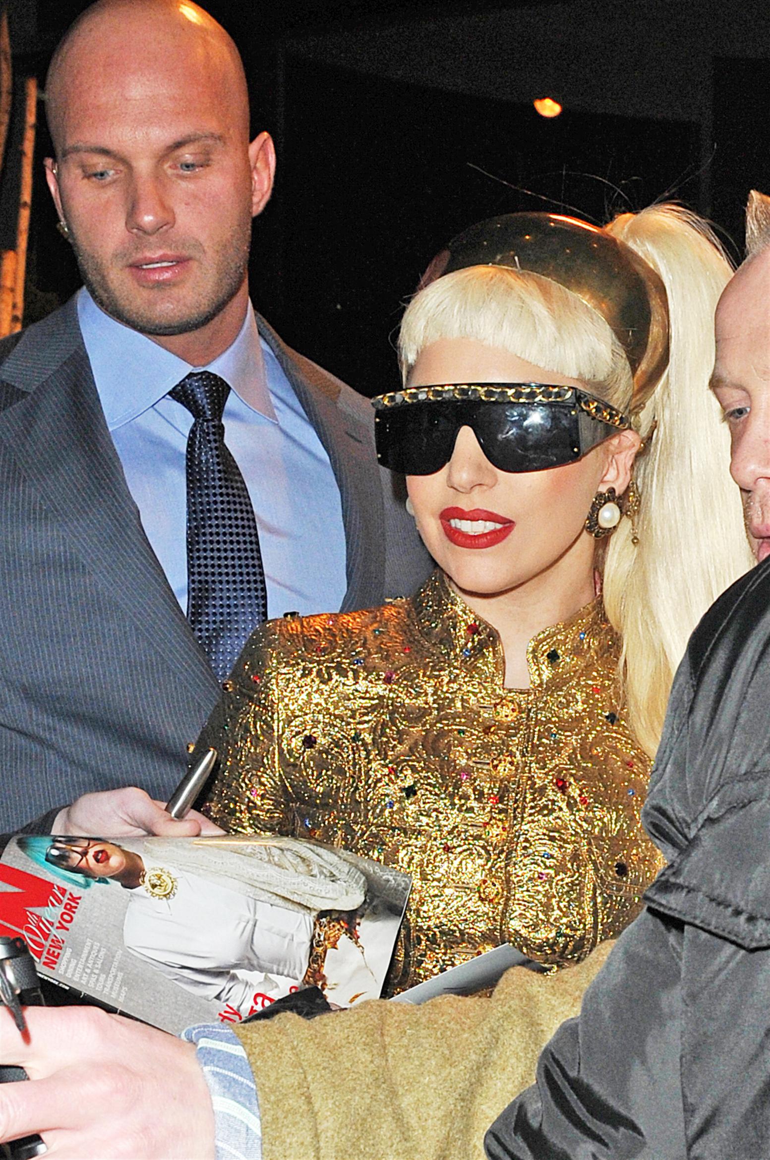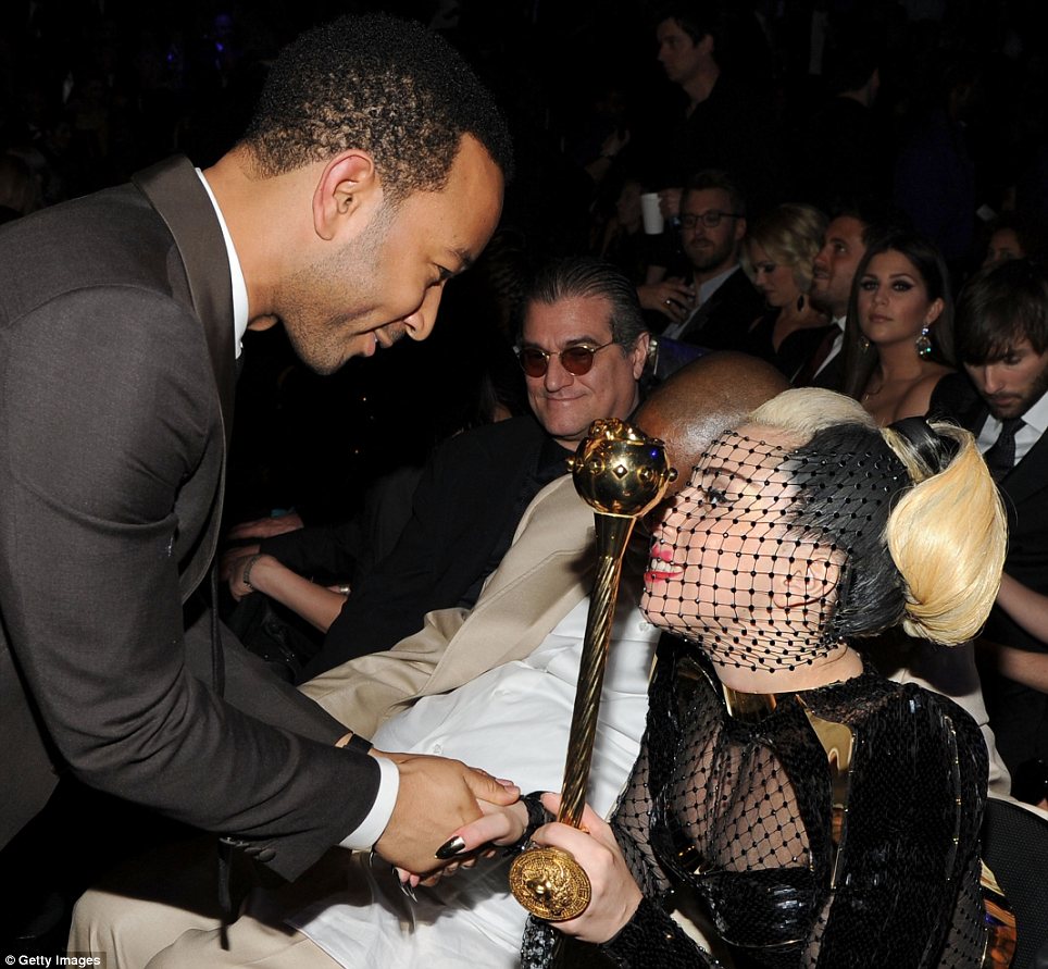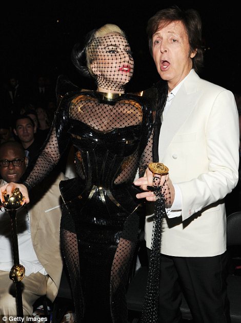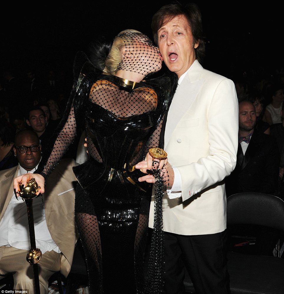 Lady Gaga plants a kiss on Paul McCartney as she slips into dominatrix outfit at Grammys. She wore a black and gold plastic dominatrix-style corset over the sheer number. 25-year-old Gaga was seen planting a big kiss on The Beatles singer’s cheek. Gaga has stripped down to almost nothing in a new tour promo for her Born This Way Ball world tour.
