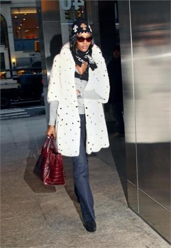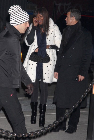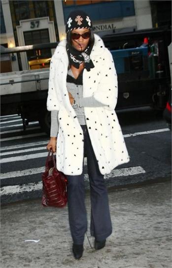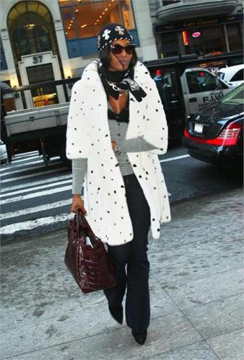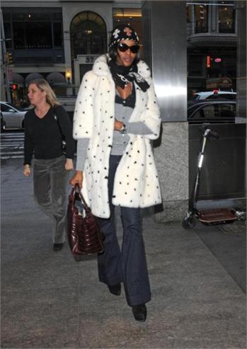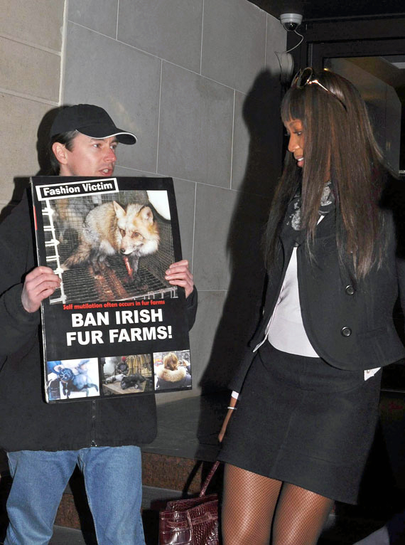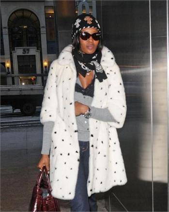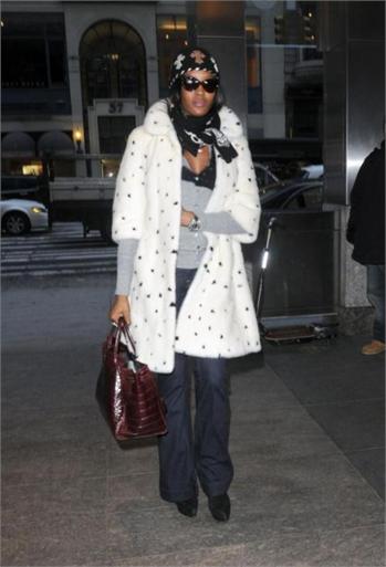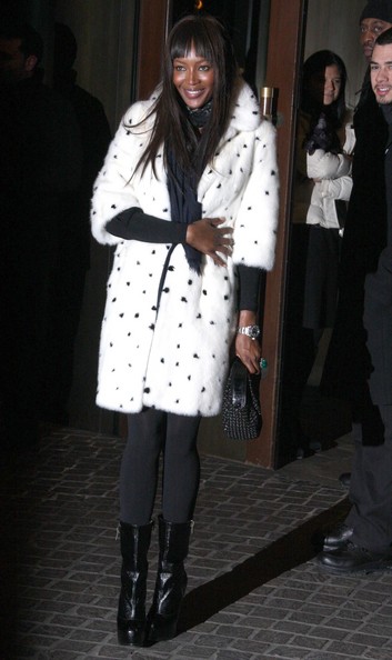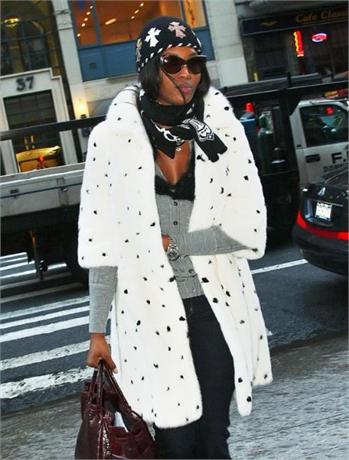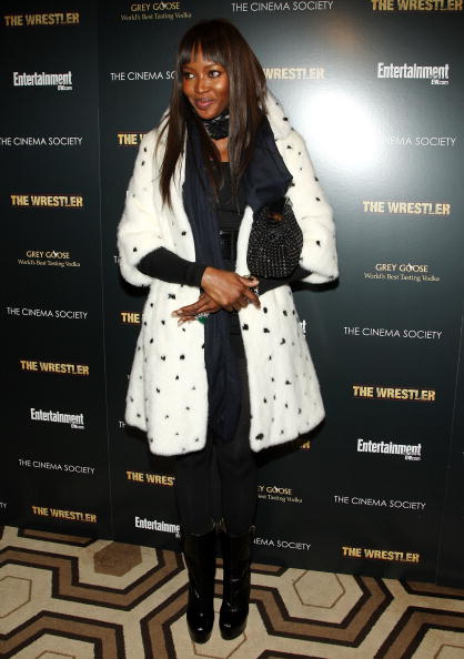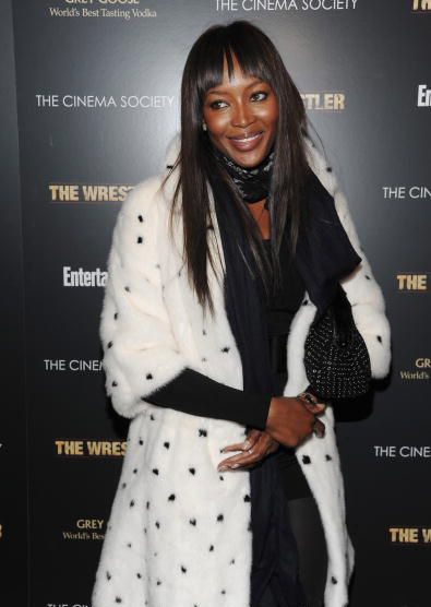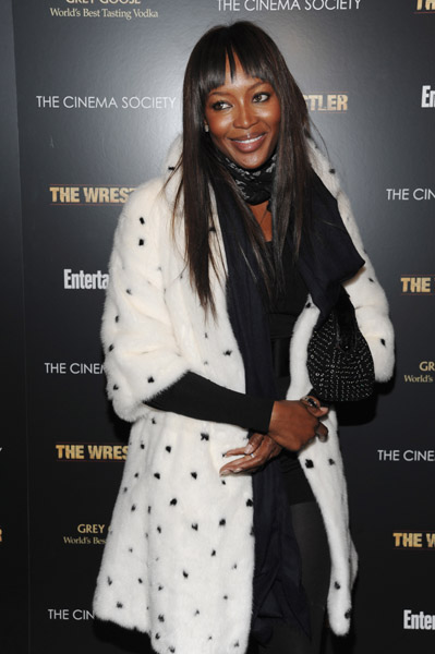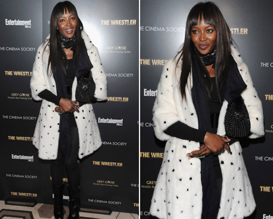 Naomi Campbell attended the special screening of The Wrestler in New York, wearing a black ensemble which she covered up with a white Alexander McQueen Fall 2008 mink coat which has black mink spots and, as a reaction, was confronted in Dublin with an animal rights protester, angry that she has worn fur in the past.