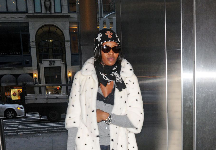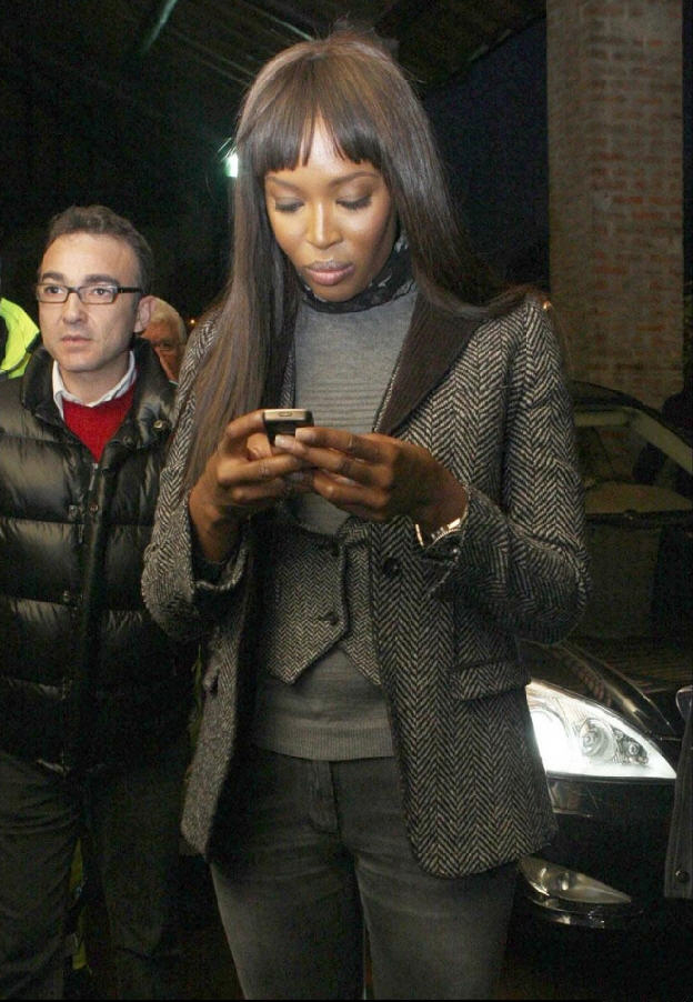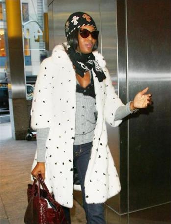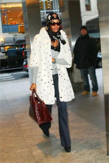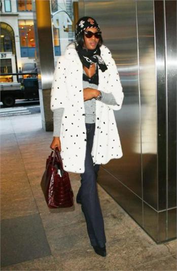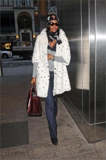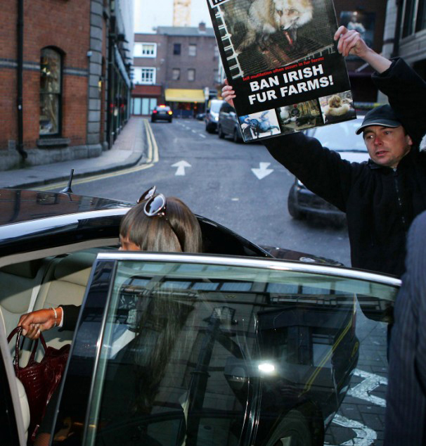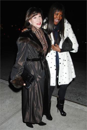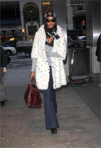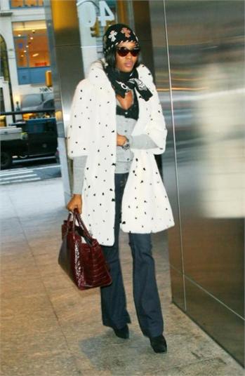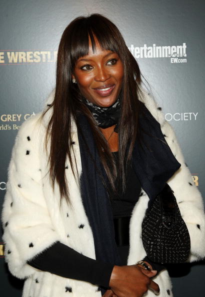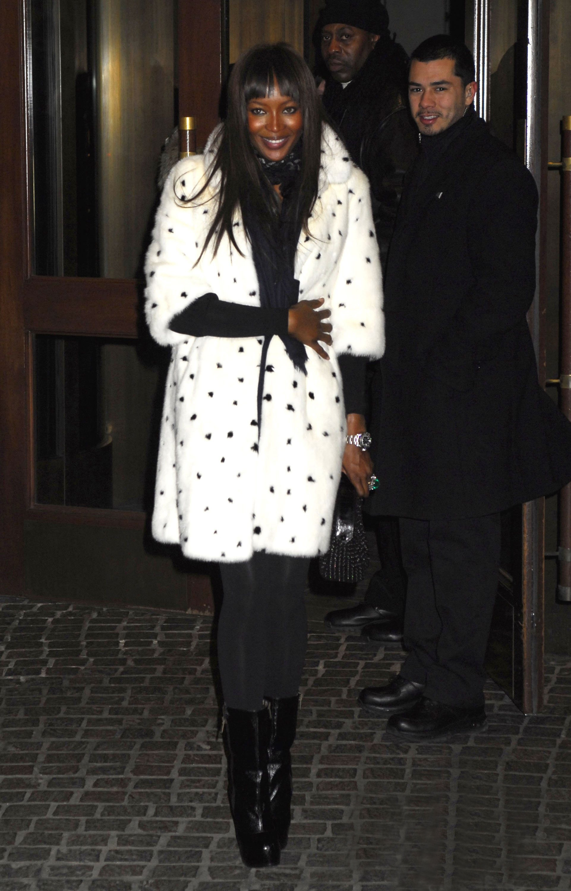 Naomi Campbell attended the special screening of The Wrestler in New York, wearing a black ensemble which she covered up with a white Alexander McQueen Fall 2008 mink coat which has black mink spots and, as a reaction, was confronted in Dublin with an animal rights protester, angry that she has worn fur in the past.