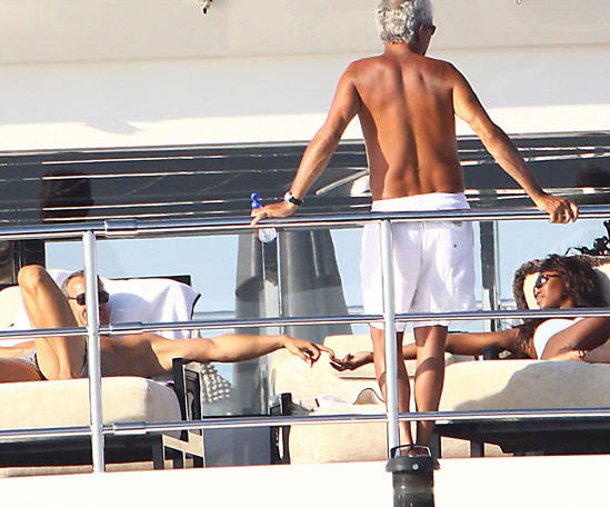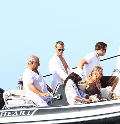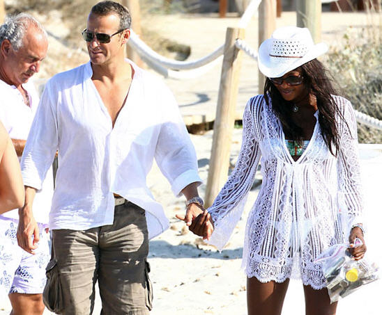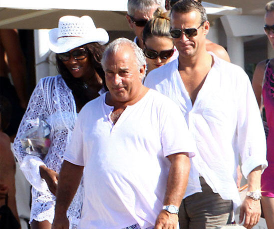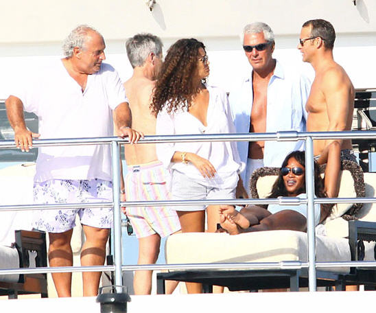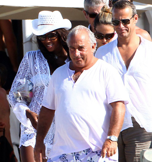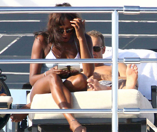Naomi Campbell and boyfriend Vladislav Doronin were spotted aboard British businessman Sir Philip Green's Benetti Lionheart yacht, 19th. aug. The couple were joined by Topshop boss Sir Philip Green for dinner in Formentera before heading back for kisses and cuddles on board.