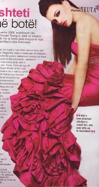 She comes from a background of singers, and loves to sing and perform. Her father and sister are both singers and her inspiration. She also loves modeling and had previously participated at Ford Supermodel Contest and represented Albania for the first time in this competition. Zana was chosen to represent Kosovo in the Miss Universe pageant by world renown photographer Fadil Berisha who took the official Miss Universe photos, a fellow Kosovar Albanian.Her interests include singing, performing and modelling. Her career ambition is to be a fashion designer.
