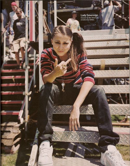 Louise Amanda Harman (born 19 December 1985), known as Lady Sovereign, is an English rapper. Lady Sovereign is unique as the only white female artist in the primarily black British Grime scene. As a white MC, her authenticity has been contested within the that scene, "even though she grew up in the same kind of public-housing project - Chalk Hill estate, now demolished - that many grime artists did." She has been compared to both Melanie C (namely her Sporty Spice persona), for their physical resemblance and similar athletic clothing, and to Eminem, as "another lily-white rap sensation." Lady Sovereign is notable for her adoption of a relatively masculine appearance and aggressive delivery, donning athletic gear and mocking the trappings of more traditional female sexuality, perhaps in order to better fit in with the male dominated Grime scene. This stands in sharp contrast to female artists in similar genres, such as bassline house’s more traditionally feminine Zoe. Her levels of success continue to rise domestically, and while she has not reached mainstream audiences abroad, she is becoming recognizable as a standout in the grime genre. New Yorker writer Sasha Frere-Jones describes her as "good: pithy, clever, and able to use her honking voice to humorous effect." This can be seen in Lady Sovereign's track "Cha Ching (Cheque 1, 2 Remix)" and "Love Me or Hate Me".