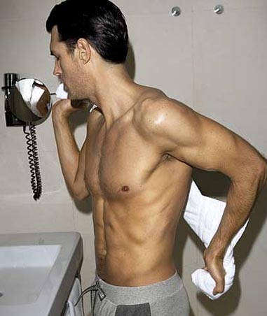 he is shy, funny, and sexy as all....hell...he even looks great in a pair old grungy gray sweats..... :evil: