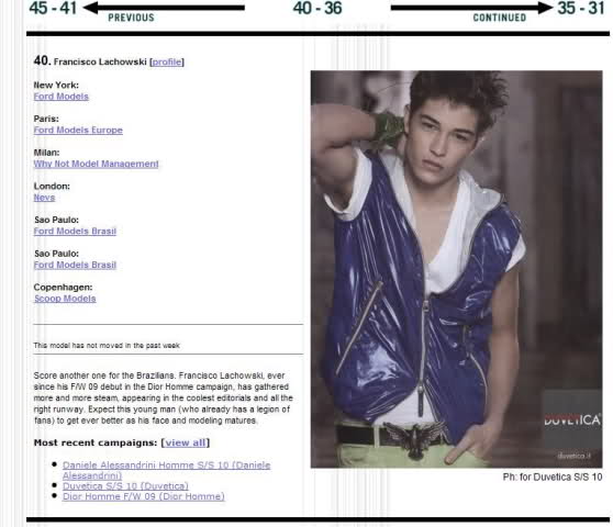 Score another one for the Brazilians. Francisco Lachowski, ever since his F/W 09 debut in the Dior Homme campaign, has gathered more and more steam, appearing in the coolest editorials and all the right runway. Expect this young man (who already has a legion of fans) to get ever better as his face and modeling matures.Most recent campaigns: [view all]