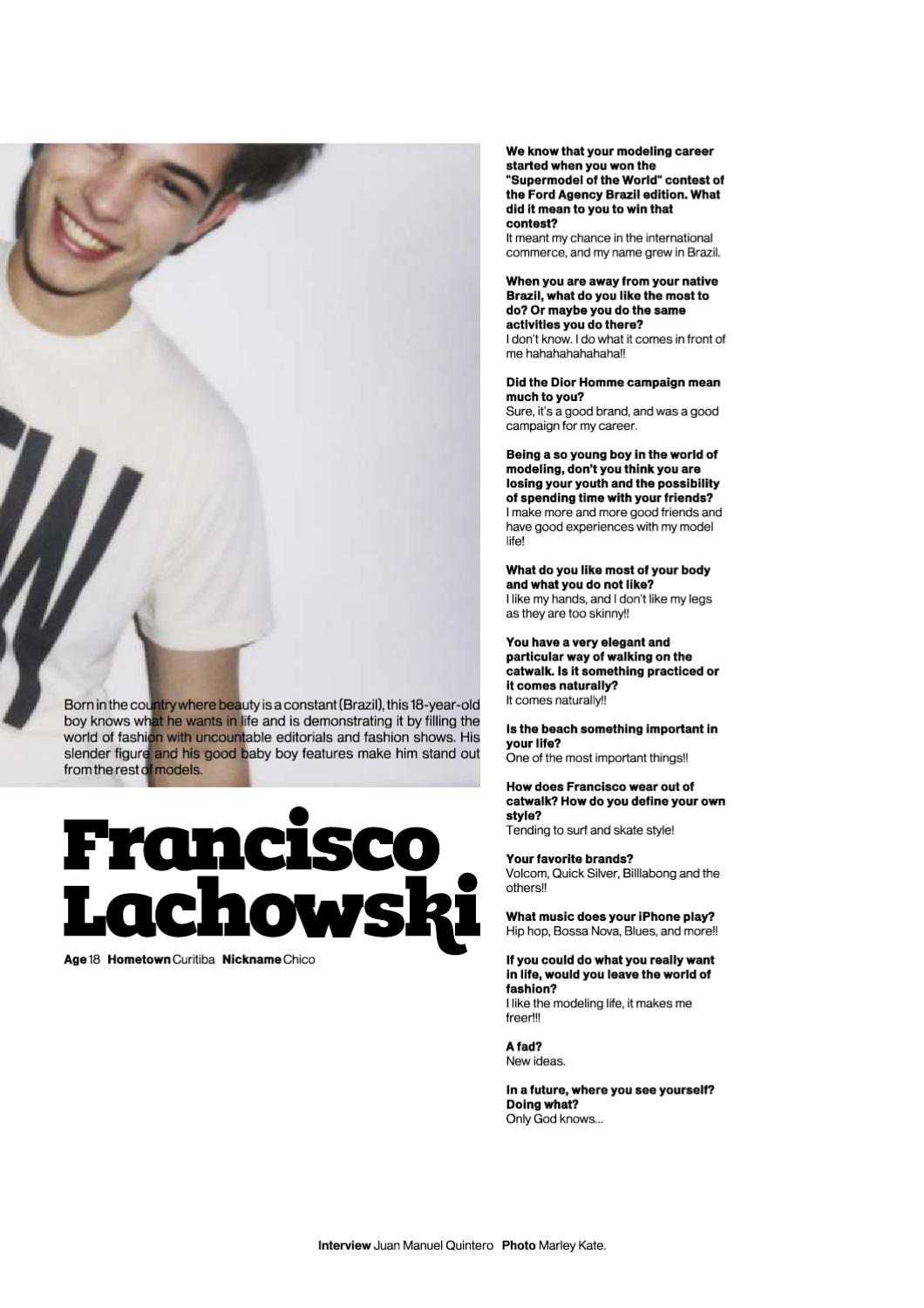 There was no looking back for Francisco after winning a modelling competition hosted by Ford Models in late 2008, earning him a prestigious contract with their Sao Paulo subdivision. Photographed for Vanity Teen by Marley Kate from New York, his instant exposure and popularity were evidently a result of his quirky charisma and beaming youth, while still maintaining the professionalism and perfect 'look' that every agent and client could possibly ask for. As he begins to grow into a young adult, his developing physique and experience in the modelling world has thus far already proved him worthy for international success.