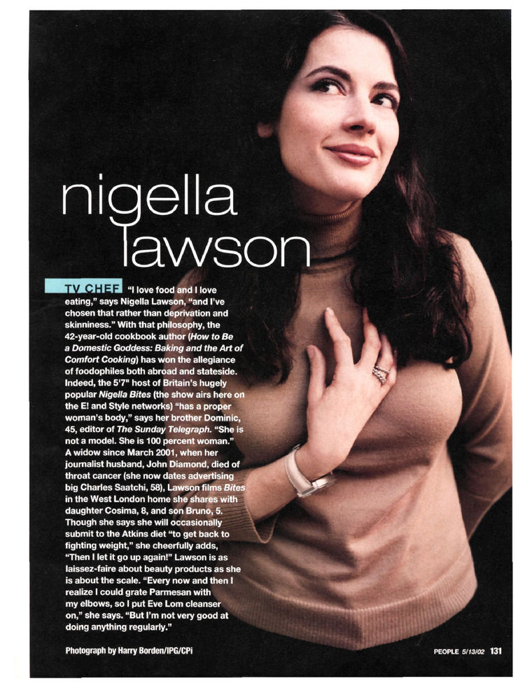 Nigella Lucy Lawson (born 6 January 1960) is an English food writer, journalist and broadcaster. Lawson was born to Nigel Lawson (now Baron Lawson of Blaby), a former Chancellor of the Exchequer, and Vanessa Salmon, whose family owned the J. Lyons and Co. empire. After graduating from the University of Oxford, Lawson started to work as a book reviewer and restaurant critic, later becoming the deputy literary editor of The Sunday Times in 1986. She then embarked upon a career as a freelance journalist, writing for a number of newspapers and magazines. In 1998, Lawson brought out her first cookery book, How to Eat, which sold 300,000 copies and became a bestseller. She went on to write her second book in 2000, How to be a Domestic Goddess, winning her the British Book Award for Author of The Year.