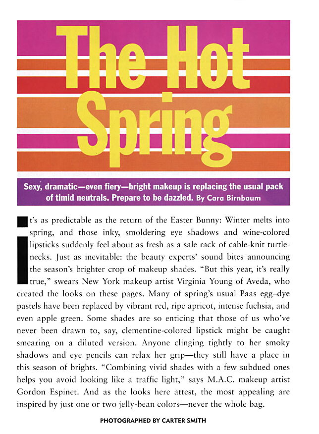 Magazine: Allure US (March 2003) Title: The Hot Spring Photographer: Carter Smith Model: Anouck Lepère, Carmen Maria Hillestad, Amy Lemons, Jacquetta Wheeler, Amanda Moore, Michelle de Swarte, Erin Wasson