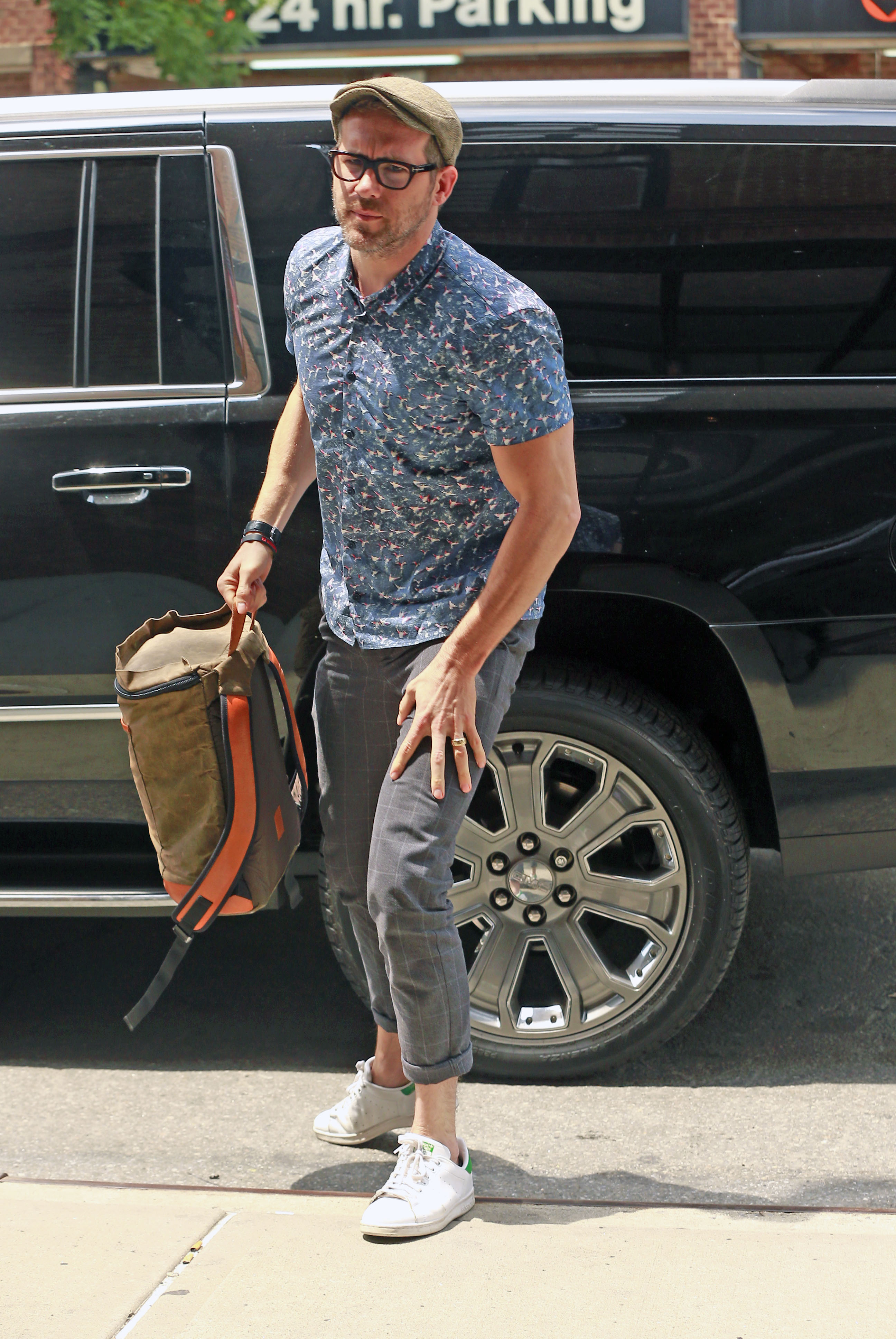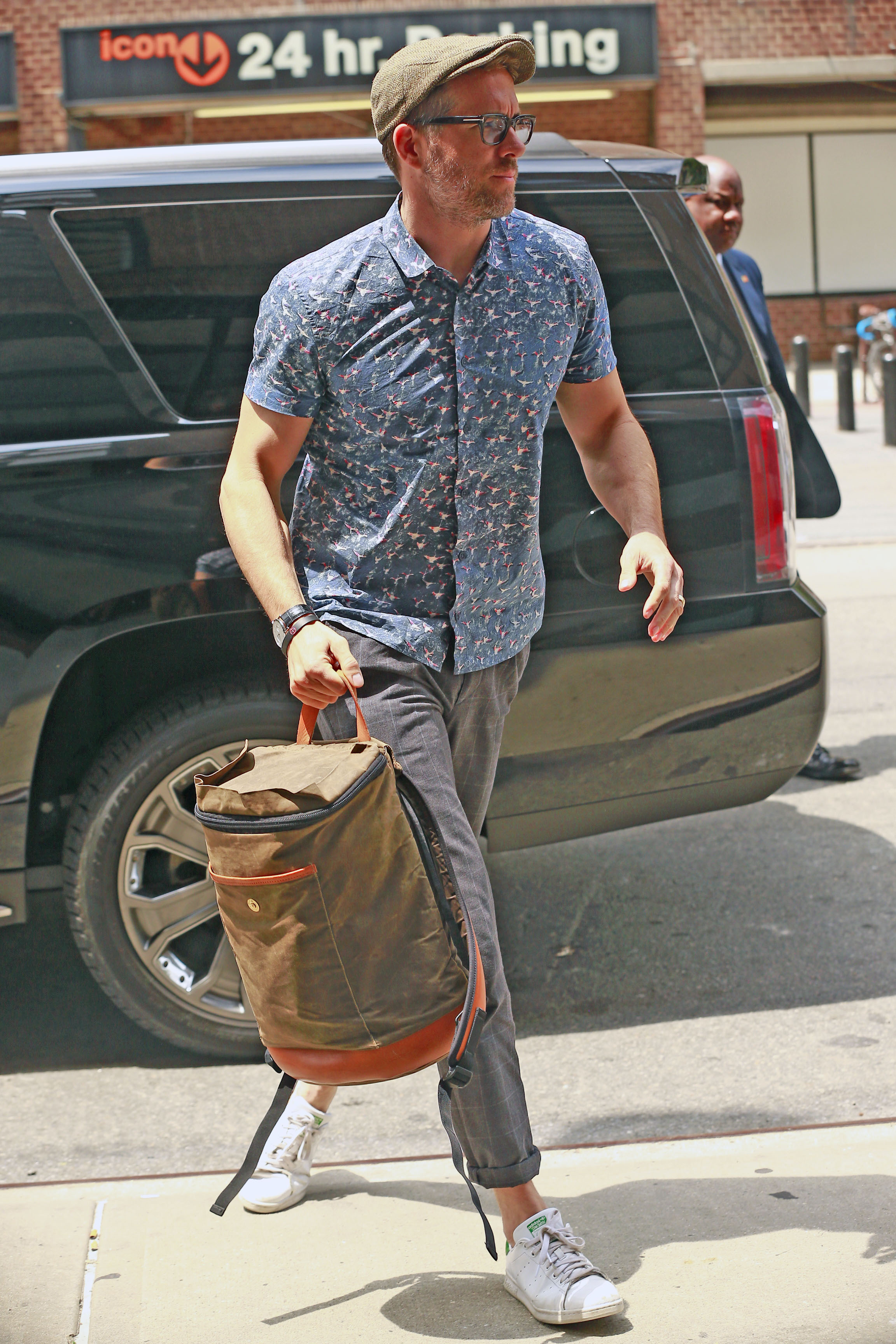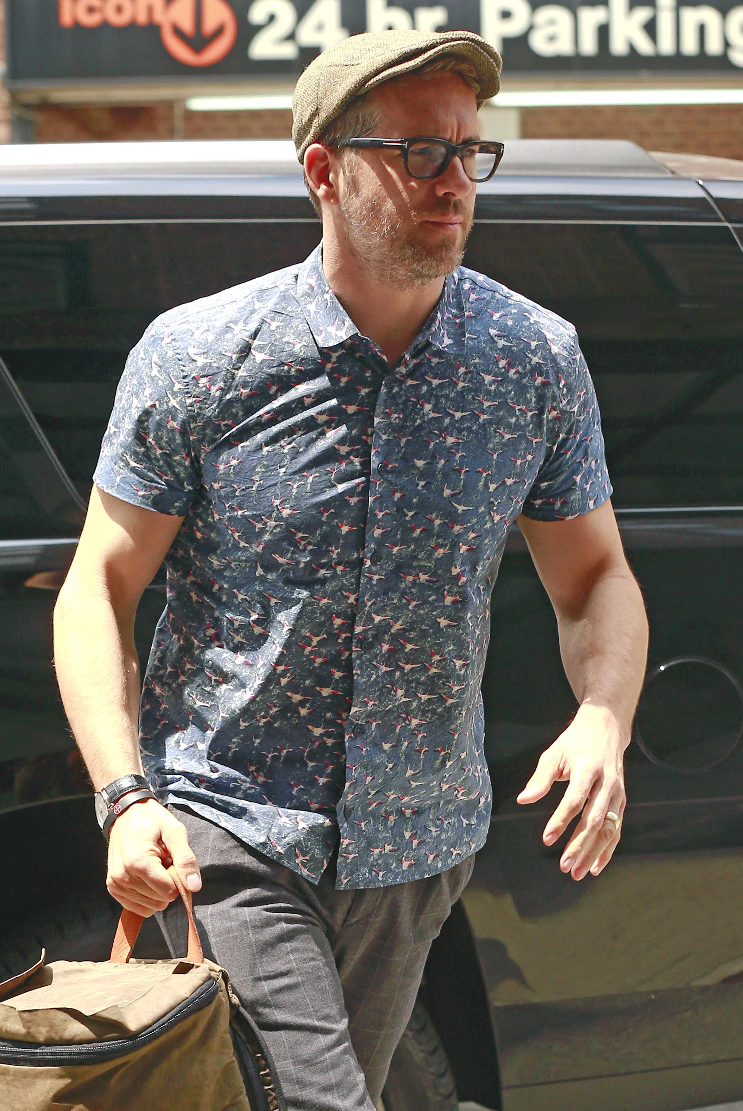 Ryan Reynolds wears a blue button-down while leaving his hotel on Friday (July 15) in New York City.