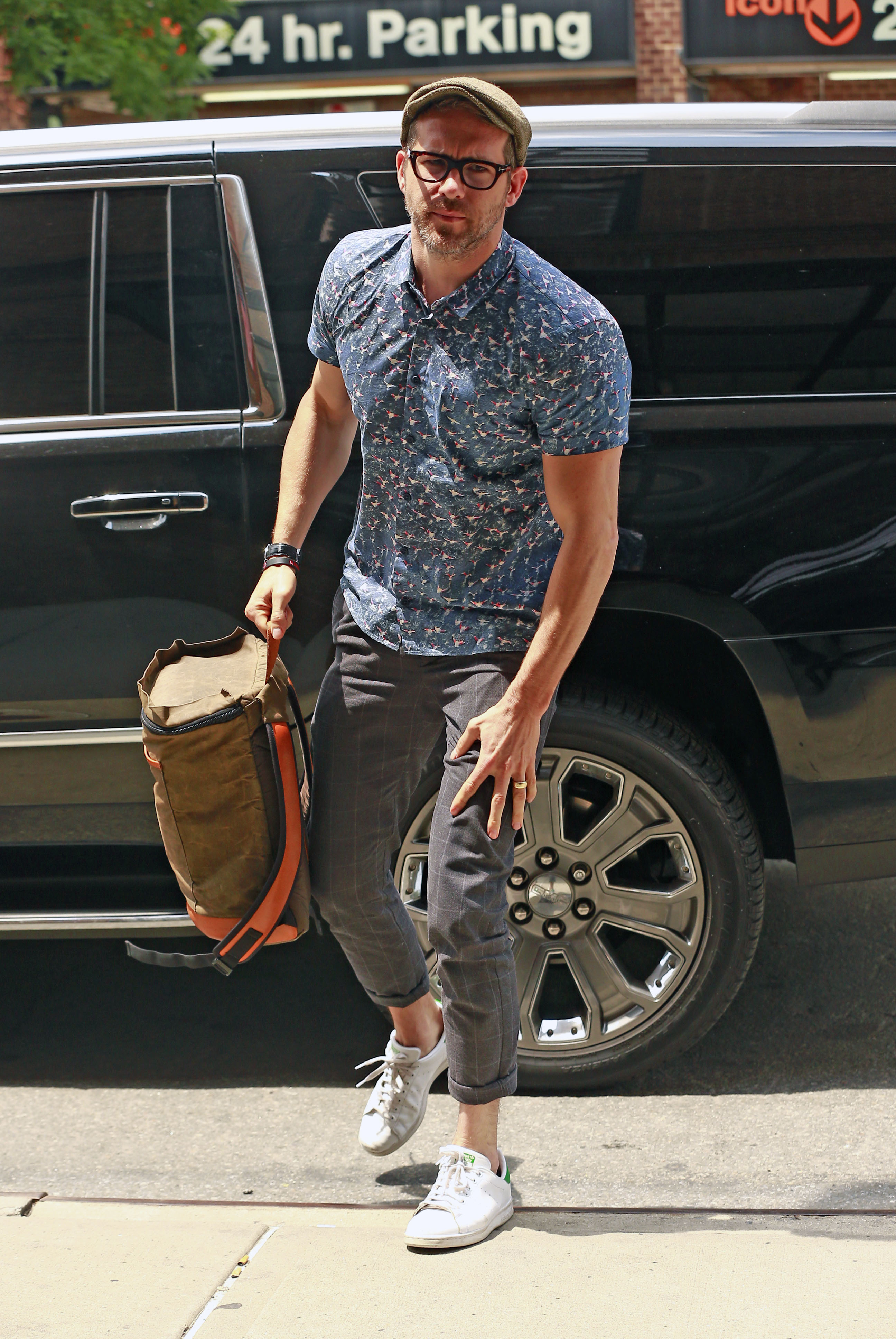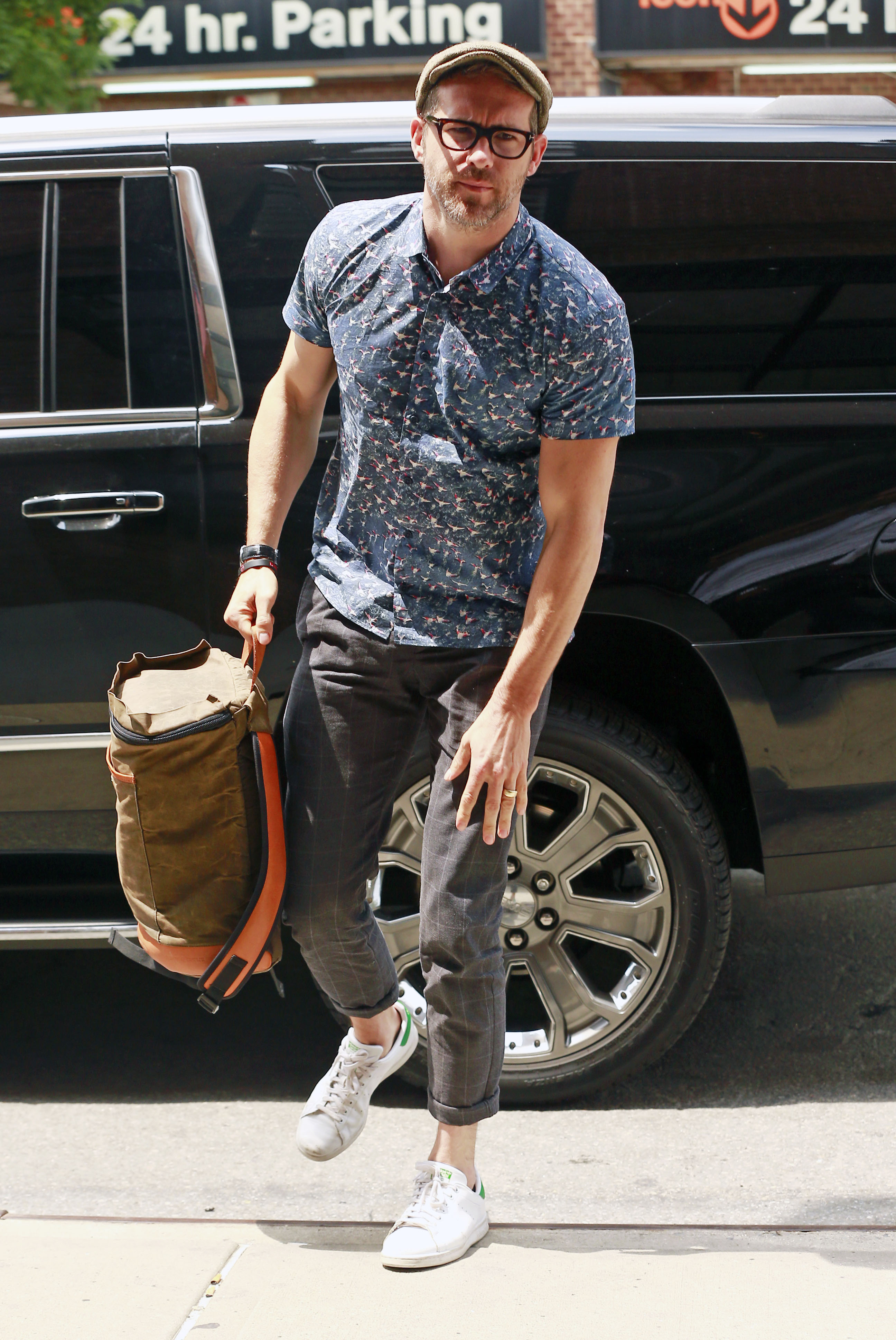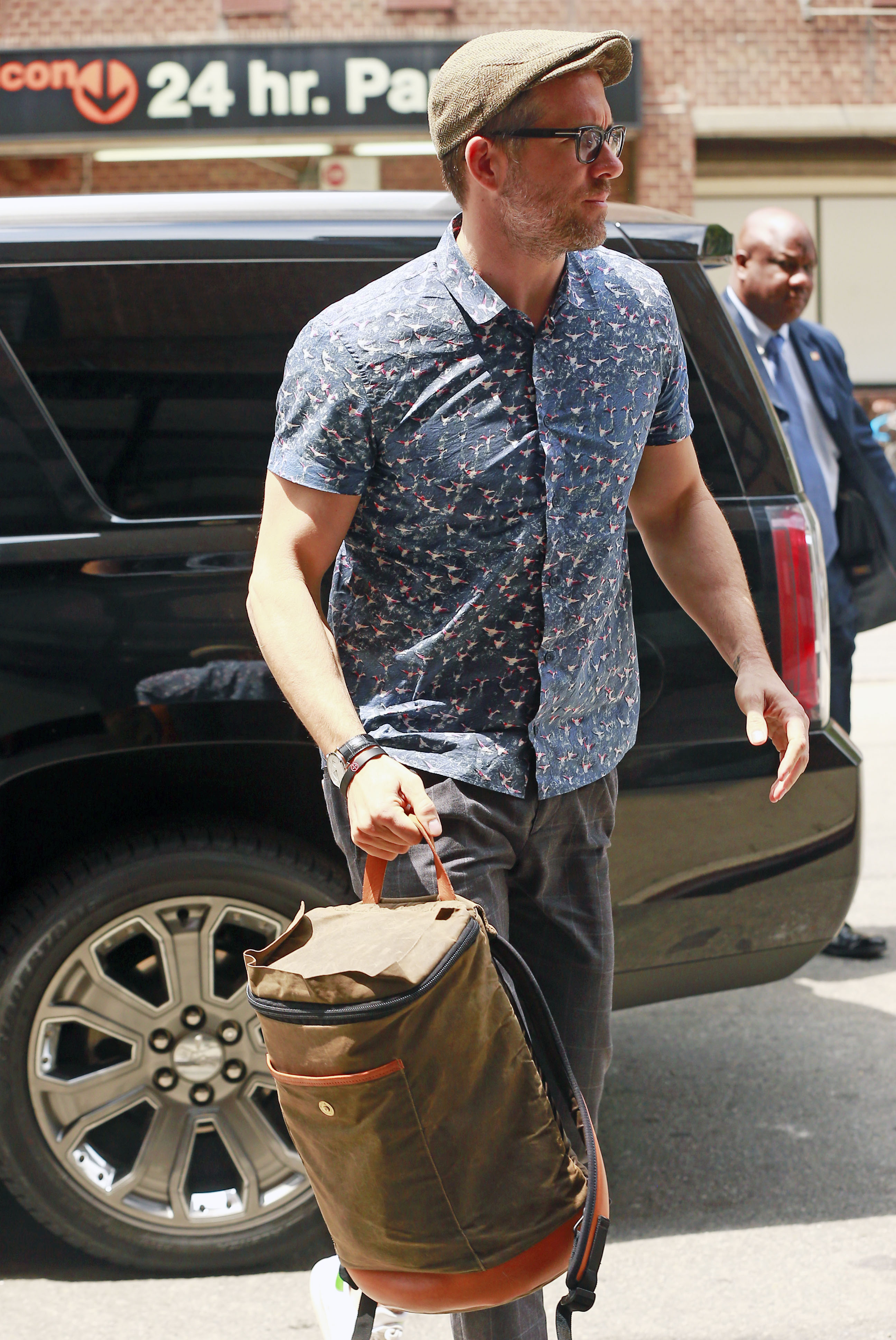 Ryan Reynolds wears a blue button-down while leaving his hotel on Friday (July 15) in New York City.