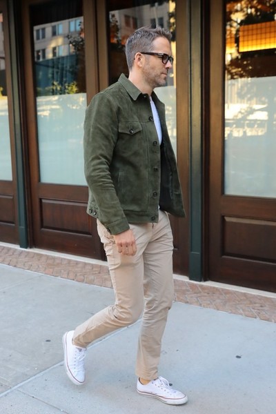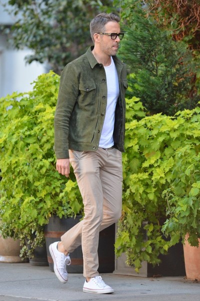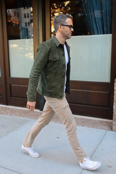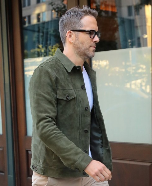 Ryan Reynolds showed off his casual style in a chic, brown leather jacket, dark wash jeans, and low-top sneakers while out in New York City on Monday