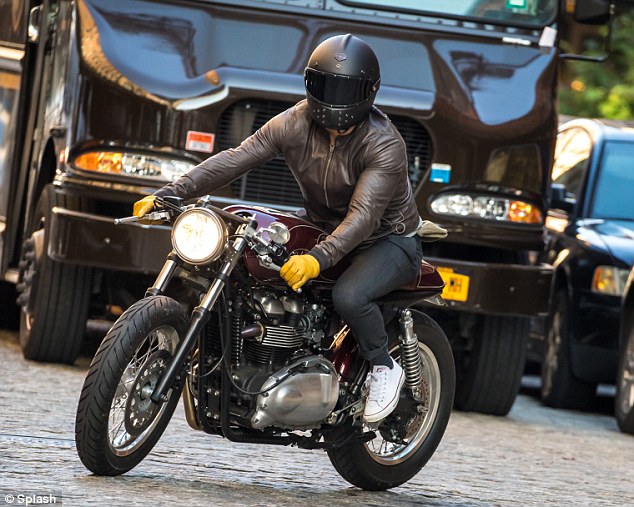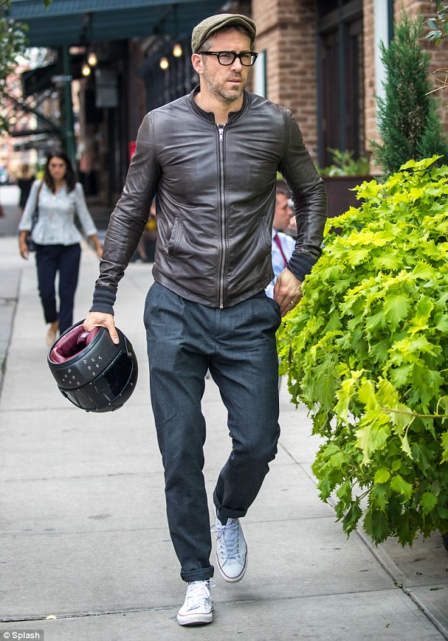 Ryan Reynolds rocked his biker look in NYC on Friday in a leather jacket as he took his motorbike for a spin