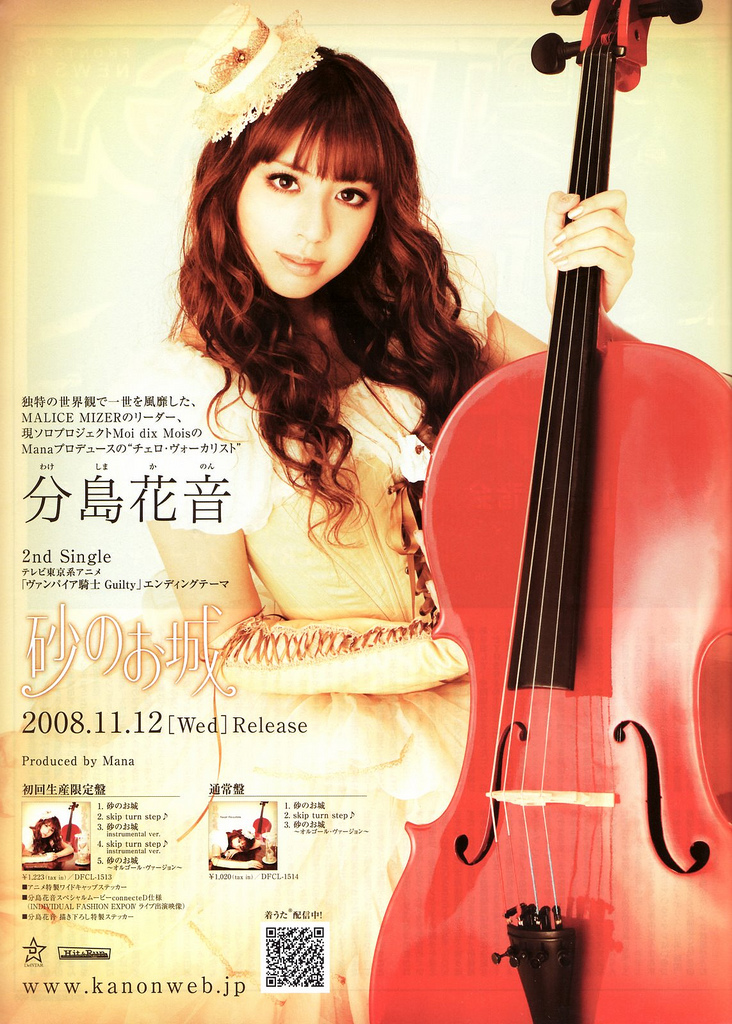 Kanon Wakeshima (分島 花音 ,Wakeshima Kano?) (born 1990) is a Japanese singer and cellist. Produced by Mana, Wakeshima debuted under the DefSTAR Records label on May 28, 2008 with the single "Still Doll", the ending theme for the anime adaptation of the manga series Vampire Knight. She also provided the voice for a maid that appears in the eighth episode of the series. Wakeshima's second single "Suna no Oshiro" (砂のお城 ), released on November 12, 2008, was used for the series' second season closing.