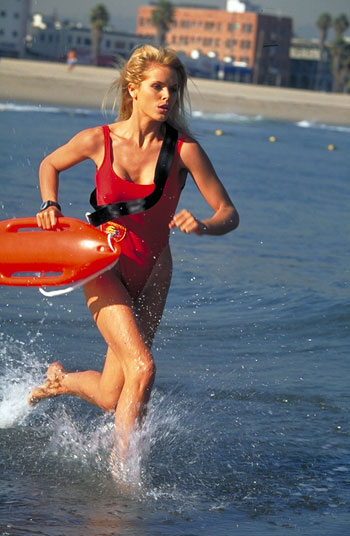 Pamela Anderson ( Casey Jean 'C.J' Parker) -- The red swimsuit clad phenomena herself. Pamela started at the show in 1992 and quickly jumped into the dreams of around about every boy or man who happened to be breathing during the 90s. Next to The Hoff, Miss Anderson is the most famous member of the Baywatch cast and quite arguably she was the one that made the show famous ( along with it's slo-mo beach-running scenes and the blue eyes of Miss Bleeth). Although things sort of went down hill for Pam when she started marrying washed-up rockers and inflating her breasts to Parton-esque proportions, Pamela Anderson was once one of the most beautiful women on the planet, a sex symbol, and is widely considered today to be one of the best things that ever happened to television!