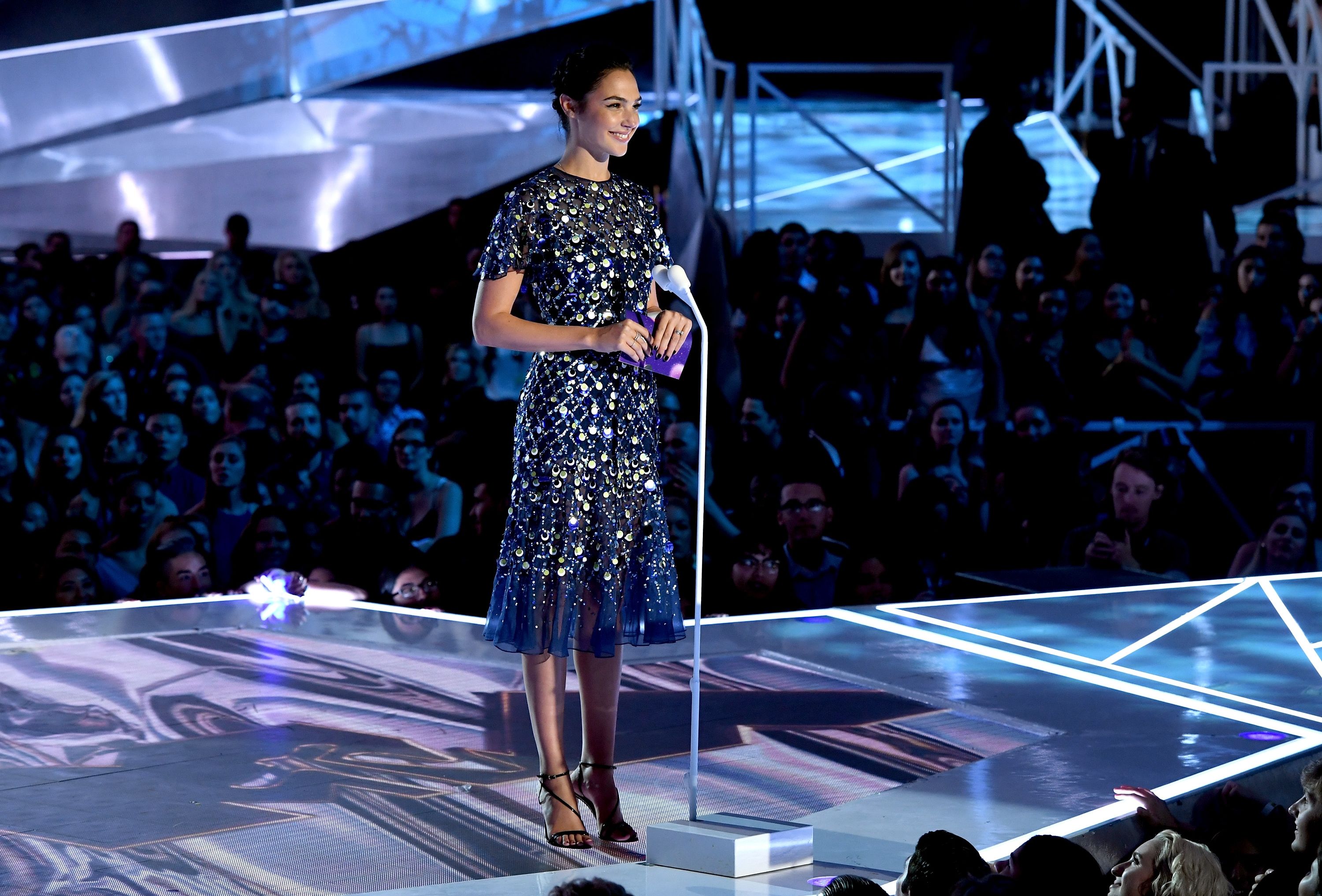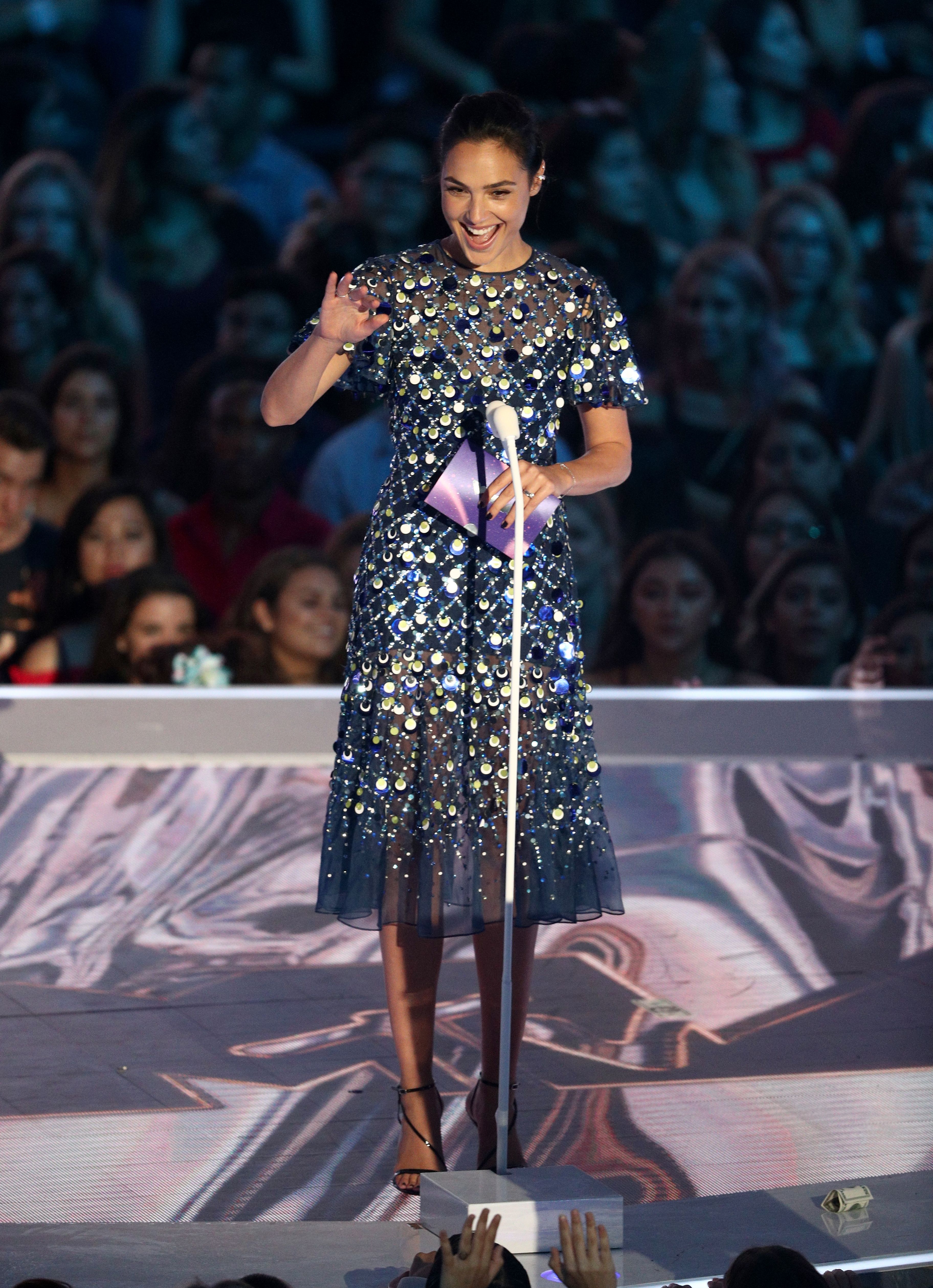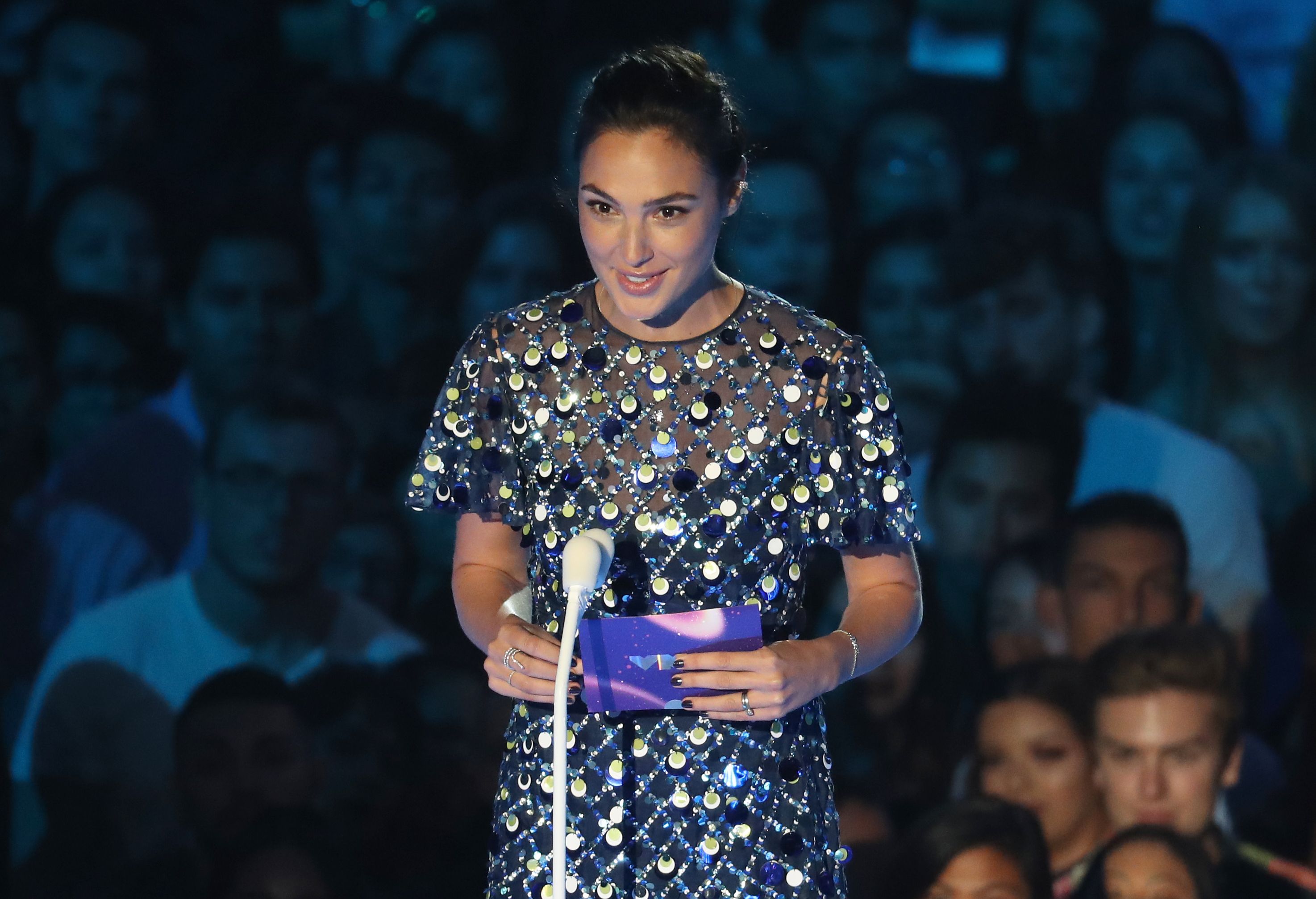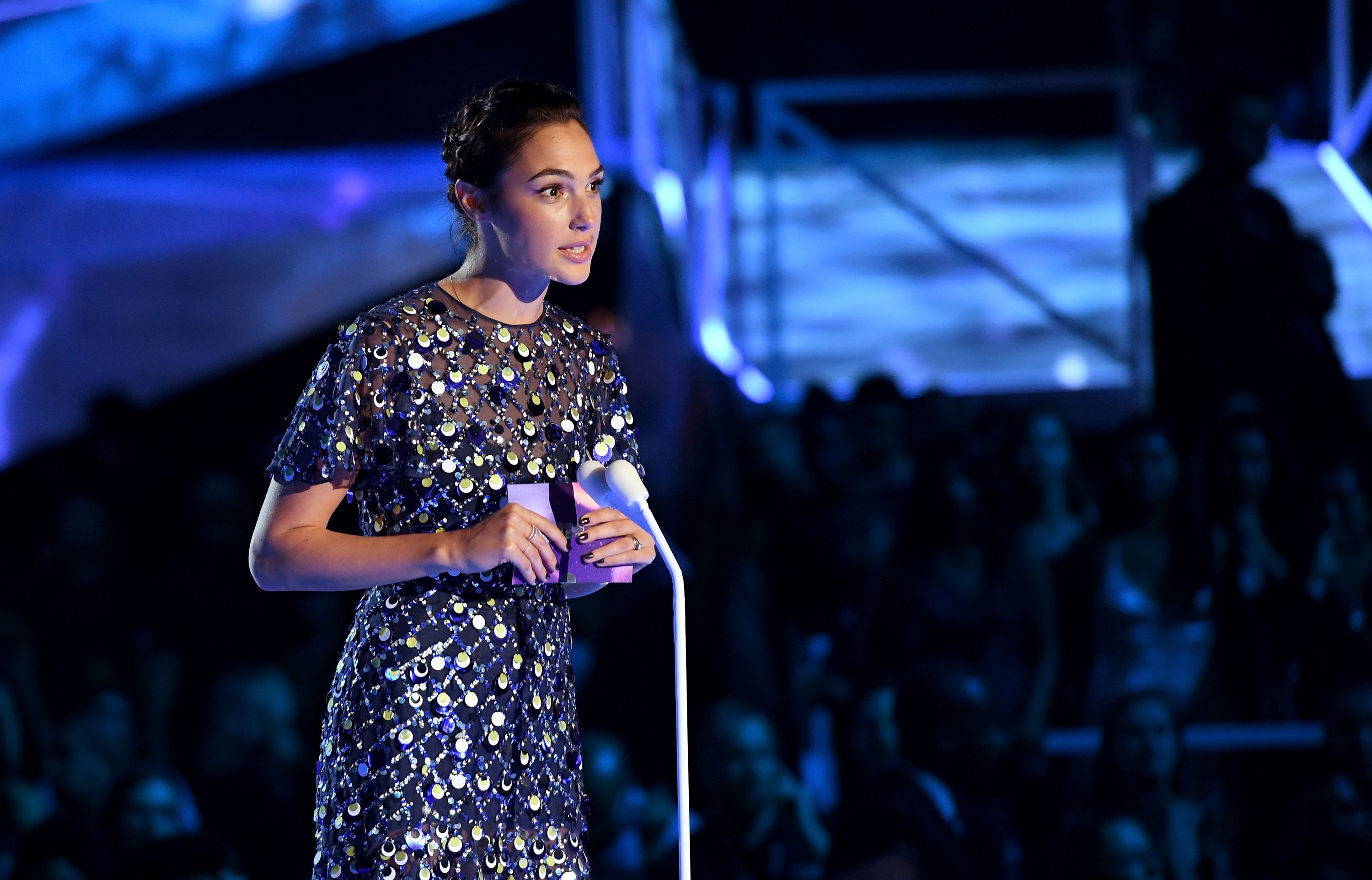 Gal Gadot speaks onstage during the 2017 MTV Video Music Awards at The Forum on August 27, 2017 in Inglewood, California.