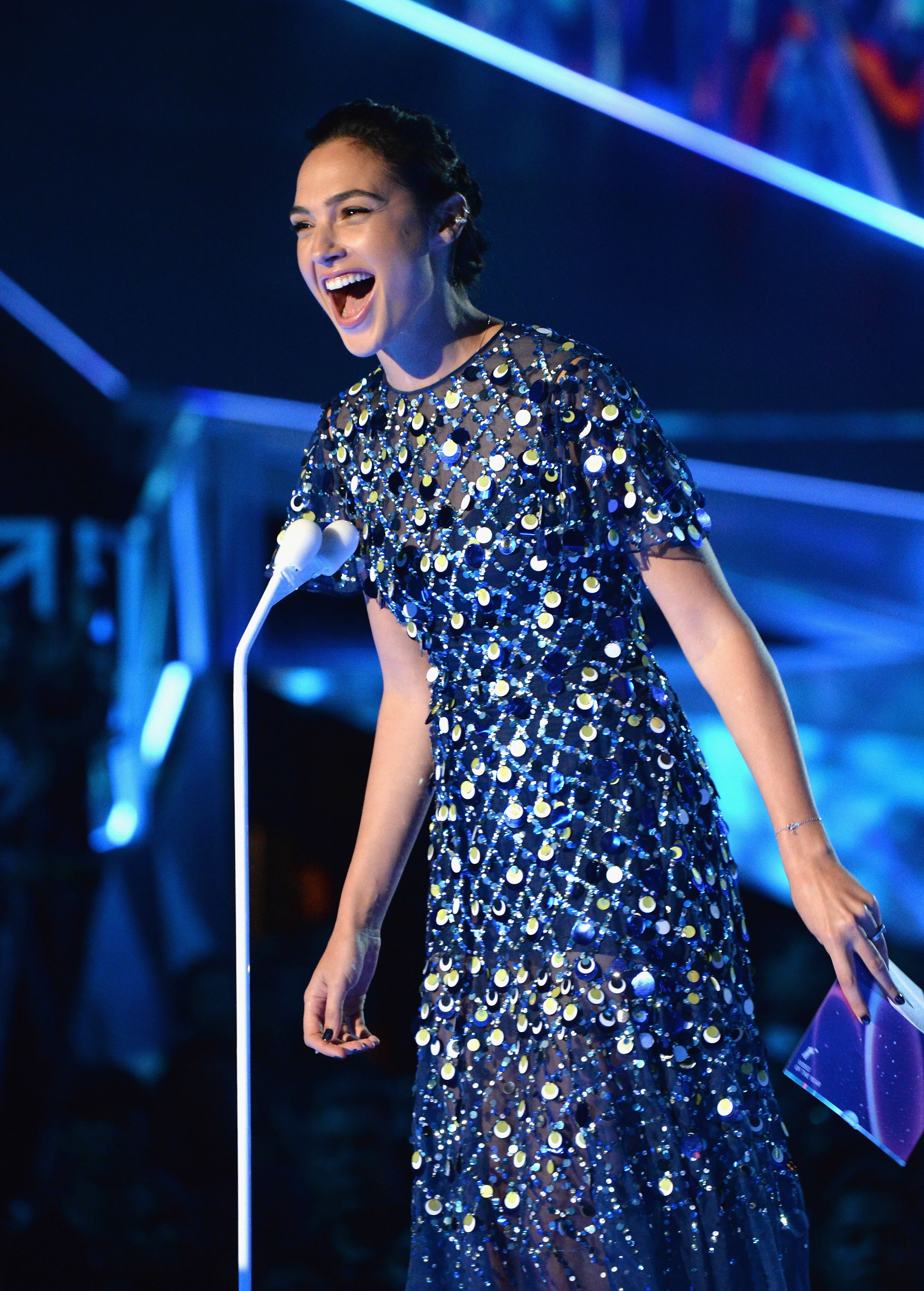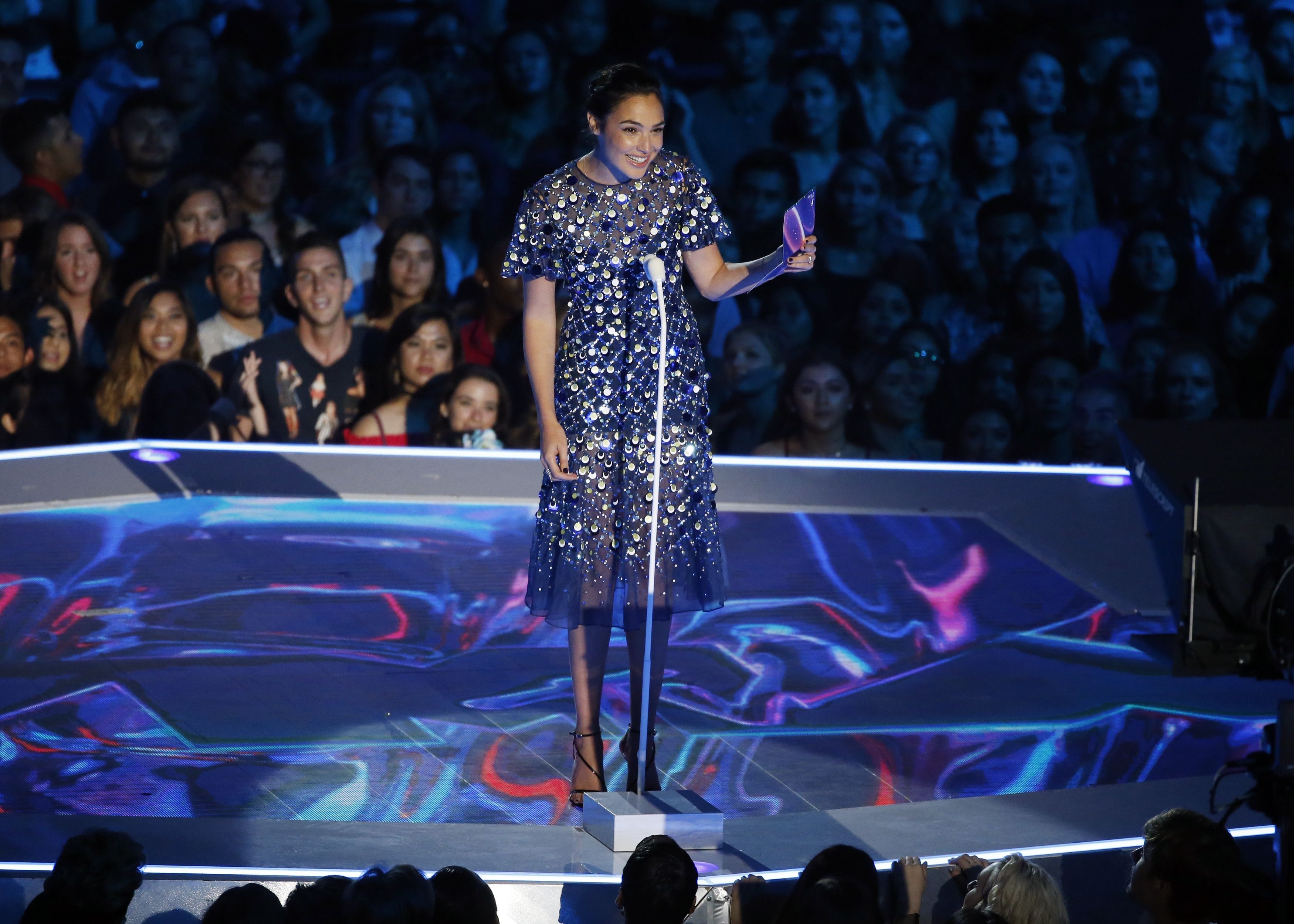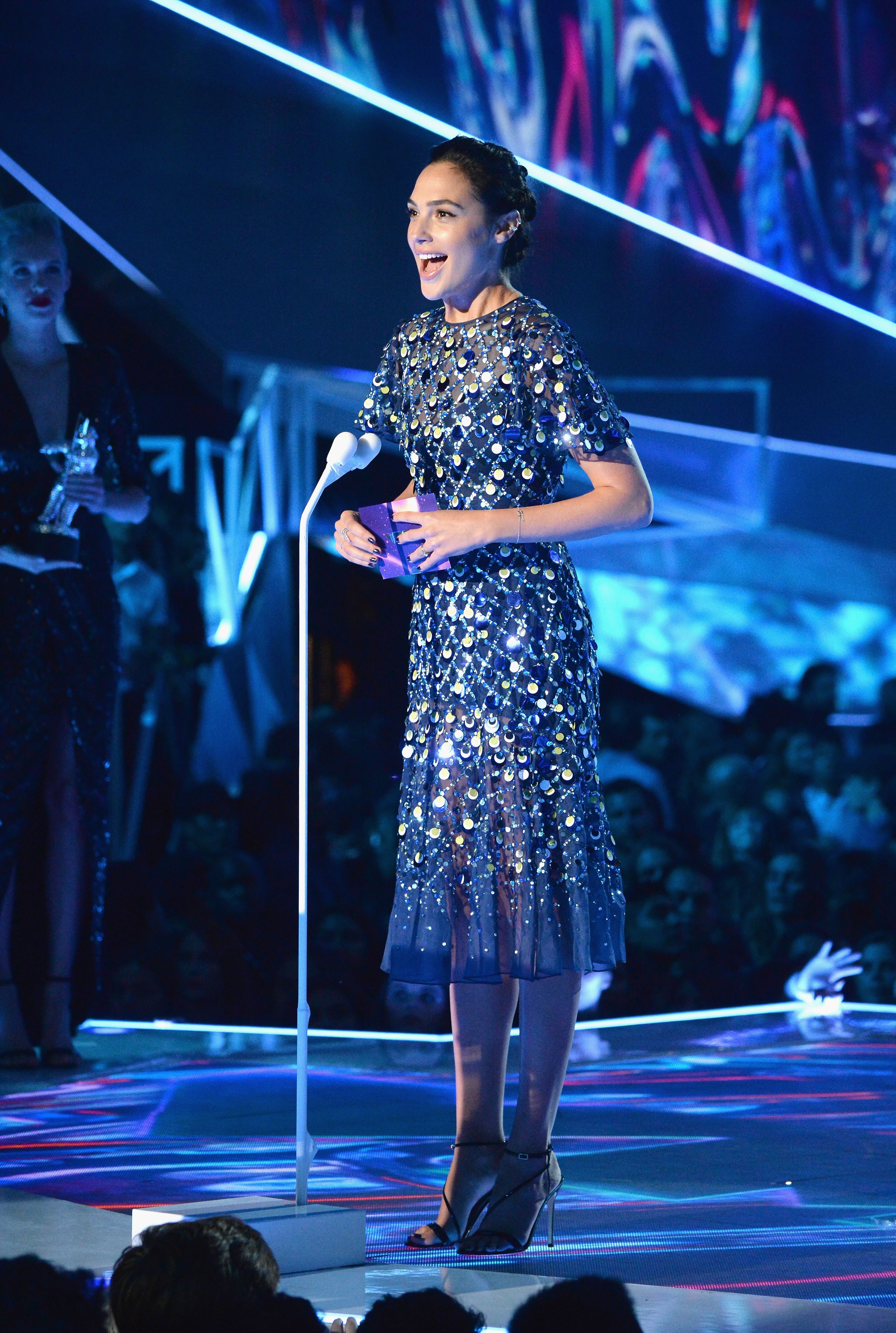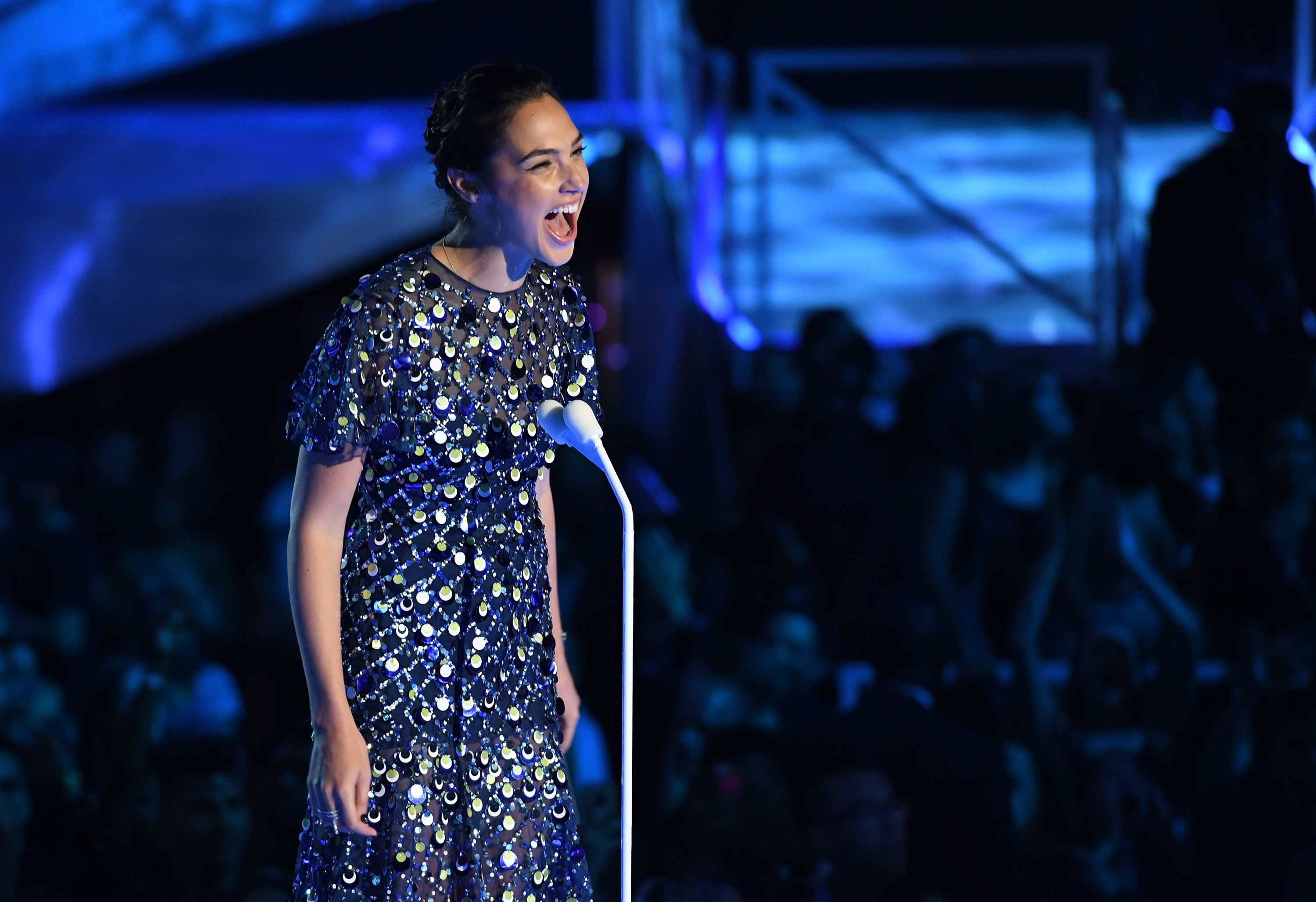Gal Gadot speaks onstage during the 2017 MTV Video Music Awards at The Forum on August 27, 2017 in Inglewood, California.
