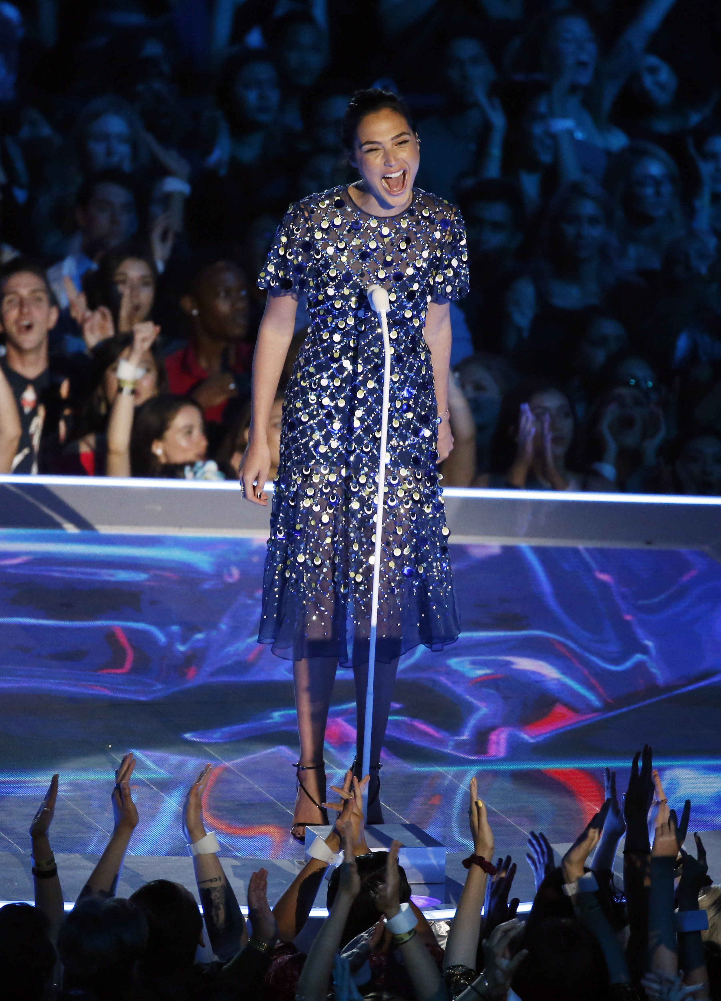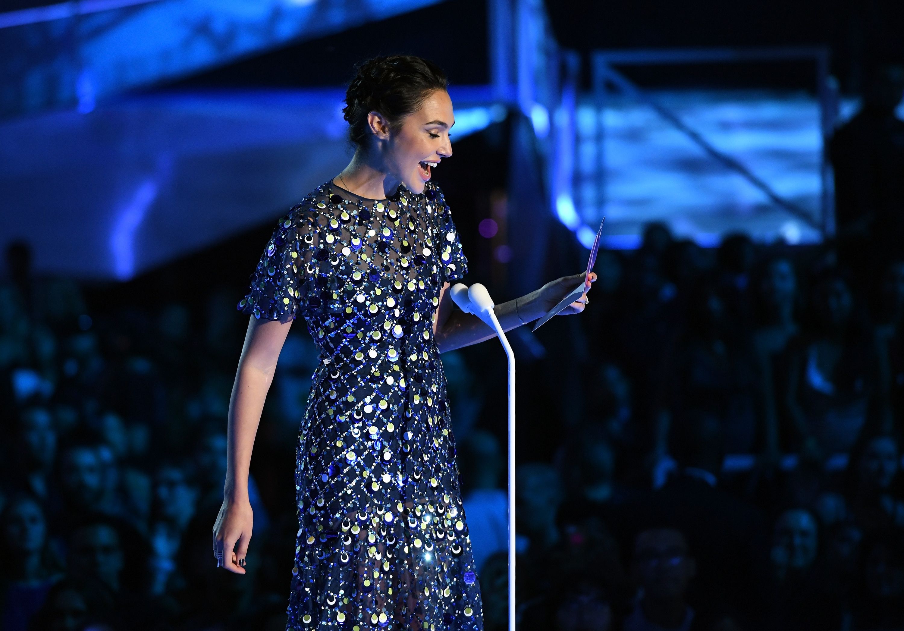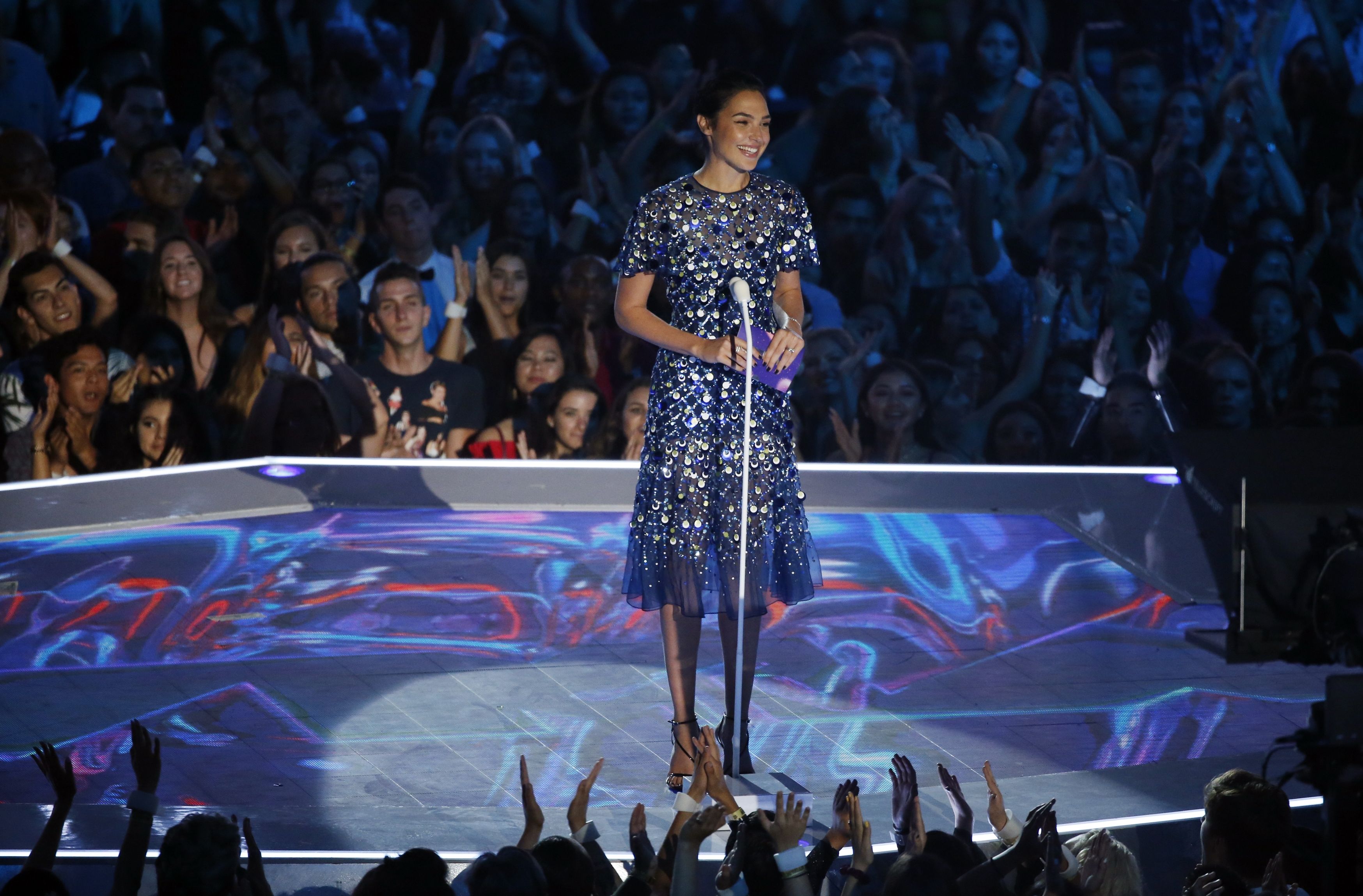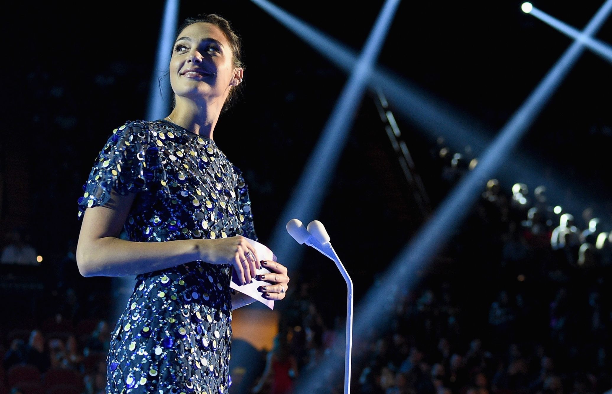 Gal Gadot speaks onstage during the 2017 MTV Video Music Awards at The Forum on August 27, 2017 in Inglewood, California.