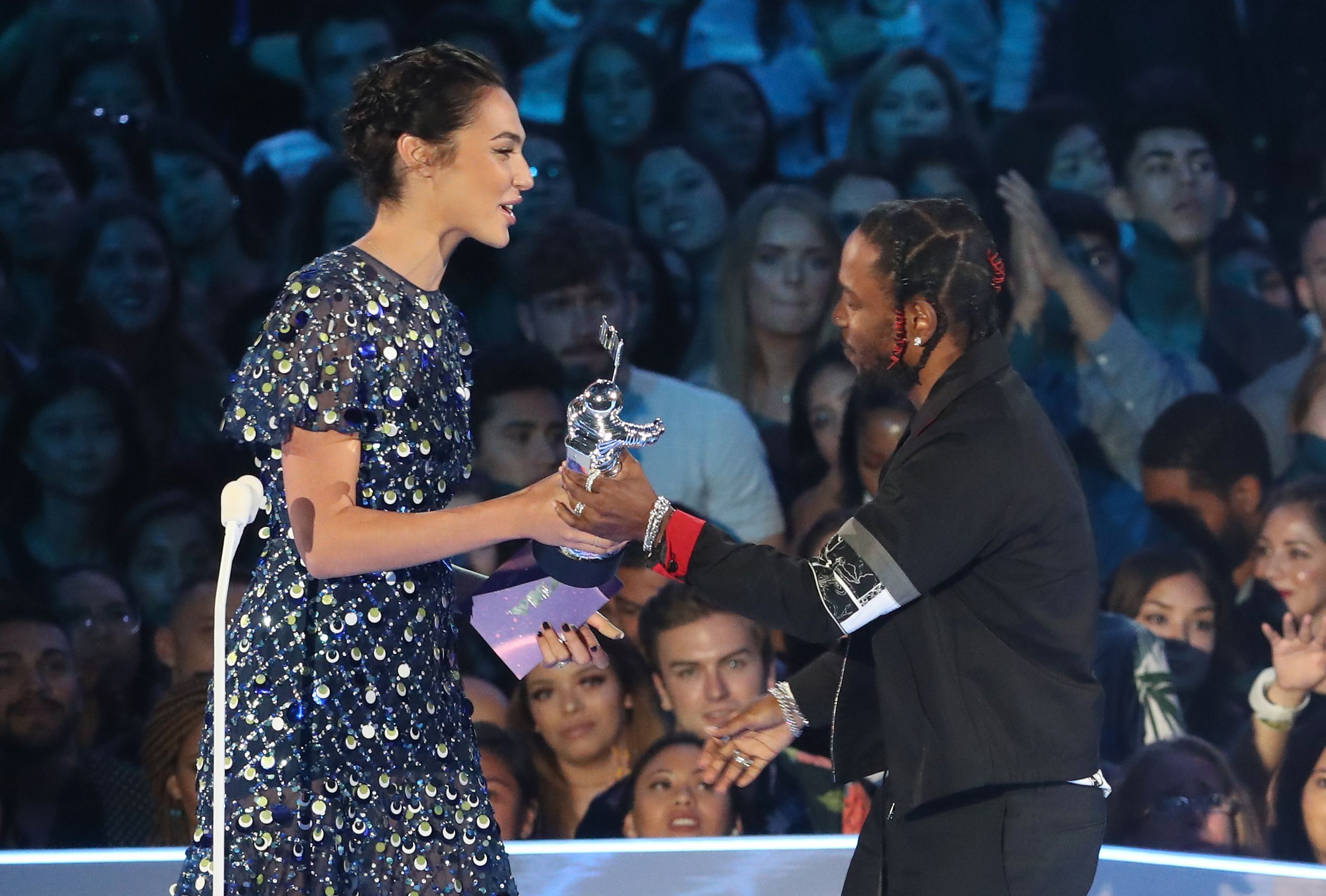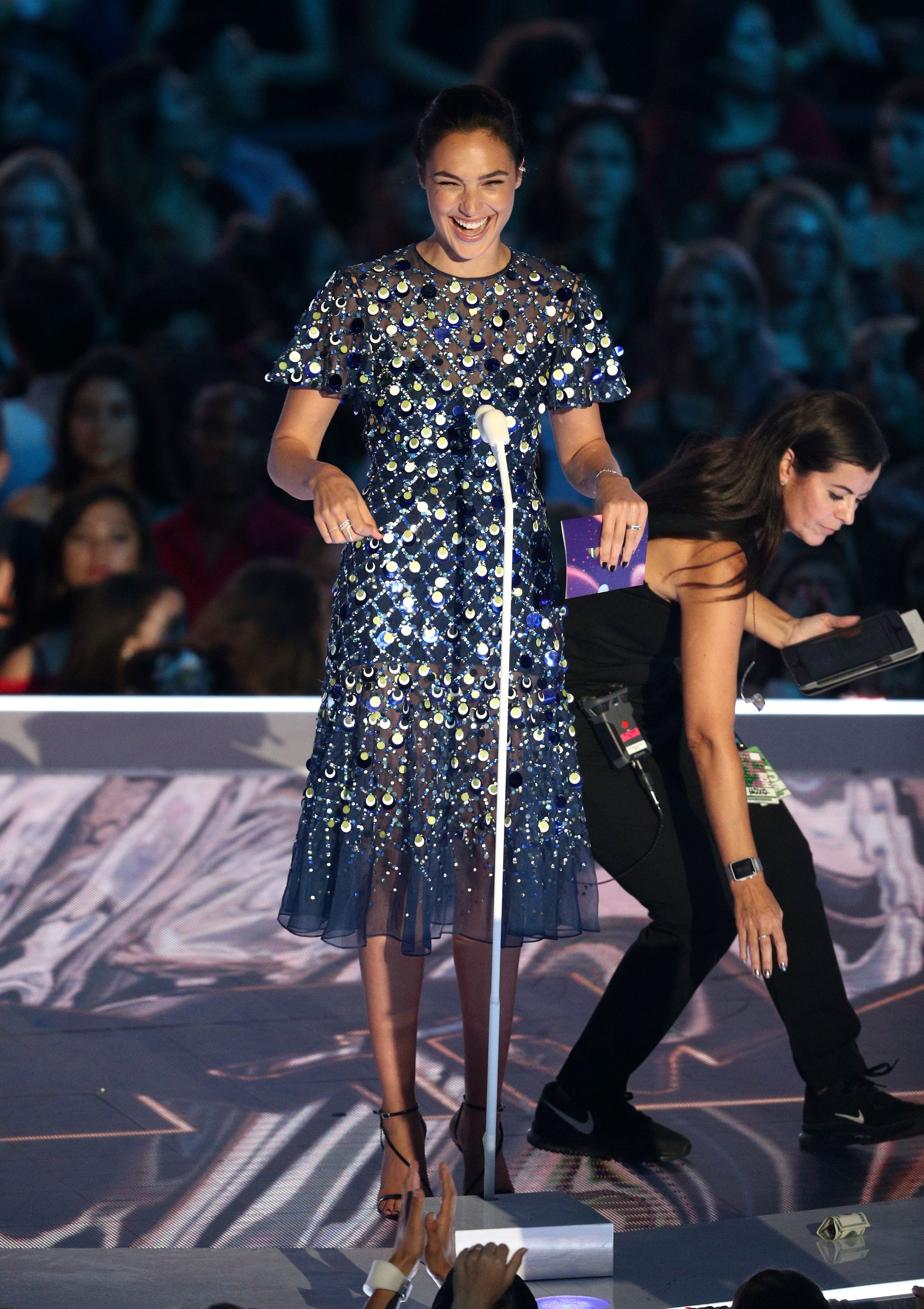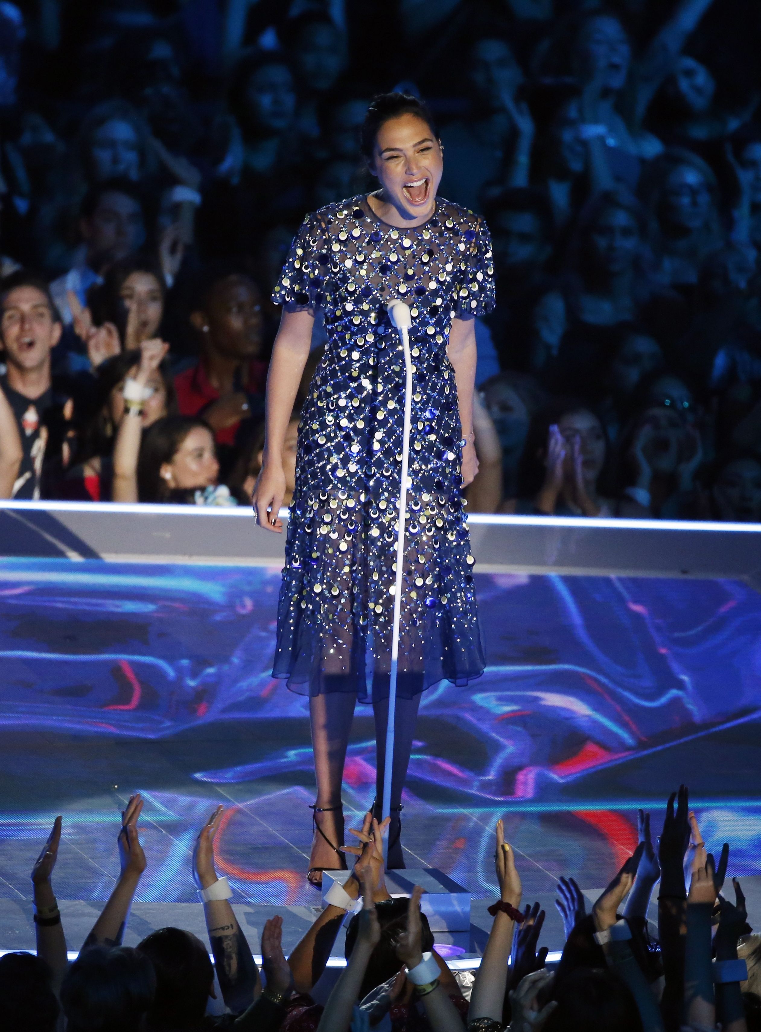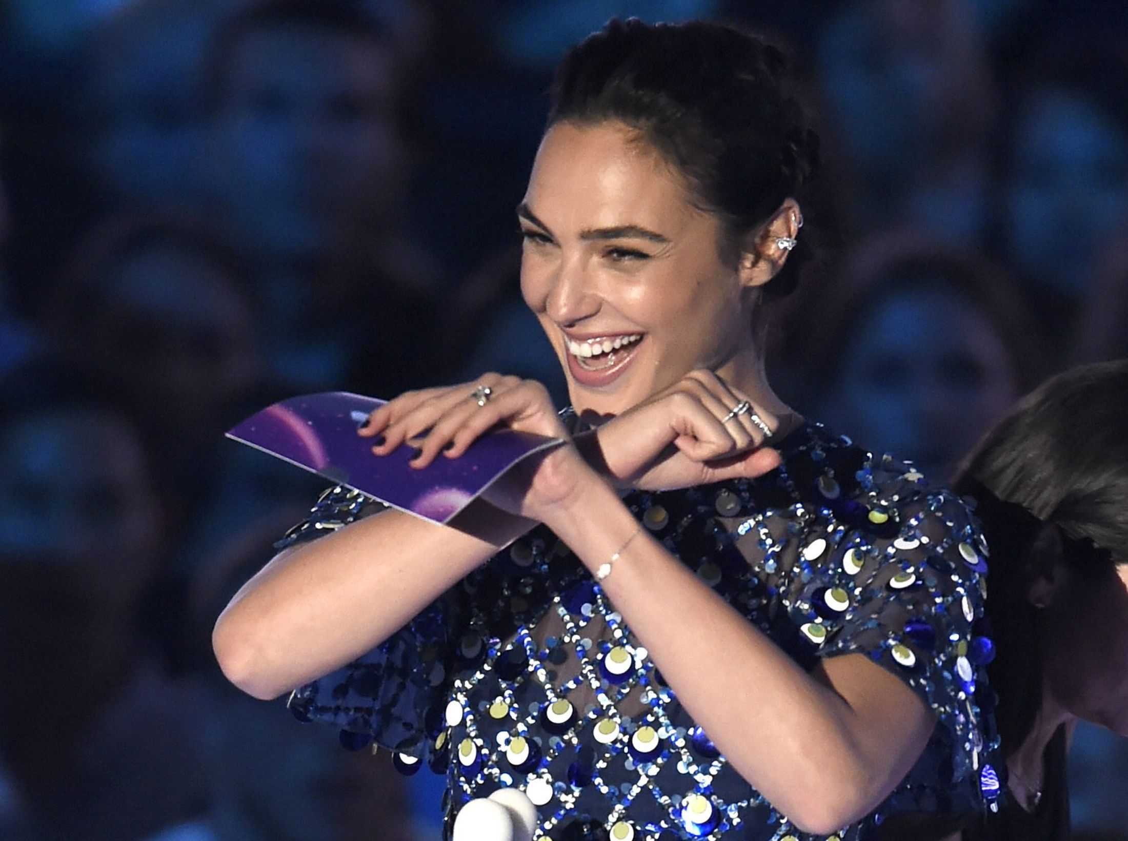 Gal Gadot speaks onstage during the 2017 MTV Video Music Awards at The Forum on August 27, 2017 in Inglewood, California.