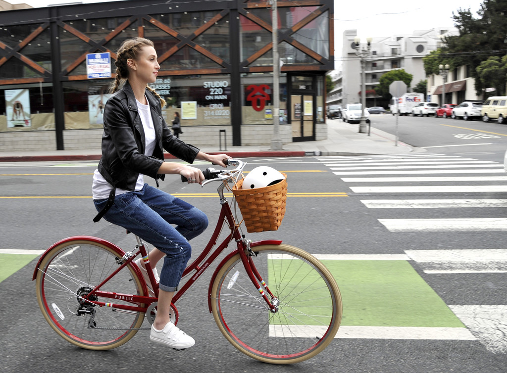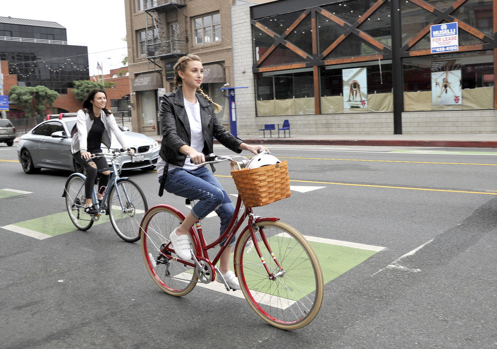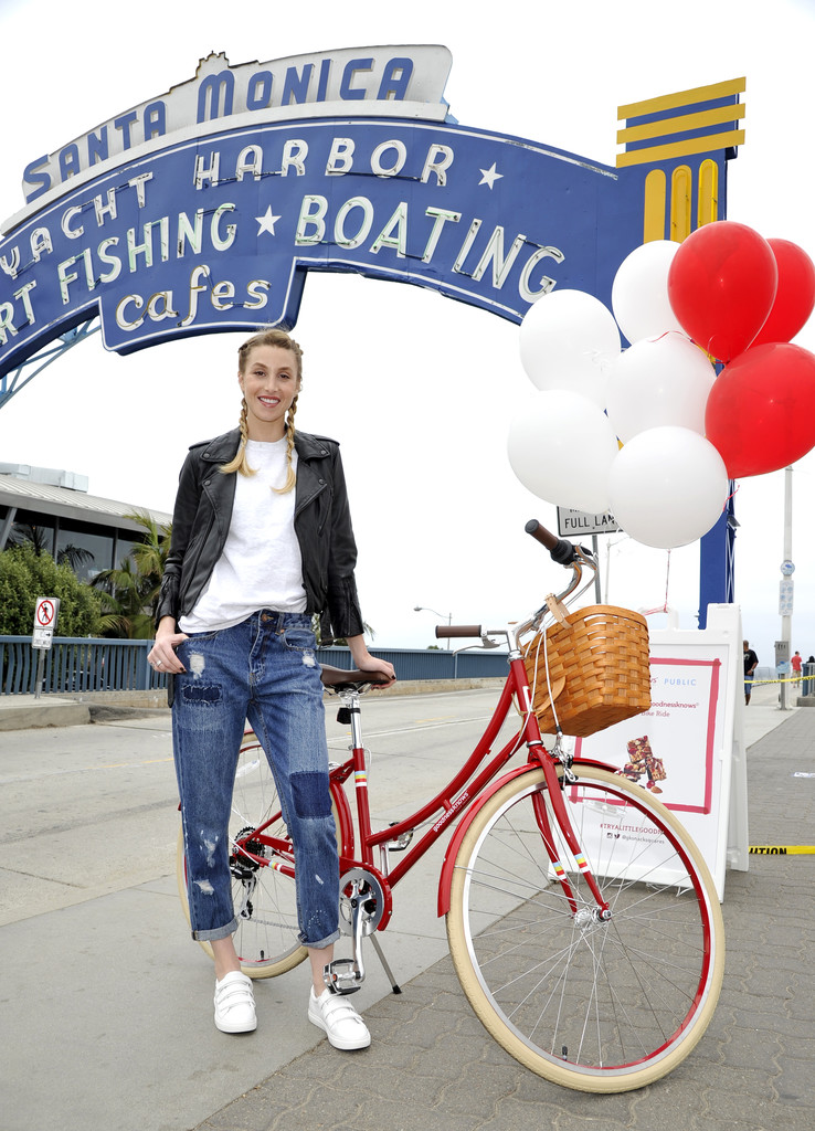 Whitney Port celebrates Los Angeles Bike to Work week with goodnessknows snack squares and Public Bikes with a group bike ride on May 18, 2016 in Santa Monica, California.