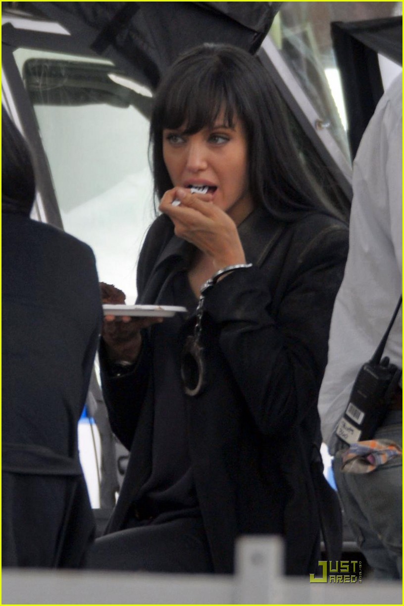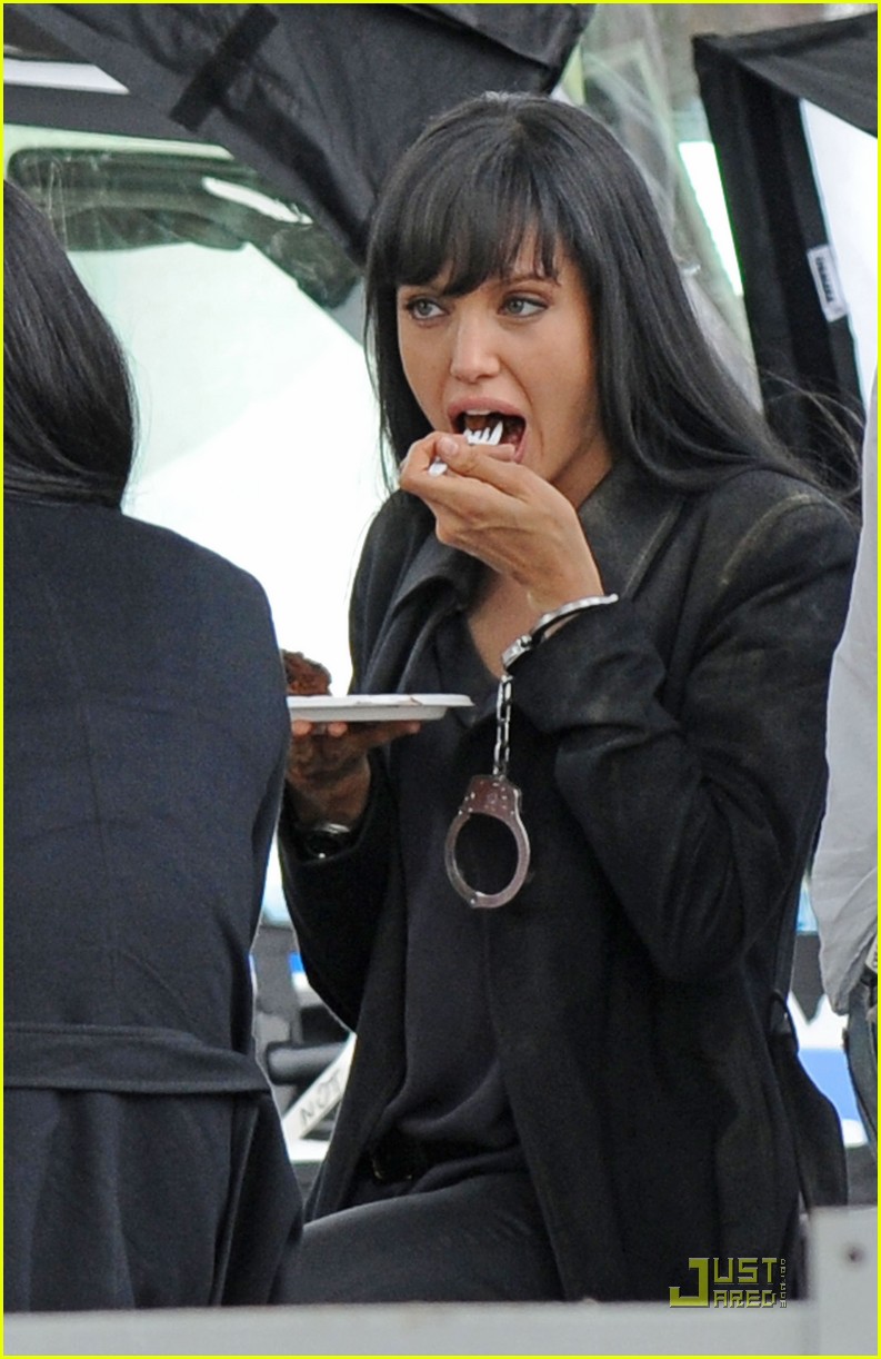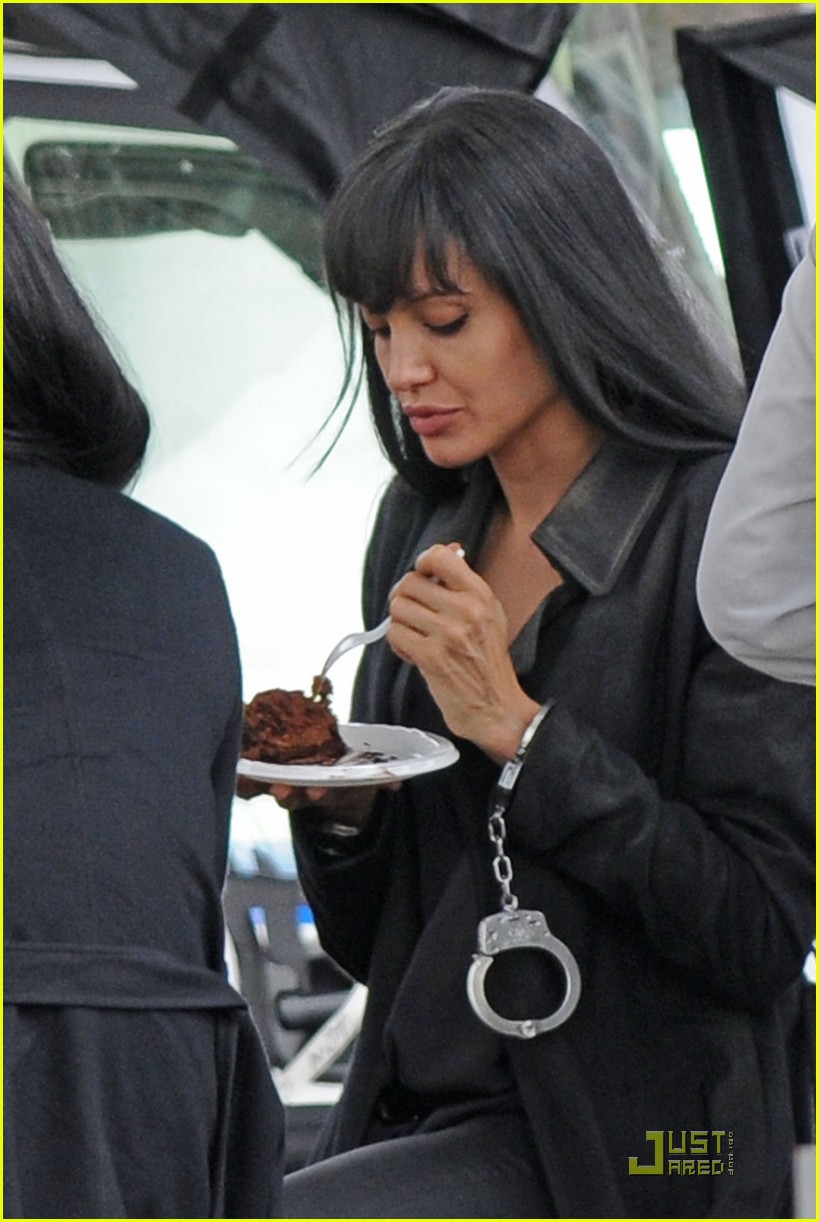Angelina Jolie takes a break on the set of her new movie Salt to enjoy a slice of chocolate cake for a crew member’s birthday on Sunday in Queens, New York.