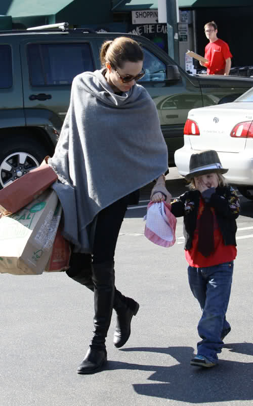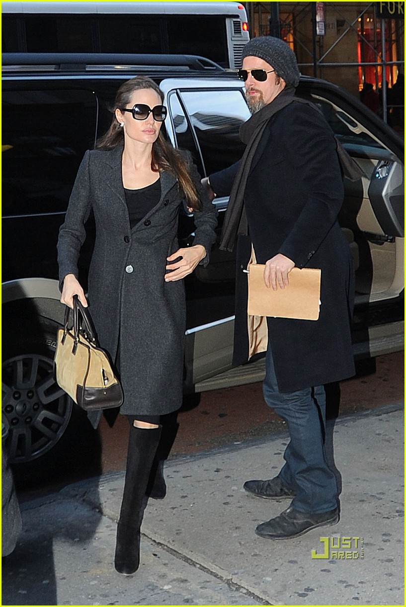FYI: Angie is wearing a grey charcoal coat, sunglasses and black suede boots — all from Ferragamo. She also toted around a Loewe “Amazona” Bag in Gold Suede. Brad is wearing 4 Stroke jeans, the Warsaw style in Arrestyourself.