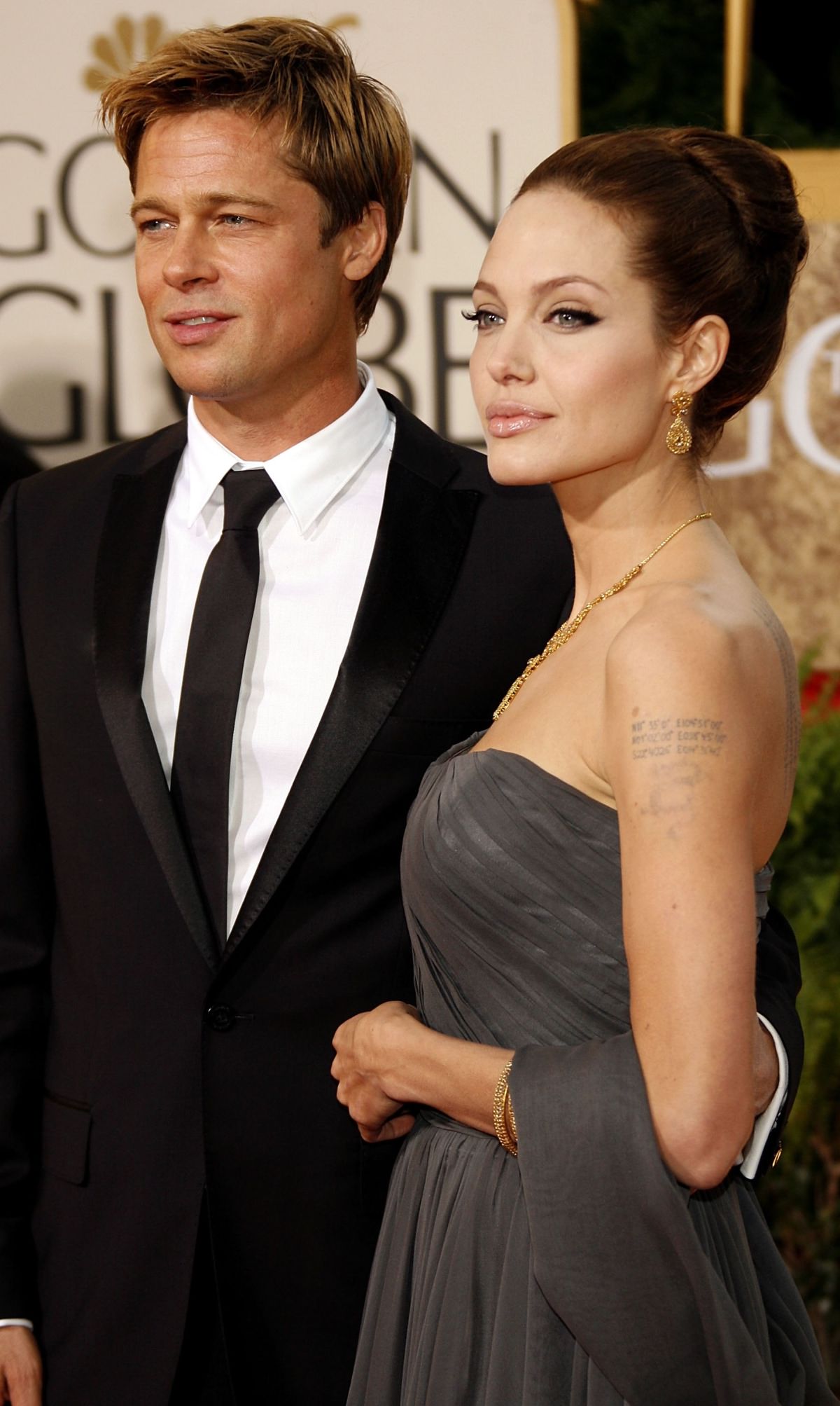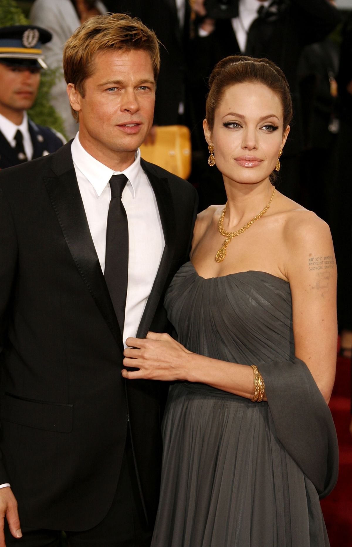 Angelina Jolie Jolie is majestic in her floor-length smoky grey gown by St. John. Her best accessory? A very dapper Brad Pitt.