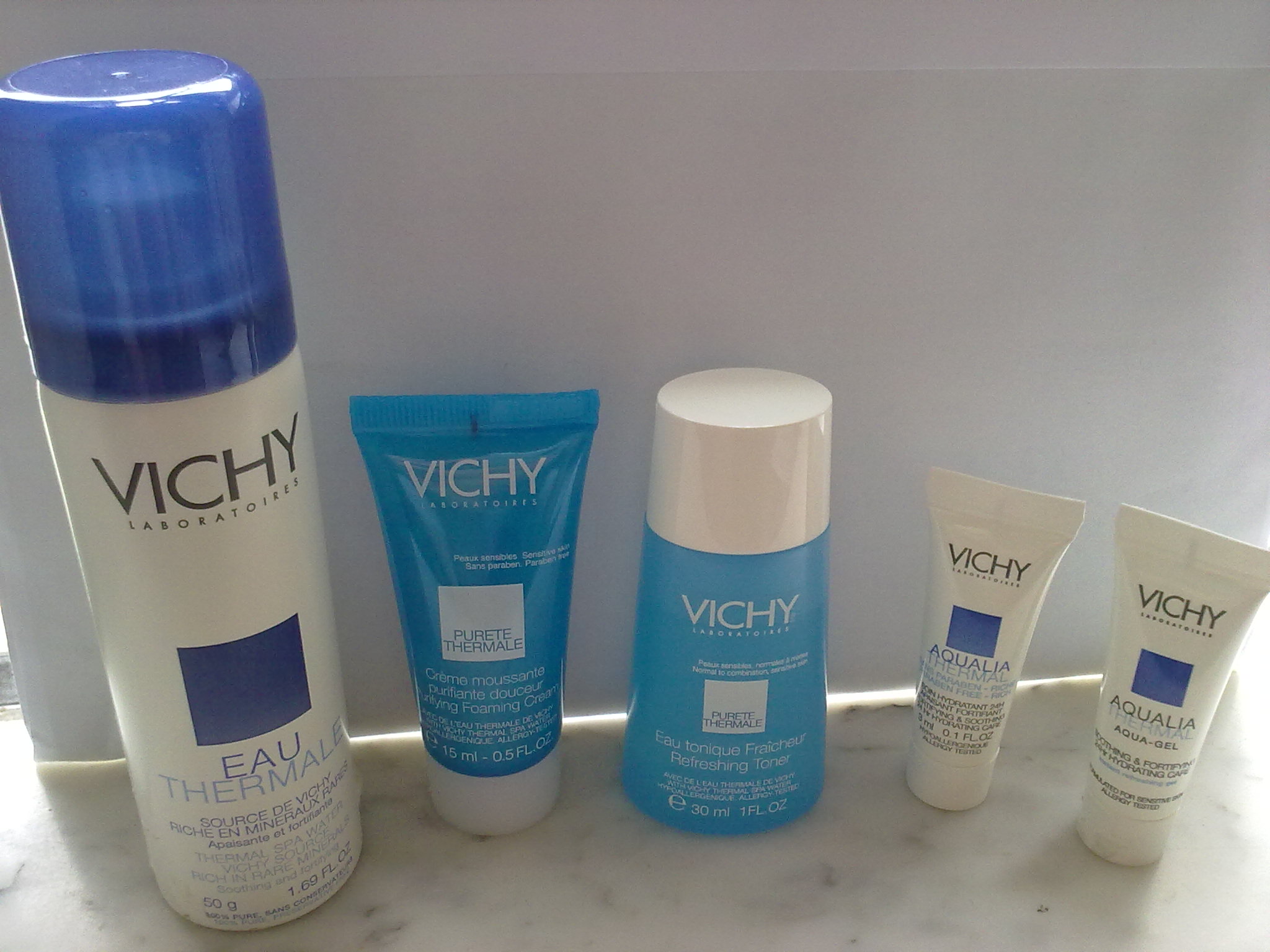 I'm using that Garnier one I mentioned but creamAnd I bought an Aqualia Thermal sample set from Vichy (Spa water spray: 50g, Toner: 30ml, Cleaner: 15ml, Night cream: 3ml, Aqua gel: 3ml).
