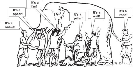 They began to argue about the elephant and everyone of them insisted that he was right. It looked like they were getting agitated. A wise man was passing by and he saw this. He stopped and asked them, "What is the matter?" They said, "We cannot agree to what the elephant is like." Each one of them told what he thought the elephant was like. The wise man calmly explained to them, "All of you are right. The reason every one of you is telling it differently because each one of you touched the different part of the elephant. So, actually the elephant has all those features what you all said."