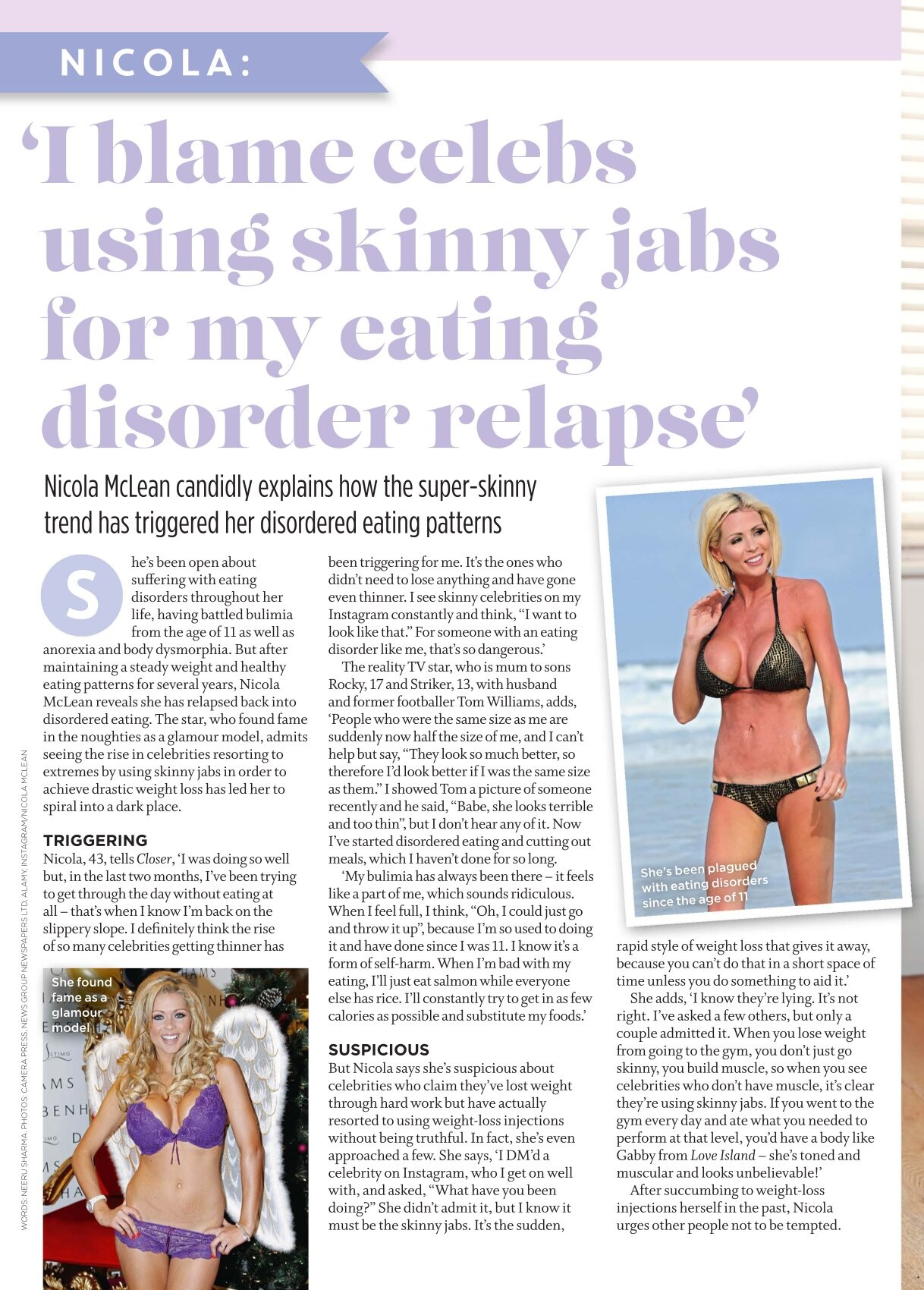Before becoming a model, McLean was an Army Cadet. She modelled for Page Three of The Sun newspaper between September 1999 and July 2004, and the Daily Star from 2000 until 2006. One of the UK's most successful glamour models, she appeared on Page 3 in The Sun and The Daily Star almost every week for around 5 years - notching up almost 300 appearances in total. After having her bust increased from 32C to a 32E in 2004, she left The Sun and continued doing Page Three for The Daily Star, until she became pregnant in 2006. In November 2007, she underwent her second breast enlargement, which took her up to a 32G. McLean came fourth in The Sun poll for the "Best Page 3 Girl Of All Time," beating Samantha Fox, Jo Hicks, Leilani Dowding and Jordan,who's rivalry with McLean has been widely publicised[7]. In addition to Page Three, she also appeared on the cover of Lad's Mags including Zoo, Nuts, Front, Loaded and Ice. During her time as a glamour model, McLean often featured on tabloid showbiz gossip pages, and latterly as a guest on television shows including The Weakest Link (Page 3 special), Richard & Judy, The Big Breakfast, Test The Nation (WAGs Special) and The Sexiest Girls In Britain. McLean retired from modelling in 2006 after giving birth. She decided to return to modelling, TV work and acting in early 2008 after being asked to feature as a main star in the Channel Five TV documentary, Help! I've Got A High Maintenance Wife. Since then, she starred in the TV show, 'WAGS' World... With Nicola McLean' on Wedding TV and Channel Five's Generation Sex. She returned to glamour modelling assignments in February 2008 with the Daily Star, and has also appeared on more Lad's mags covers. McLean was a contestant in the November 2008 edition of ITV's reality TV show I'm A Celebrity, Get Me Out Of Here! where she notoriously celebrated her 'boobs first birthday'. Rumours that she was paid a fee of £7,500 - the show's lowest appearance fee yet - were dismissed by Nicola, "I earned a lot more money than £7,500! There's no way I would have gone in to the jungle for two weeks, in those awful conditions, for a tiny fee of £7,500! The newspapers do make-up such rubbish sometimes. I got paid a generous fee that I was very happy with" said Nicola. On 22 November 2008, it was announced that she had been chosen by Ultimo to model their range of D-G cup bras. Appearing on The Cafe on 16 January 2009 McLean became irritated at host Aidan Power's repeated mispronunciation of her name, revealed her boobs had had their first birthday in the jungle and was confused when fellow guest Daithí Ó Sé misheard her say she was intending to grow a third boob. She scored a total of 14 in the darts and despite it being near the bottom of the scoring tried to move herself to the top and failed, being unable to reach she settled for third.