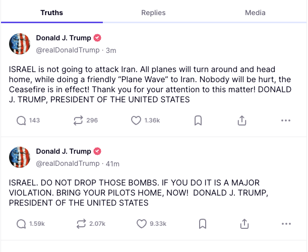 He started this war by tweeting like the puppet of Israel/US MIC with boasting & threats (including regime change) and now that Iranian missiles are blowing up Israeli buildings he backtracks to "Man of Peace" mode...