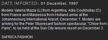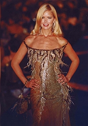 November 3, 1995. Model Amber Valletta recruited several high profile models for a special Versace fashion show to benefit the Tulsa Community Food Bank. The leggy cast will be in Oklahoma for a New York-style fashion show. Supermodels Stepping Out Against Hunger will be at 8 p.m. Nov. 11 at Tulsa's Brady Theater. With designs by Gianni Versace, the show is expected to be a sellout. Other models scheduled are Isabella Rossellini, Shalom Harlow, Valeria Mazza and Stephanie Seymour. Following the show, patrons will be able to meet the models at a party at The Top of The First. The Tulsa show will feature Gianni Versace's spring and fall collections.