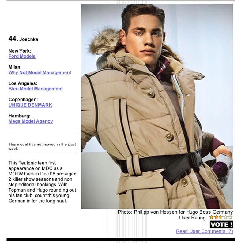 Angency:Unique (Copenhagen), Ford (New York), Why Not (Milan), Bleu Model Management (Los Angeles), and Mega (Hamburg)