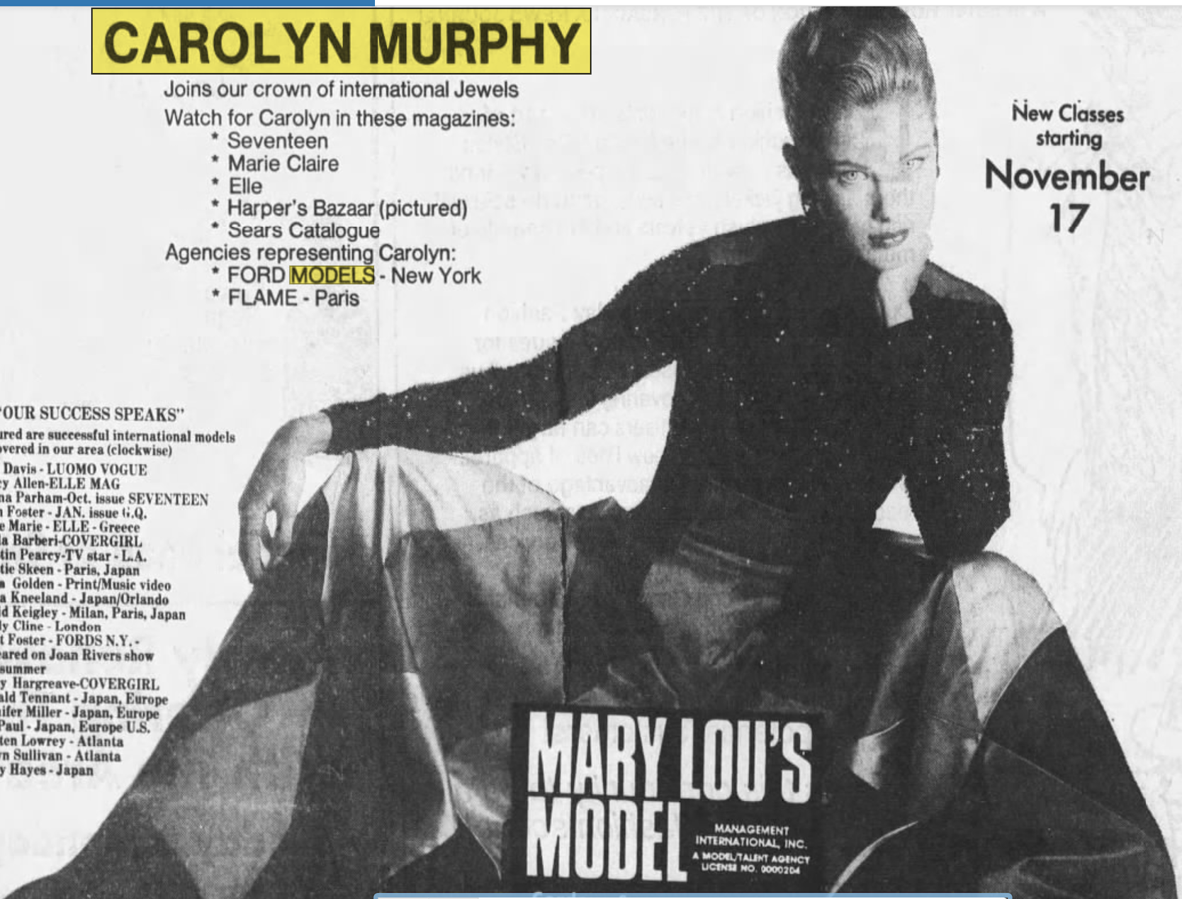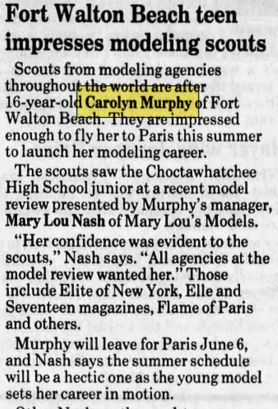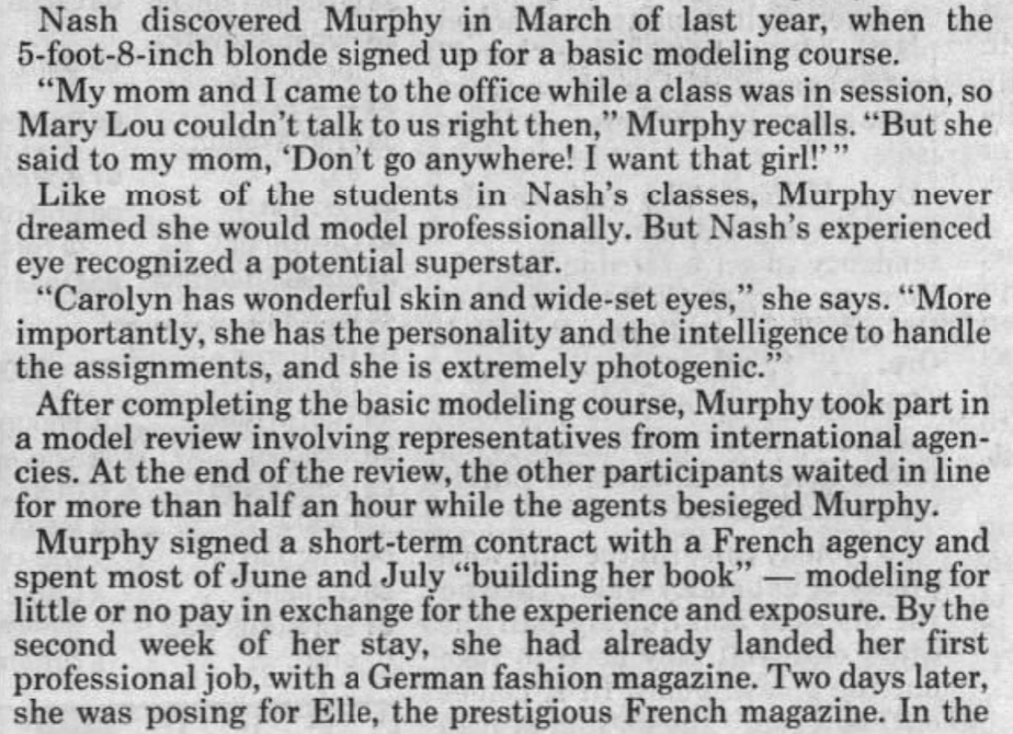 This one is from 1991 talking about the previous year (1990)-- she then signed with Ford in March 1991