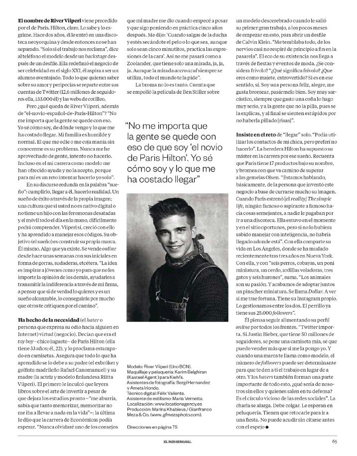 But, what remains of River Viiperi, other than “Paris Hilton’s Spanish boyfriend”? “I don’t care if people are stuck on that. I know what I’m like, where I came from and how hard it has been for me to get where I am. Mine is an average family of modest means. Anyone who hates me or has it in for me, that’s his problem. I’ve never taken advantage of people; I try not to. Even in my career as a model I’ve been offered help but I haven’t accepted it, because for me it’s a challenge to try to do it all by myself.”