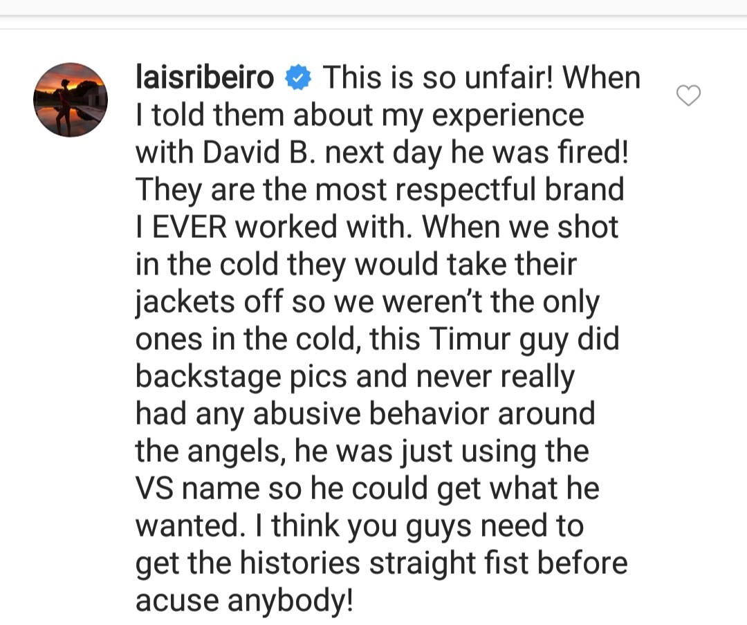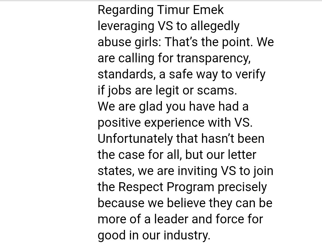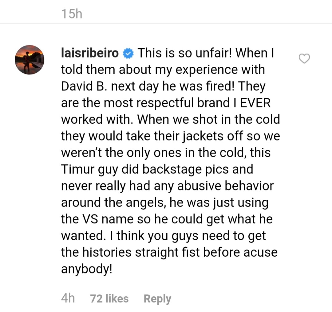 I am so happy the girls went off with this Timur bullshit, he has never worked for VS and you can't blame the brand for people who have no business with them for trying to use their name for fame and get girls. And yall love to talk shit about Ed Razek about him being a creep but from what I've heard from many of the models is that he is 100% a good dude who has never even remotely been inappropiate with the girls and they all love and respect him, also that letter? Look at the list, how many of those models have ever worked for VS? Not that many, but a lot of them however, have been rejected by VS. I agree Sara, these people are jumping on the VS hate bandwagon for no reason.