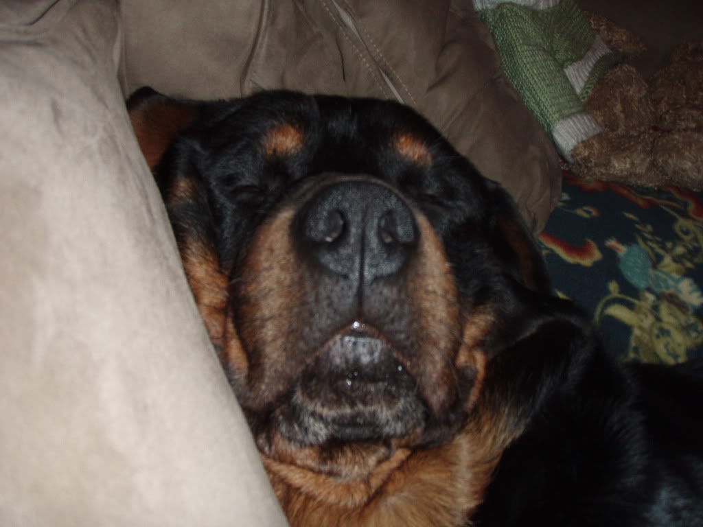Hmmm? I believe that's a Rottweiler breed? The skull is of medium length, broad between the ears. The forehead line is moderately arched as seen from the side, with the occipital bone well developed without being conspicuous. The stop is well defined. The Rottweiler nose is well developed, more broad than round, with relatively large nostrils and always black. The muzzle should appear neither elongated nor shortened in relation to the cranial region. The nasal bridge is broad at the base and moderately tapered. The lips are black and close fitting with the corner of the mouth not visible. The gums should be as dark as possible. Both the upper and lower jaws are strong and broad. According to the FCI Standard Rottweilers should have strong and complete dentition (42 teeth) with scissor bite, the upper incisors closely overlapping the lower incisors. The zygomatic arches should be pronounced. The eyes should be of medium size, almond-shaped and dark brown in colour - but, unfortunately I'm unable to see those in the picture you've provided. The eyelids are close fitting. The ears are medium-sized, pendant, triangular, wide apart, and set high on the head. With the ears laid forward close to the head, the skull appears to be broadened. The skin on the head is tight fitting overall. When the dog is alert, the forehead may be slightly wrinkled. I must confess I'm unaware of the significance of this picture - but I hope my diagnosis is correct?