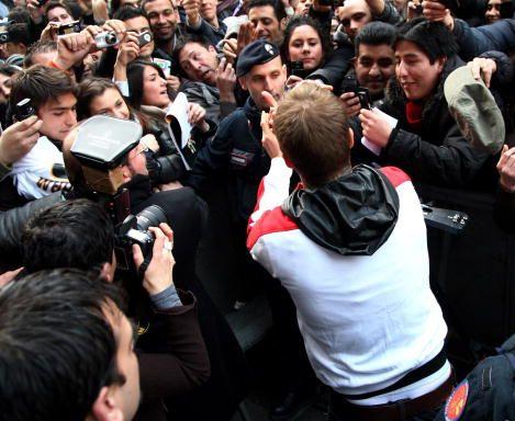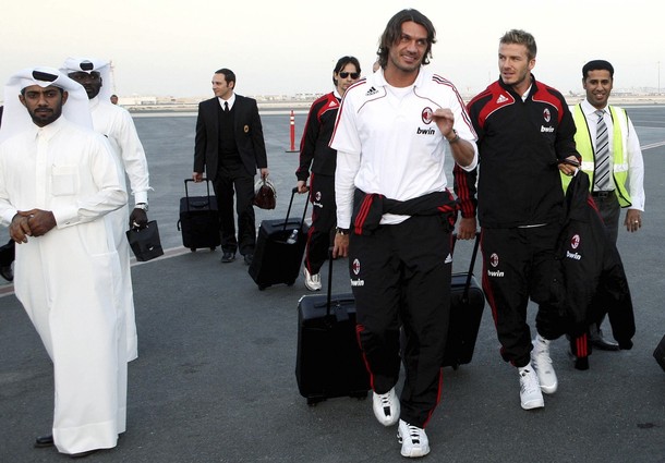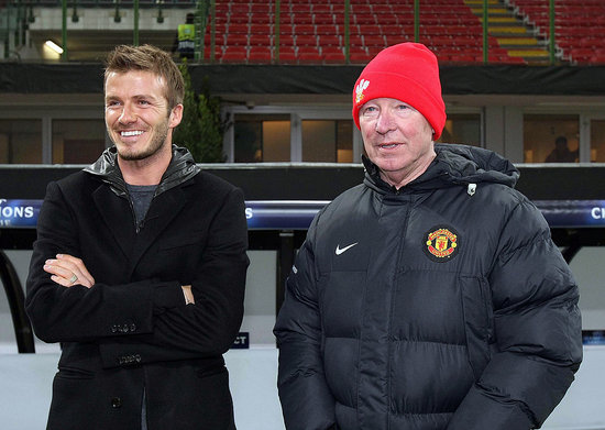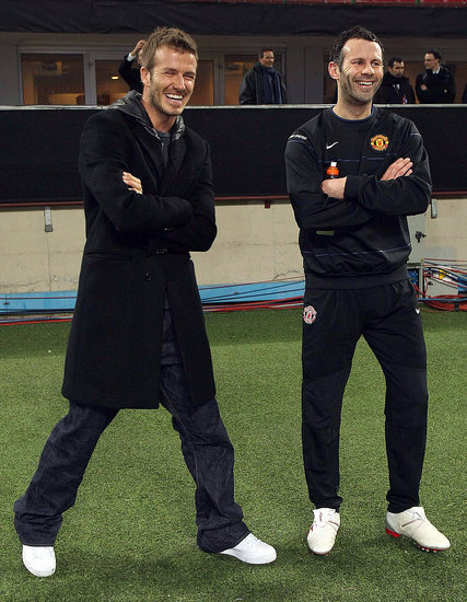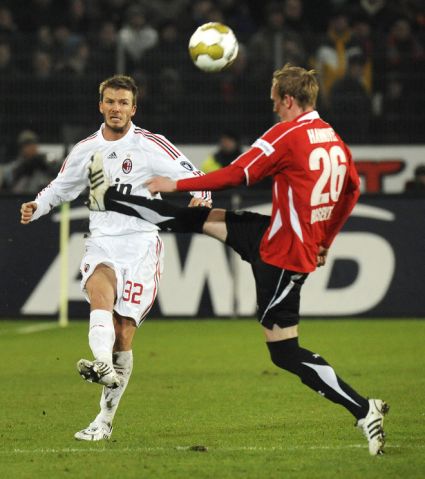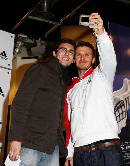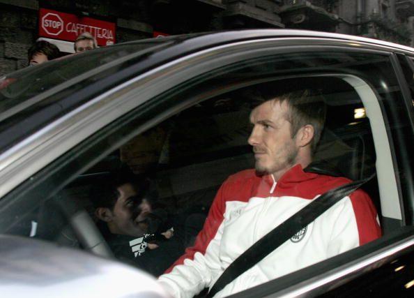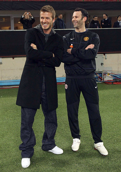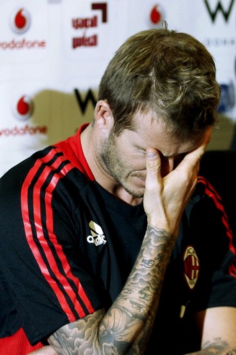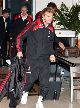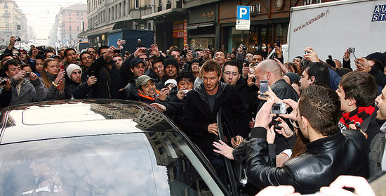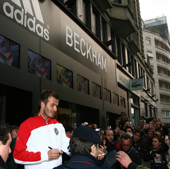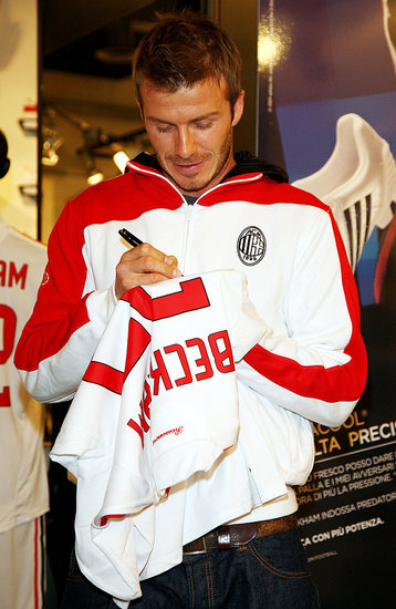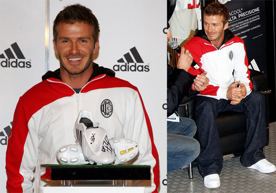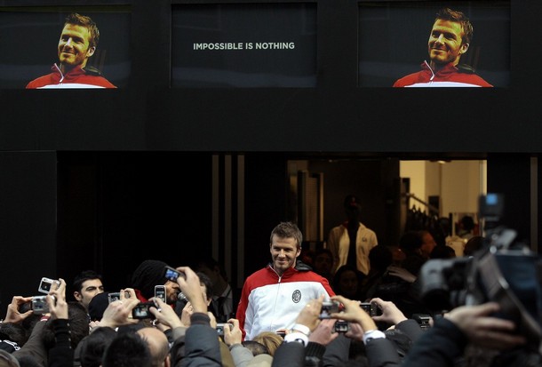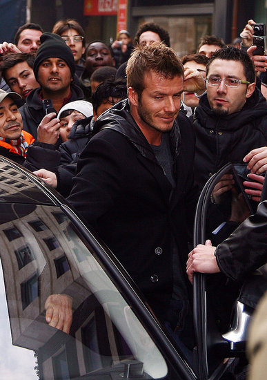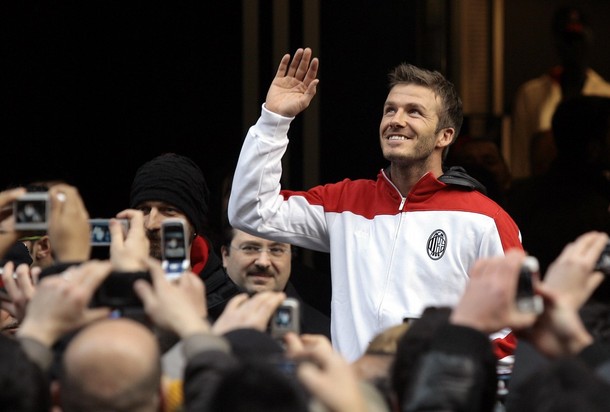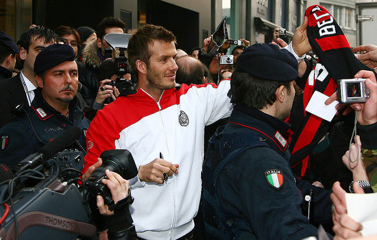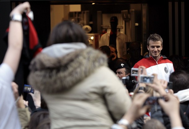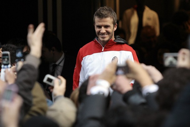 English soccer star David Beckham waves to the fans during a presentation at the Adidas store in downtown Milan February 23, 2009.