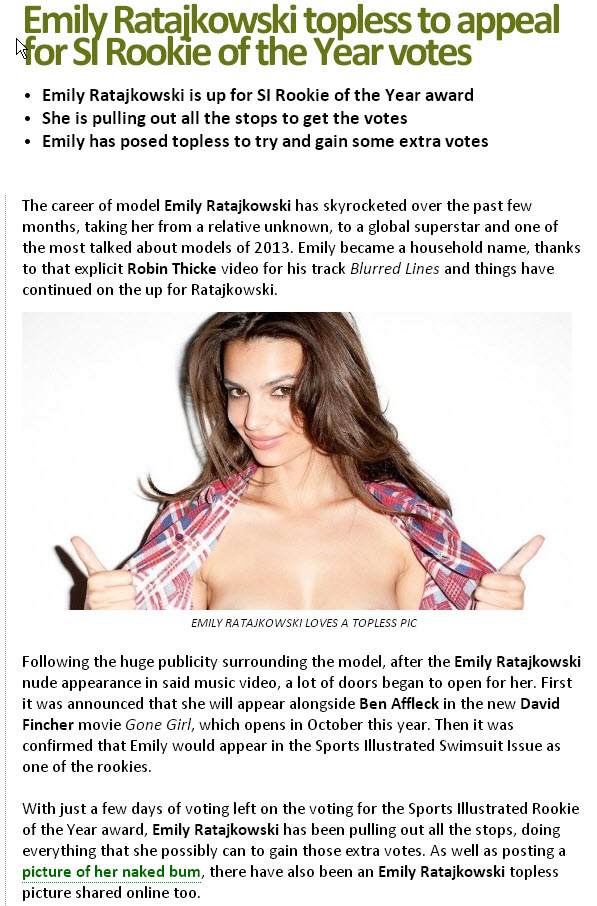 The best pair of boobs in SI this year. Yeah, Kate's are bigger, and I like Kate Upton, but Emily just has an impressive rack. The rest of her is amazing too.