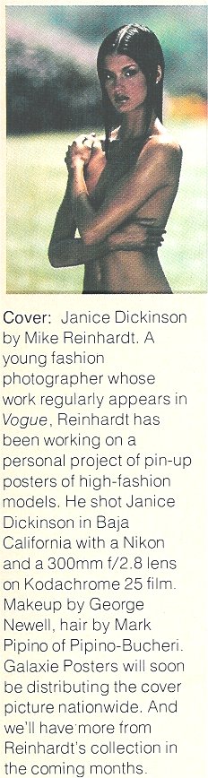 Janice Dickinson on the cover of Vogue.Janice Doreen Dickinson (born February 17, 1953 in Brooklyn, New York), is a former supermodel of Polish and Belarusian descent who started modeling at the age of 14. At 5'10", she has appeared on the covers of Vogue, ELLE, Harper's Bazaar Swimsuit Issue, Cosmopolitan and Playboy. She has also appeared in ads for Revlon, Max Factor and Clairol. Dickinson is the author of three books, including No Lifeguard on Duty: The Accidental Life of the World's First Supermodel, Everything About Me Is Fake... And I'm Perfect and Check, Please! : Dating, Mating, and Extricating. Besides writing and modeling, she is a photographer and a mother of two, Nathan and Savannah. She has been divorced 3 times. Her former husbands are Ron Levy, Alan B. Gersten, and Simon Fields.