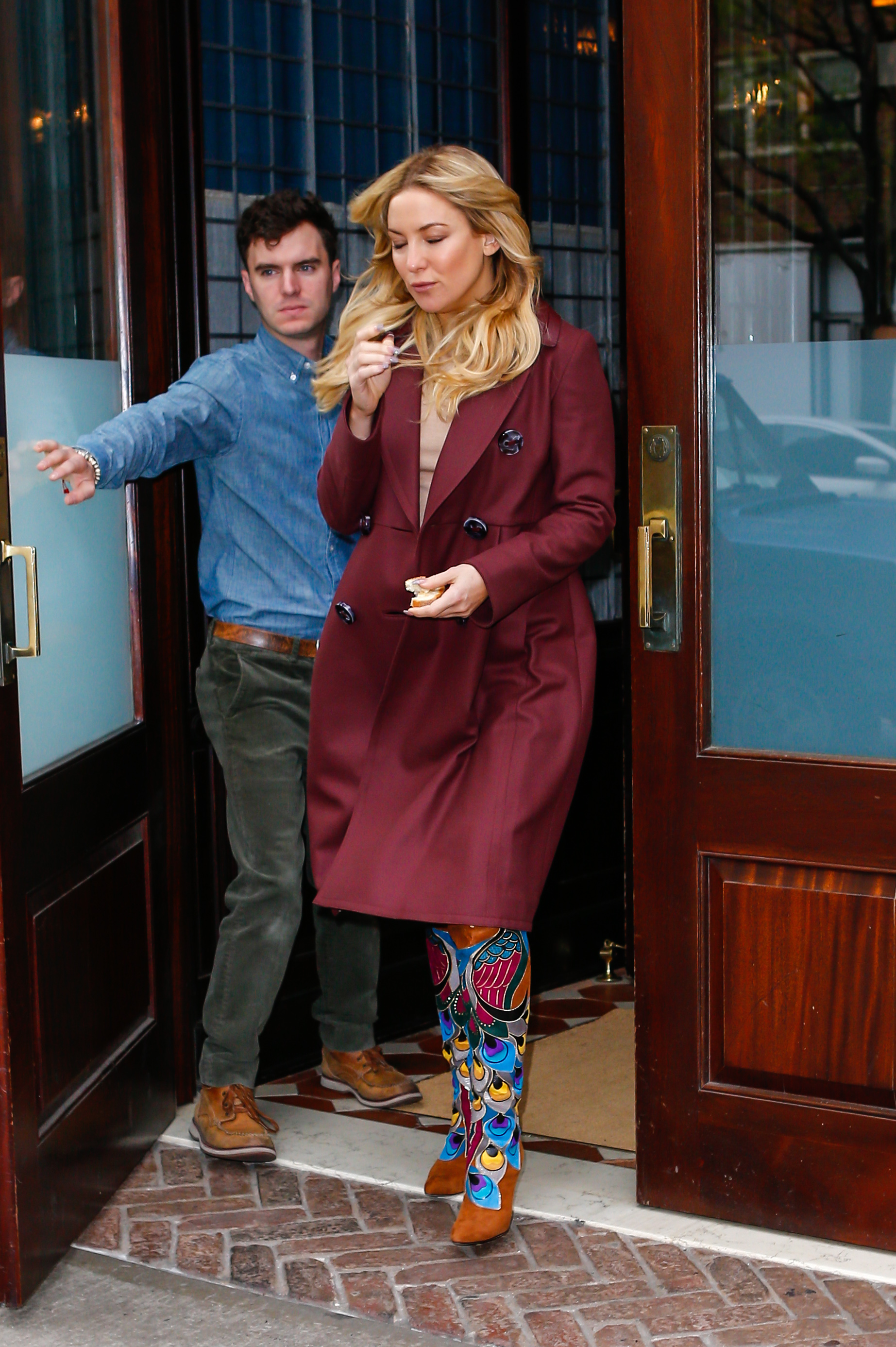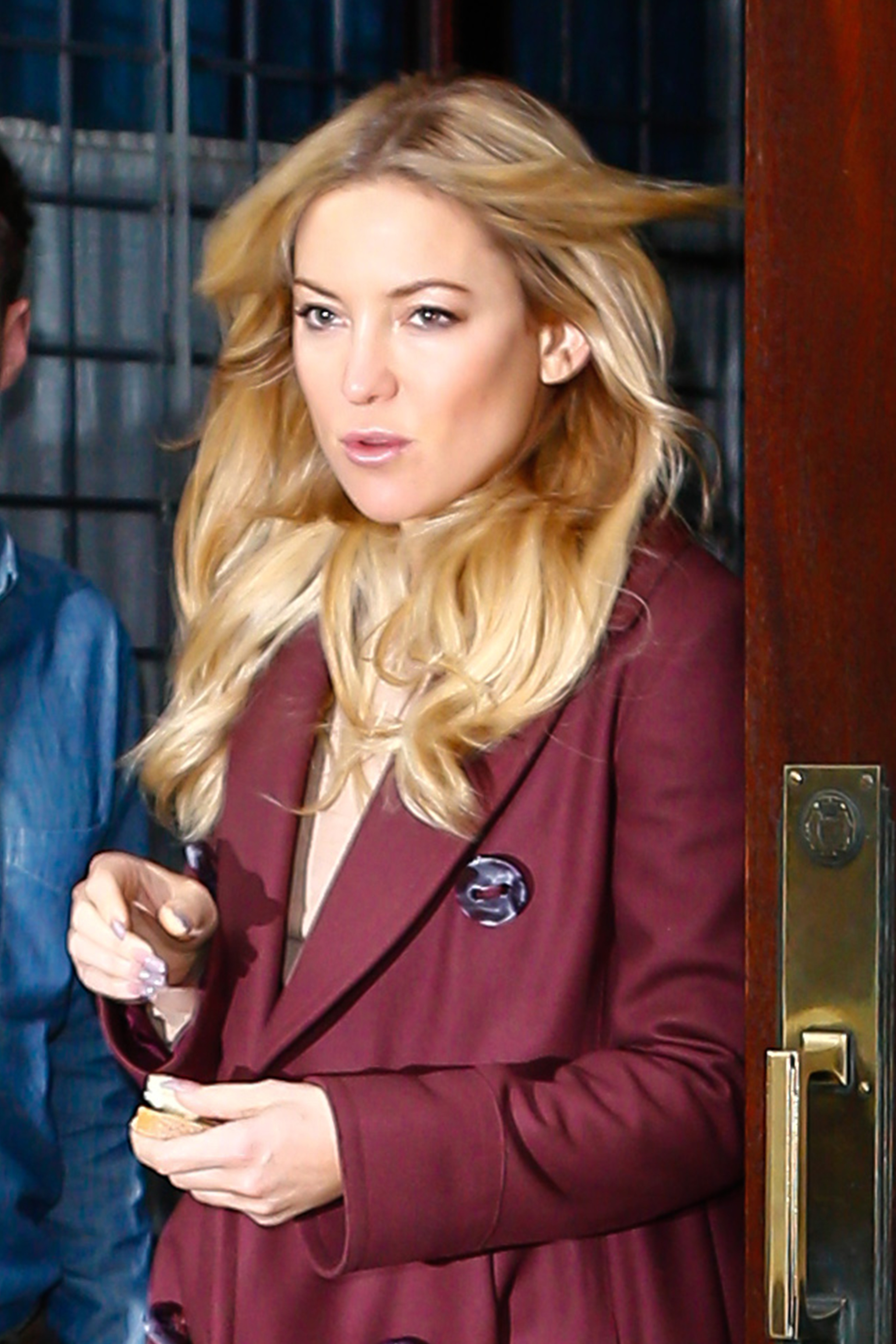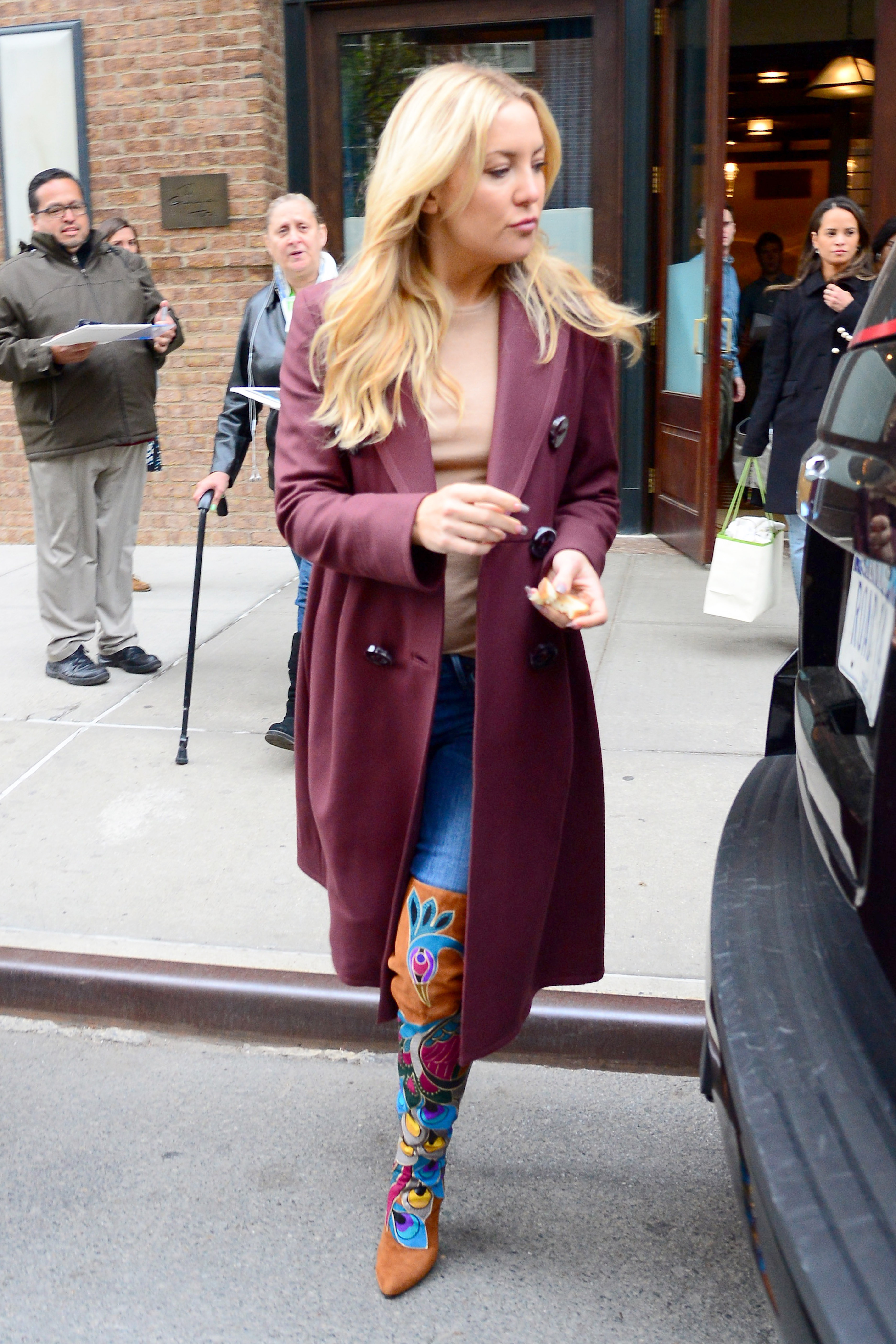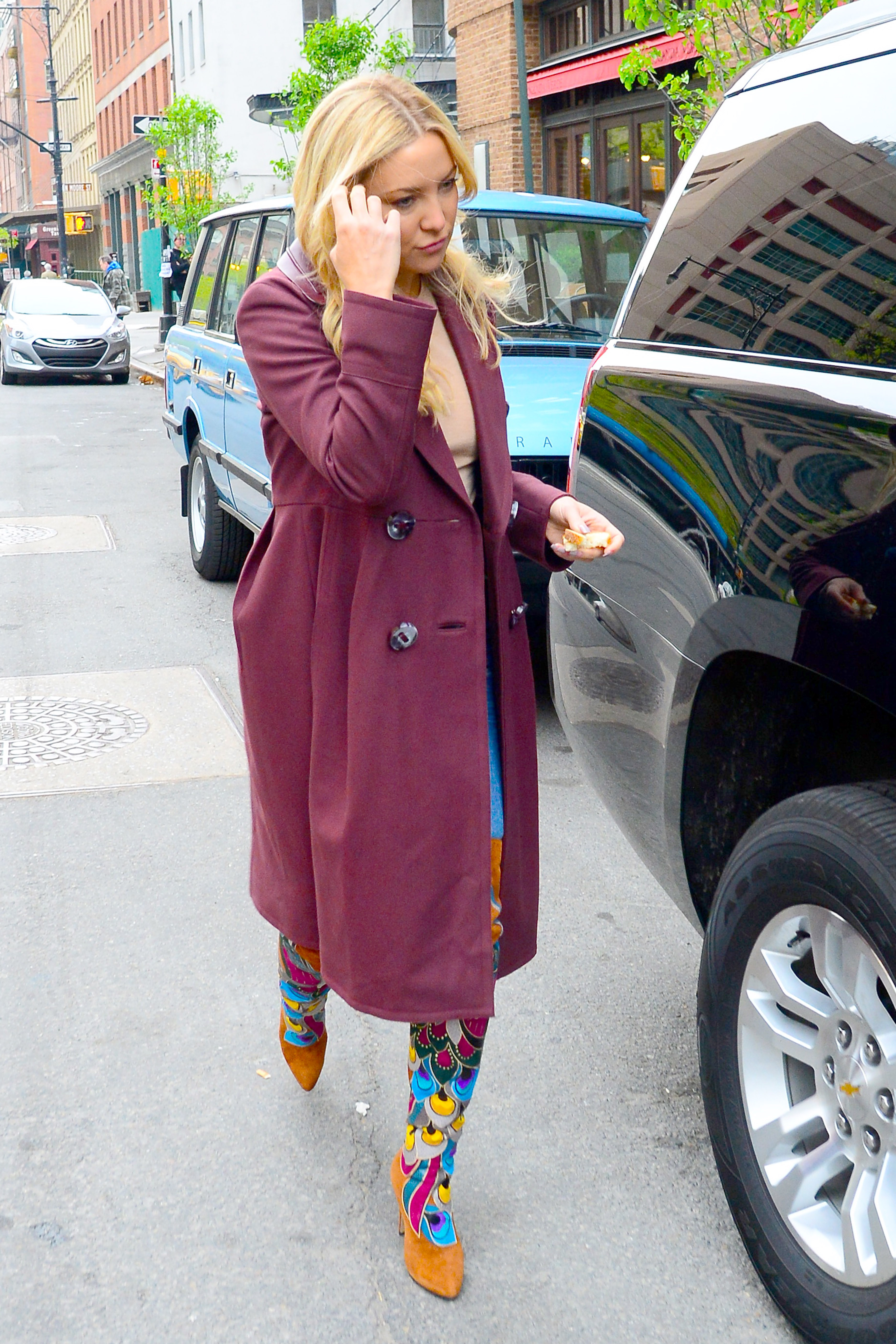 Earlier in the day, the blonde beauty had arrived in a similar pair of canary yellow flares and a black top